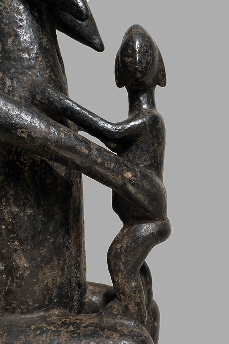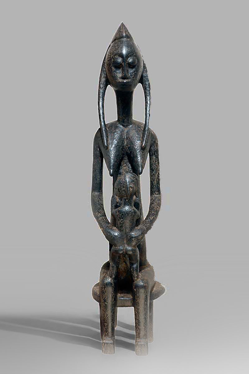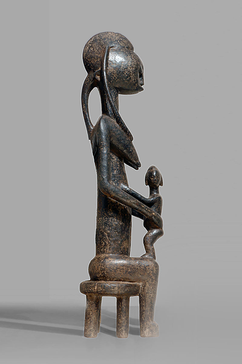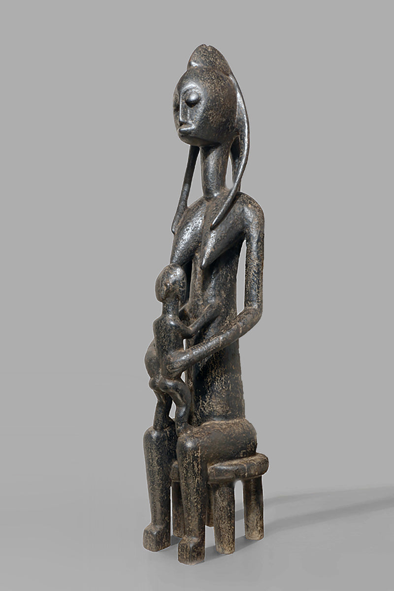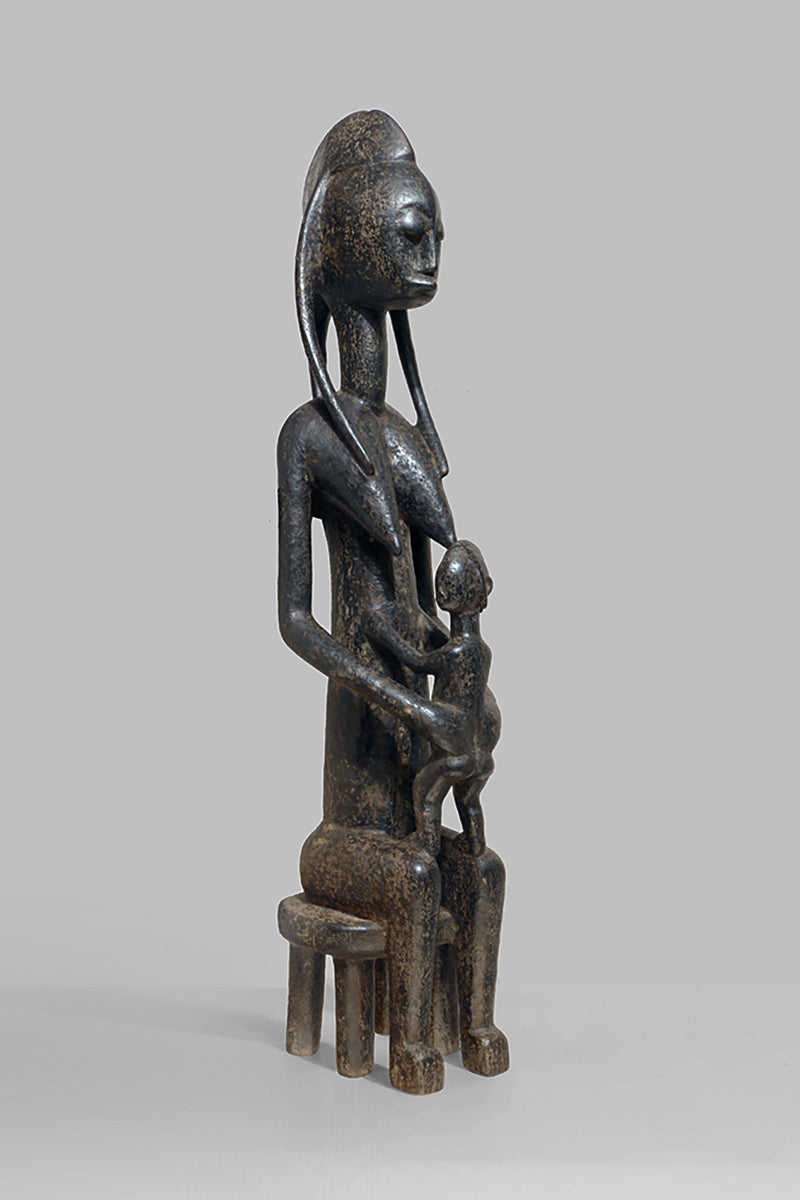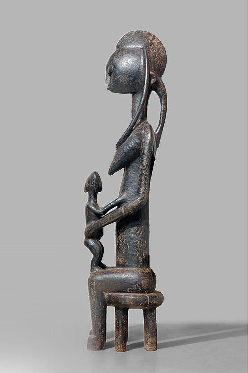 A Bamana Gwandusu, posted on a fourleg-stool, holding a child close to the abdomen, blackened patina with traces of oxidised karité.