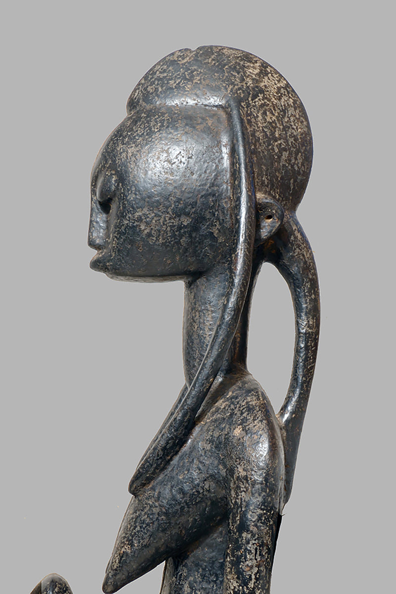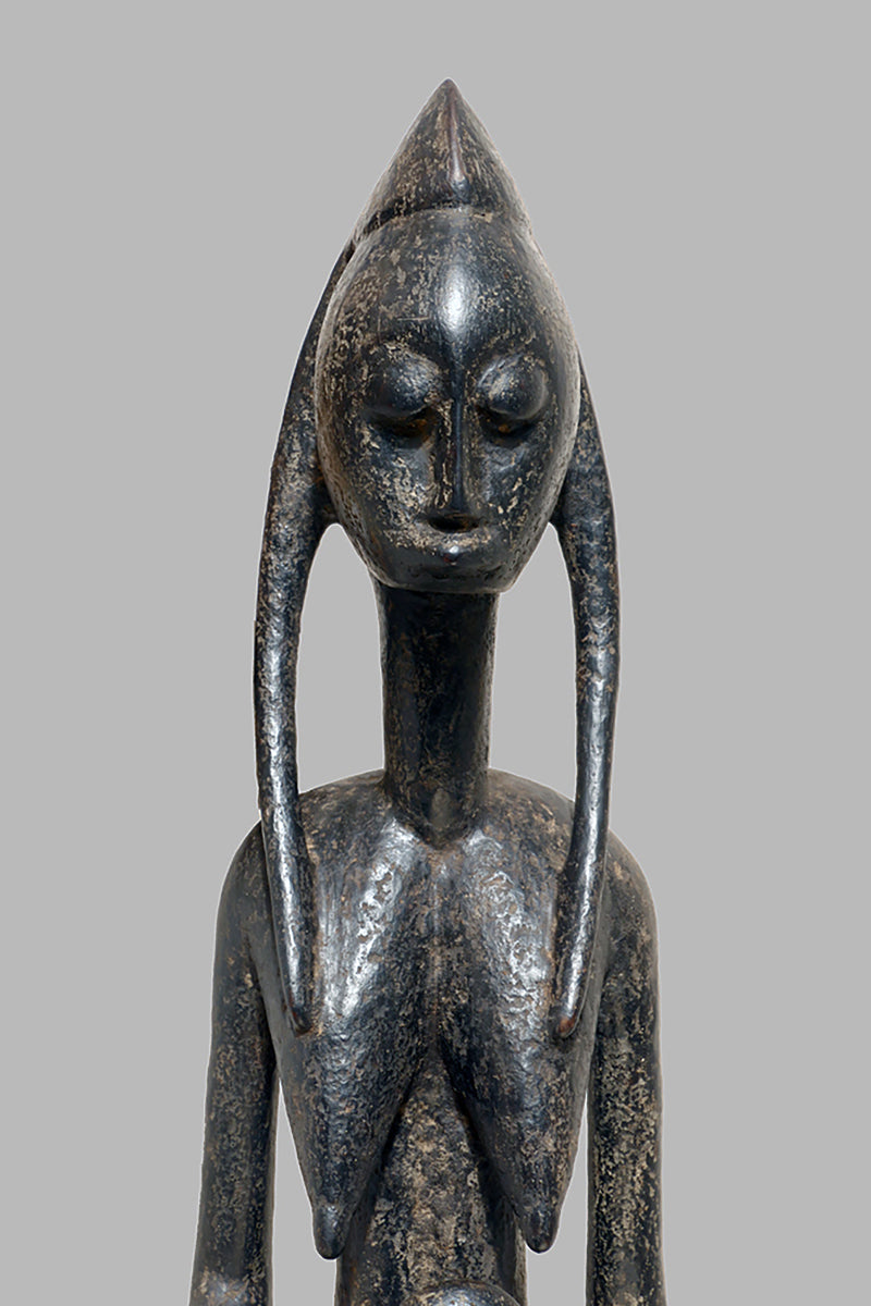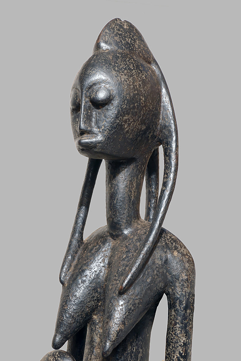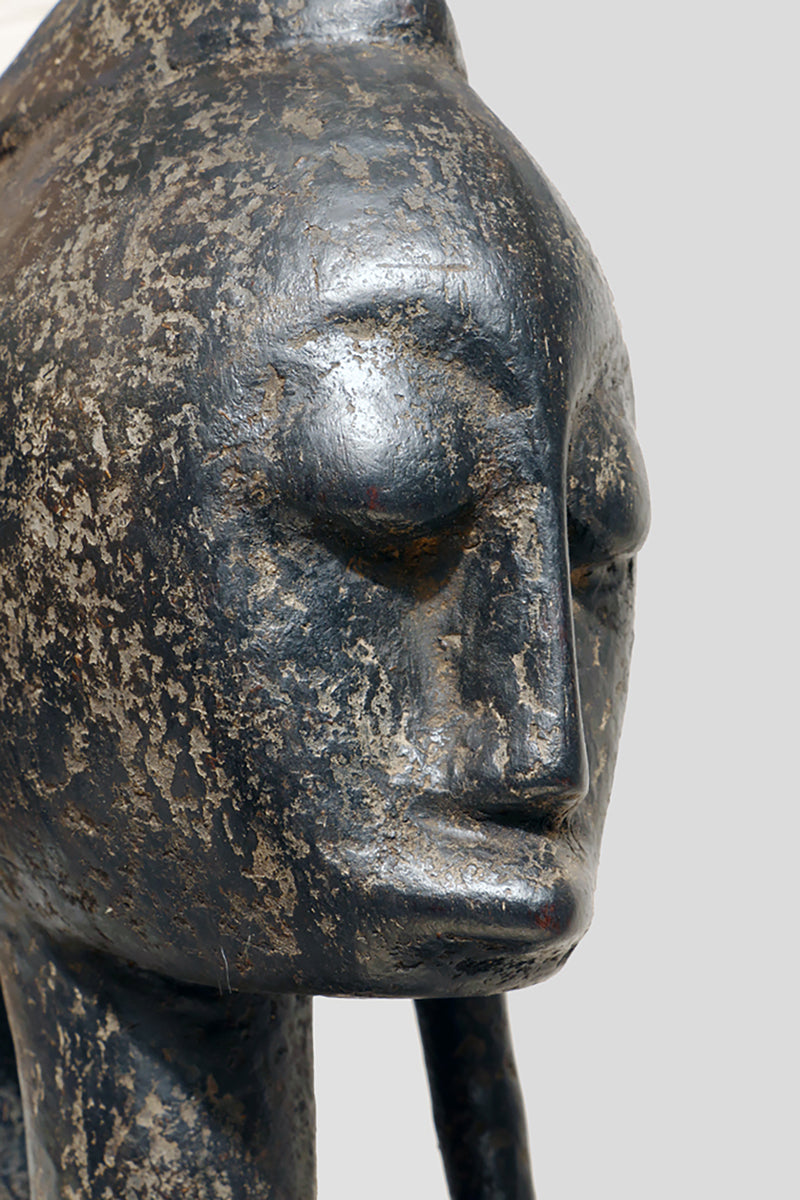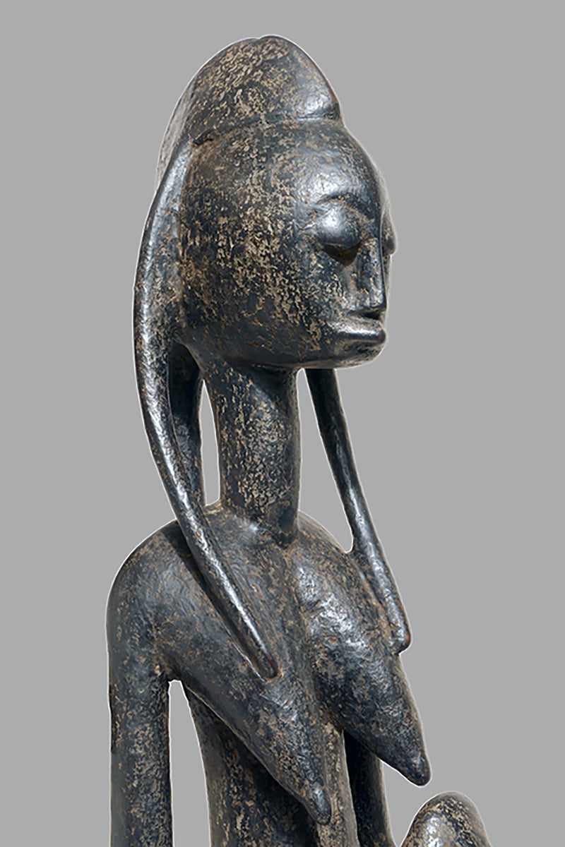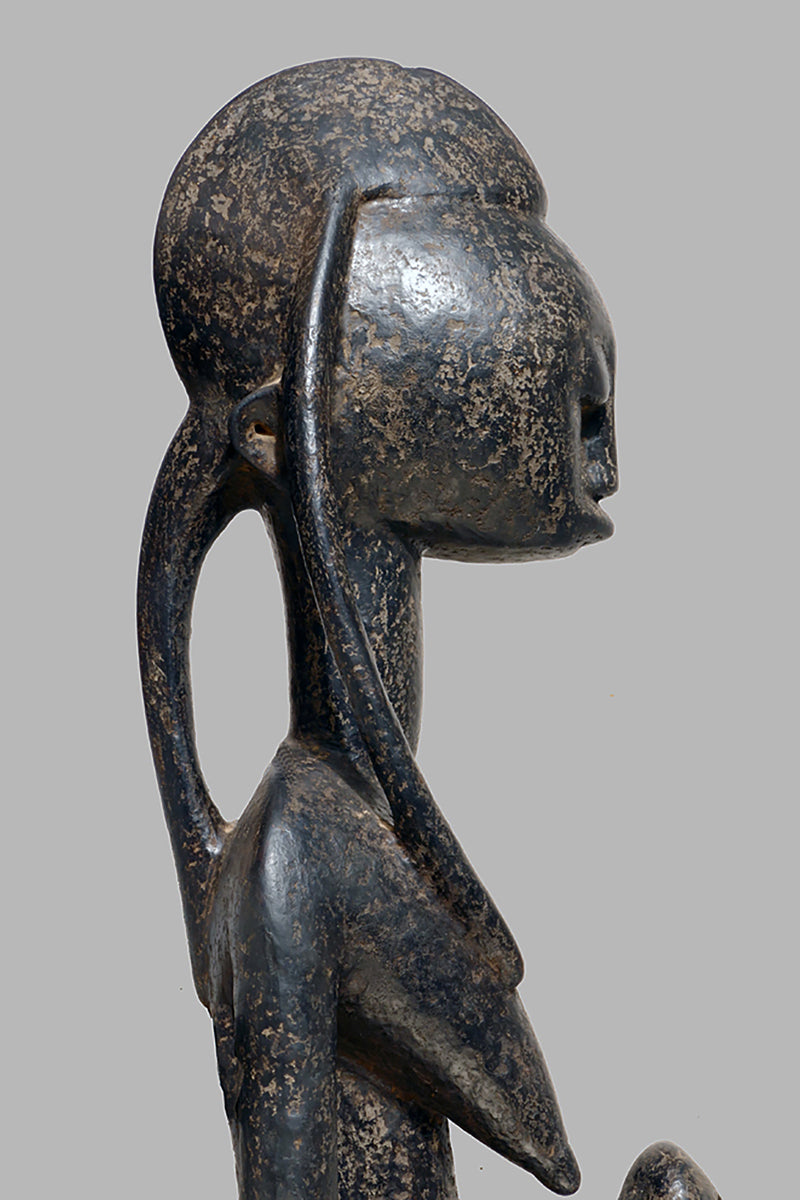 When Bamana sculptures of dignified men and women first appeared in Westren collections in the 1950sthe female figures were to as "Queens". They all came from the villages near Dioila and Bougouni in the region of the Baoule river before it joins the Bagoe to form the Bami, a tributary of the Niger river, but none arrived with any documentation (Kate Ezra, A Human Ideal in African Art. Bamana Figurative Sculpture (New York, 1986) Youssouf Tata Cissé ( Arts d´ Afrique, Paris 2000, p.15) told us, that the female figures represent the goddess of water and the primordial mother and that the groups were displayed every seven years in relevant ceremonies. In the years after 1950 till the beginning of the 1960s most of the Bamana Jo sculptures were stolen from the fields. It is more or less unknown how the cult of the Jo/Gwan society is practicing their knowledge nowdays. The last important fieldworks in the Bamana Region are done by Kate Ezra and Sarah Brett-Smith more than twenty years ago. A wellknown Parisian Tribal Art dealer told me, that the Jo statuettes, which were placed on the fields, and which have a special weathered patina, doesn´t exist anymore in the Bamana region. Only the statues, which were protected in the huts of the villages have "survived". They have a different patina, they are extremly rare but sometimes it is possible to find one of this authentic big Bamana-statues.