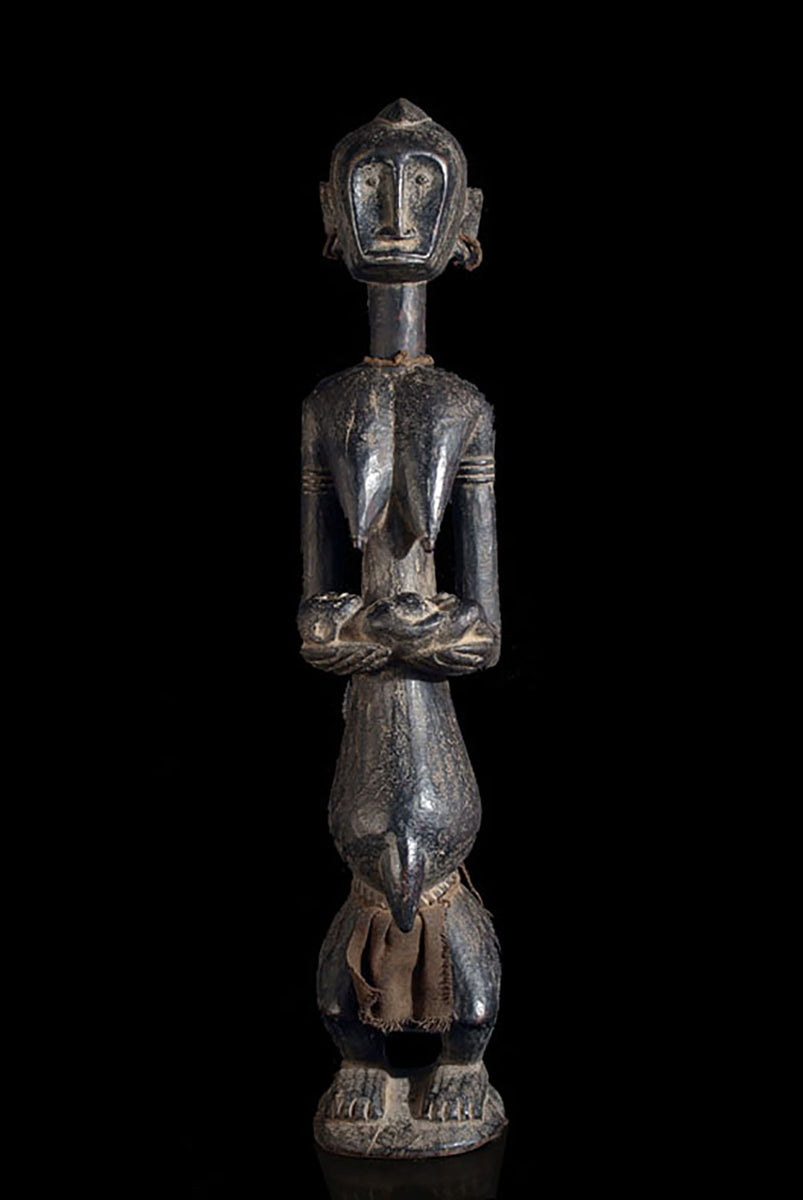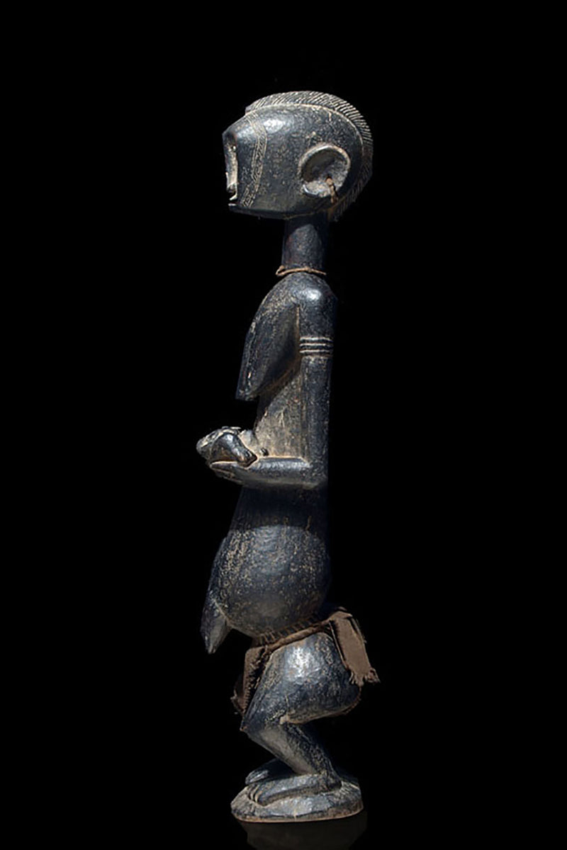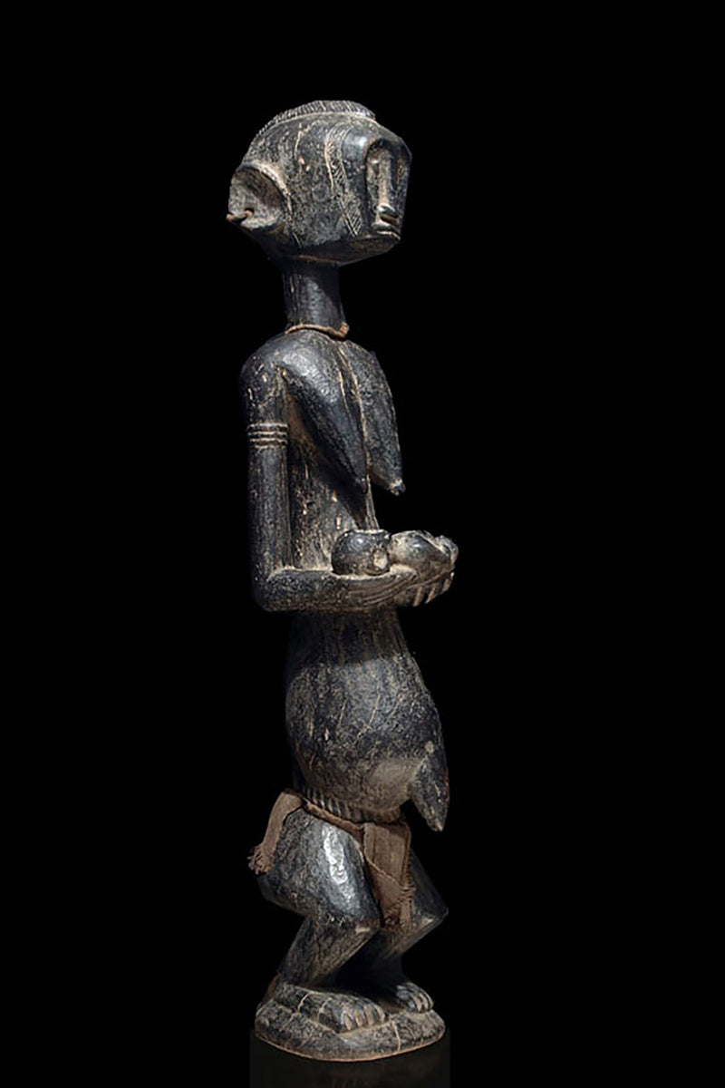 The Baniko-style maternity figures are typically carved from wood and present a seated woman holding an infant, either cradled in her arms or nursing at her breast. What sets the Baniko style apart is its stylistic restraint and geometric elegance. The figures exhibit long, cylindrical torsos, subtly stylized facial features, and a quiet solemnity that conveys dignity and inner strength rather than overt emotion. The breasts and navel are often emphasized, symbolic of nourishment and life-giving power.