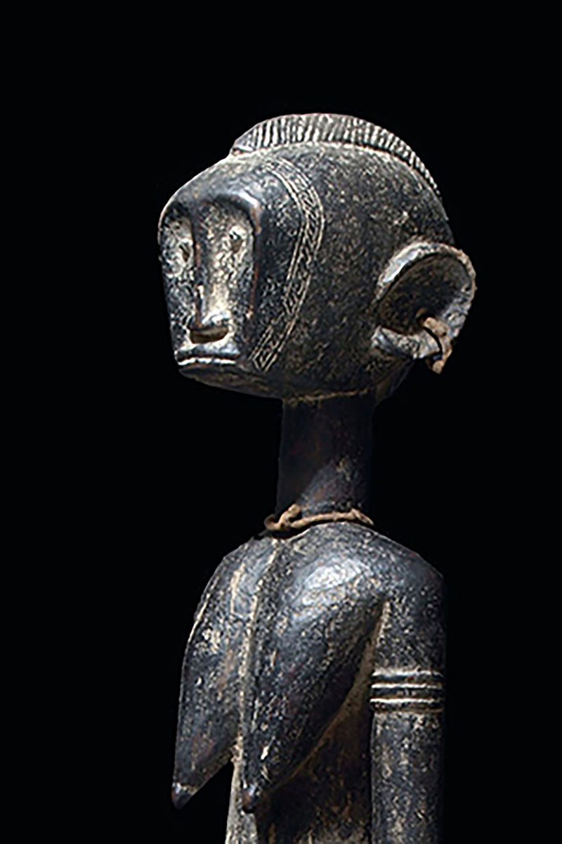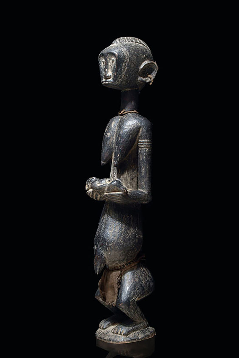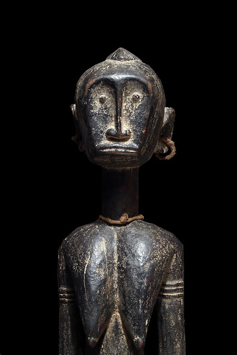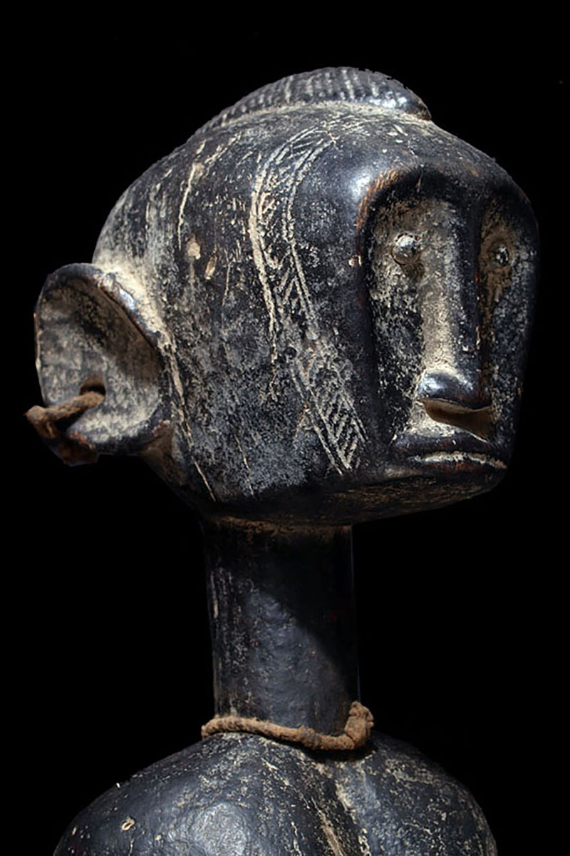 The Baniko-style maternity figures are typically carved from wood and present a seated woman holding an infant, either cradled in her arms or nursing at her breast. What sets the Baniko style apart is its stylistic restraint and geometric elegance. The figures exhibit long, cylindrical torsos, subtly stylized facial features, and a quiet solemnity that conveys dignity and inner strength rather than overt emotion. The breasts and navel are often emphasized, symbolic of nourishment and life-giving power.