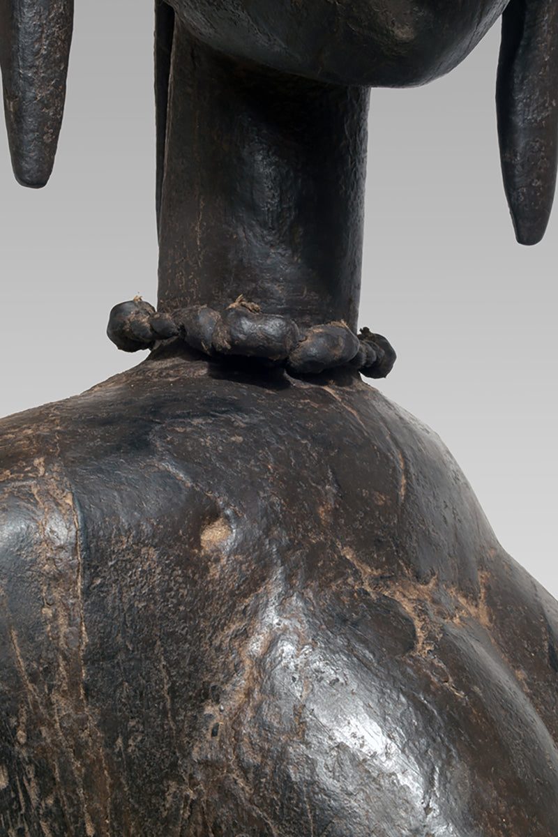 The Bamana Gwandusu sculptures stand as profound embodiments of cultural ideals and ritual significance within Bamana society. These figures are not merely artistic expressions but integral components of ceremonial life, particularly in fertility rites. Enshrined in village shrines, the Gwandusu are ritually washed, oiled, and adorned prior to public display, underscoring their sacred function and the community’s reverence for maternal power.^1 Such ritual preparation highlights the intimate connection between material culture and spiritual practice, where the physical treatment of the figure parallels the nurturing roles attributed to motherhood itself.