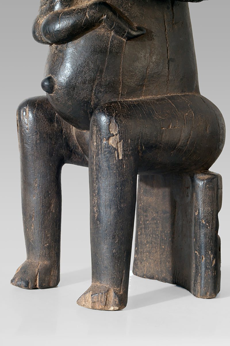 A Bamana Maternity figure, Mali, seated on a stool, carrying her infant close to her abdomen. Dark wood, glossy patina; signs of ritual use and age.