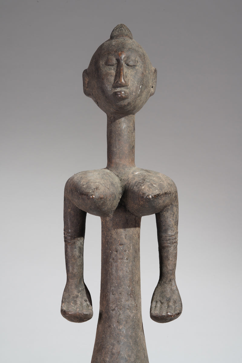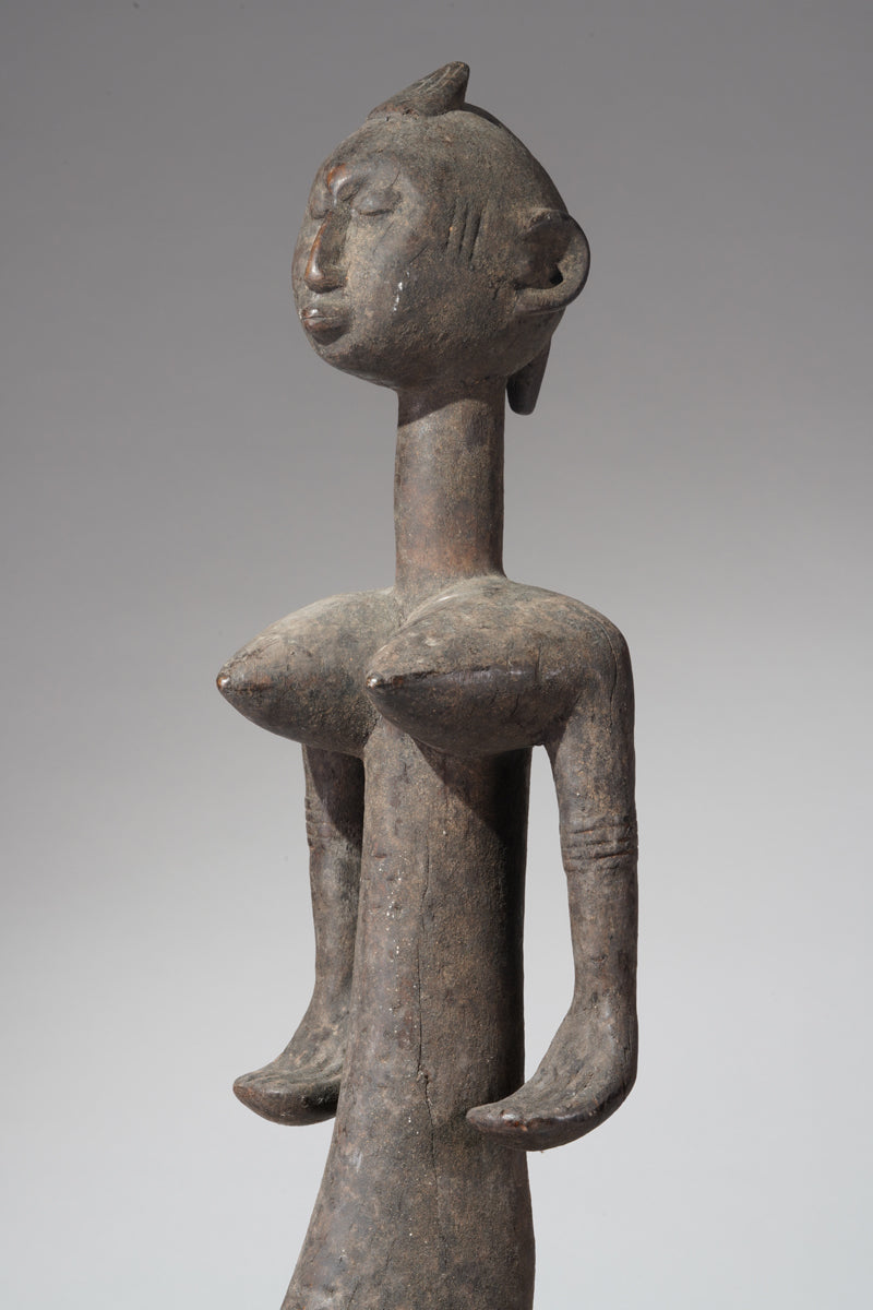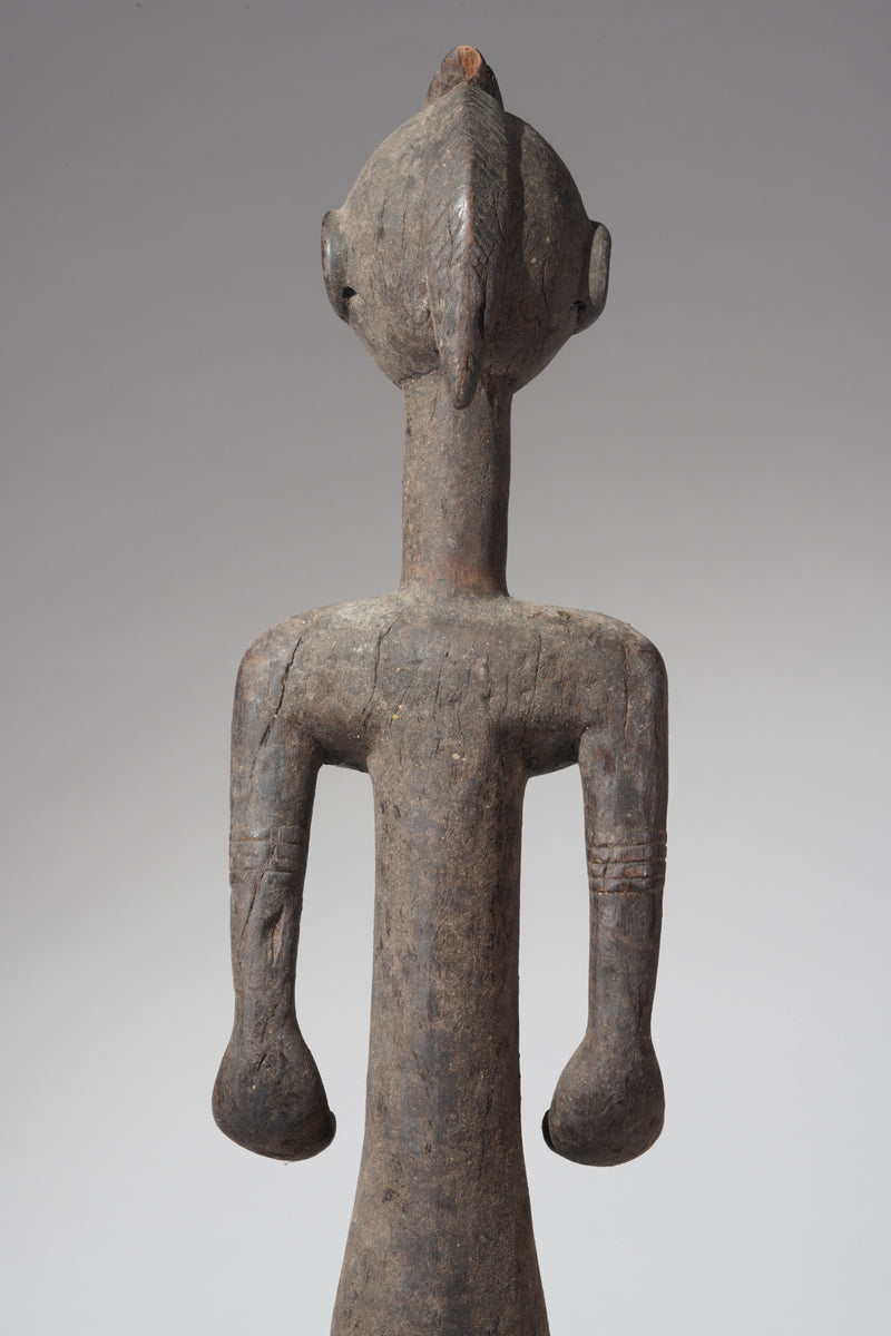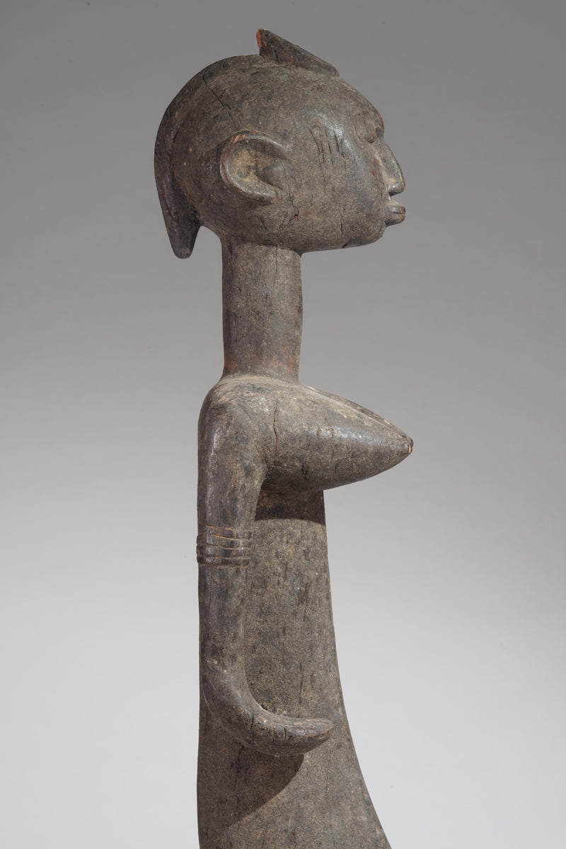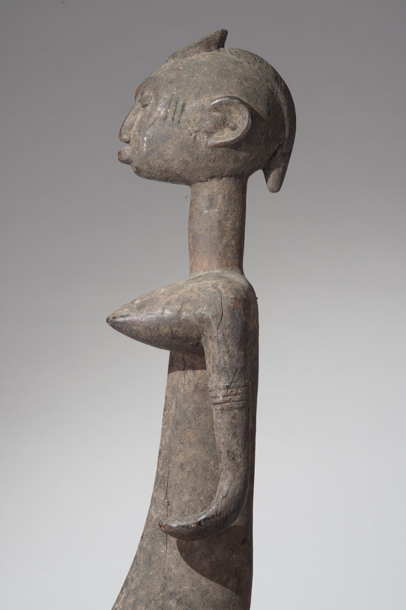 Collected in the Tamani region, Dodougoubani village, 90 km from Segou, on the other side of the Niger. The patina of this sculpture was created by the same procedue Kate Ezra is describing in the exhibition catalogue of the National Museum of African Art "A Human Ideal in African Art", Washington 1986, "The respective leaders of Jo and Gwan - the initiation societies of the Bougouni area, where Kate Ezra made her researches - remove the sculptures from the house and arrange them in a row in front of it. Women bring hot water and soap, and the sculptures are washed and rubbed with oil.