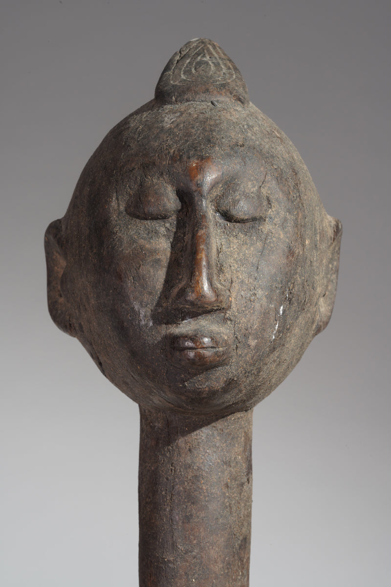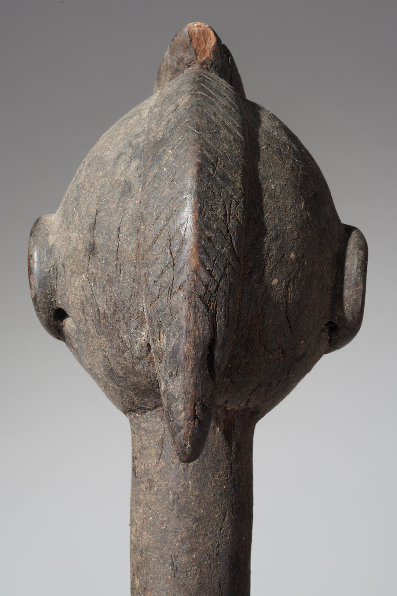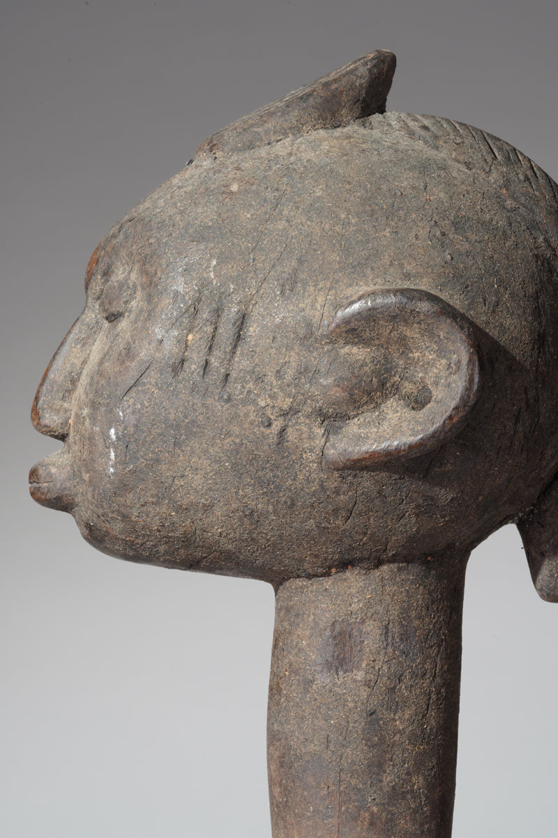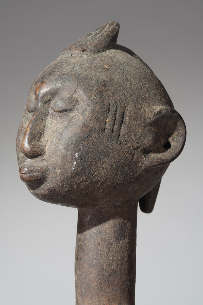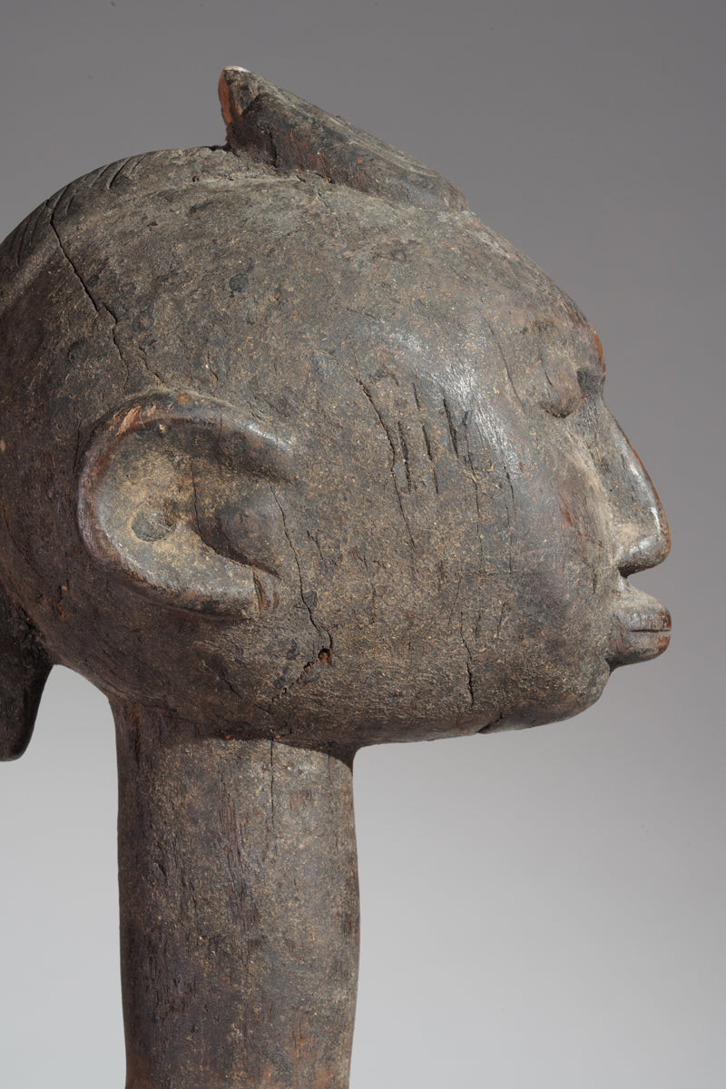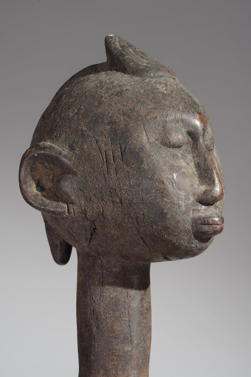 Collected in the Tamani region, Dodougoubani village, 90 km from Segou, on the other side of the Niger. The patina of this sculpture was created by the same procedue Kate Ezra is describing in the exhibition catalogue of the National Museum of African Art "A Human Ideal in African Art", Washington 1986, "The respective leaders of Jo and Gwan - the initiation societies of the Bougouni area, where Kate Ezra made her researches - remove the sculptures from the house and arrange them in a row in front of it. Women bring hot water and soap, and the sculptures are washed and rubbed with oil.