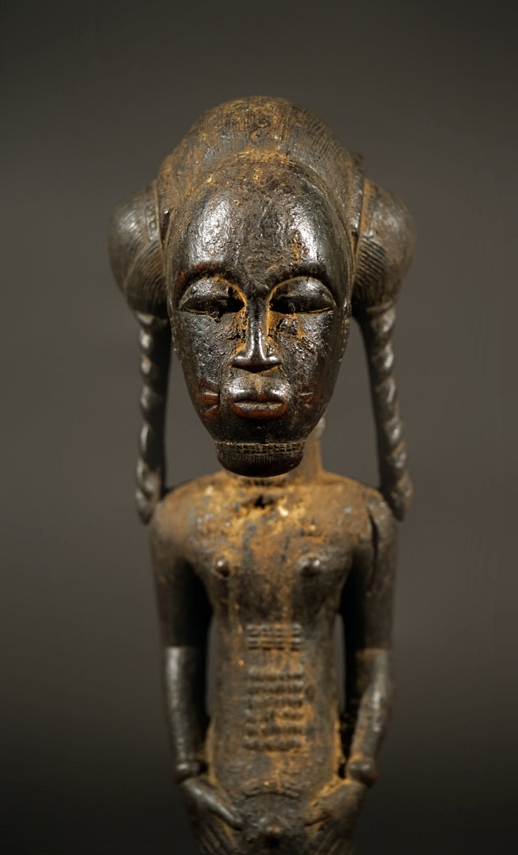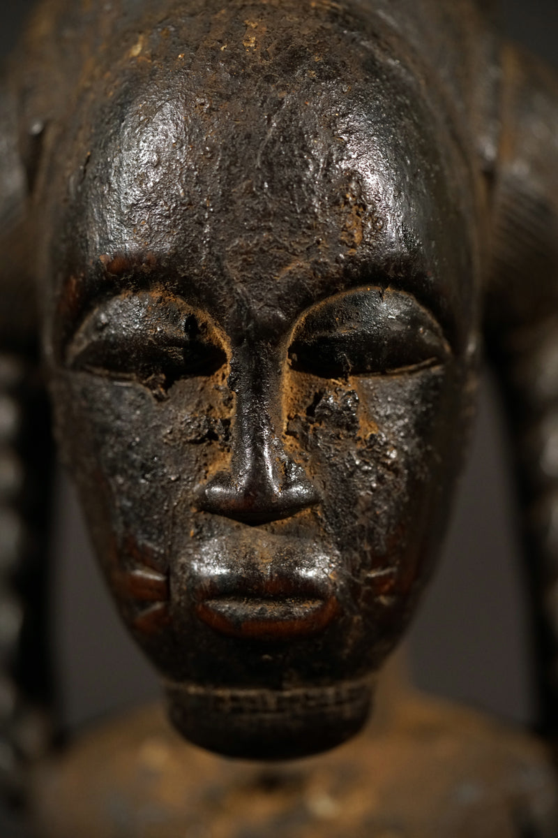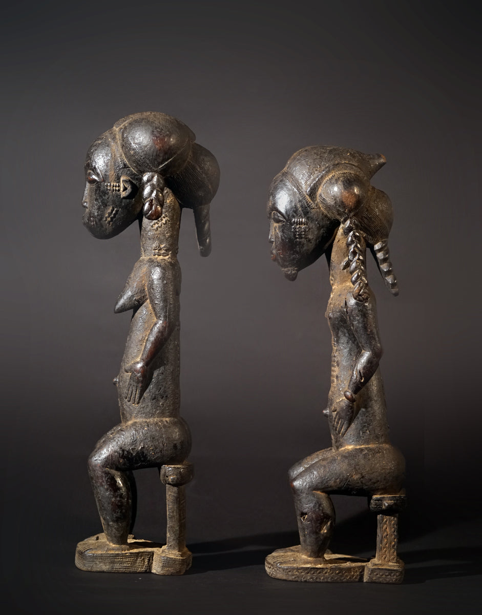 A Baule couple, Ivory Coast, posted on one leg stools, the shortened legs ending up in prominent buttocks, the arms carved close to the body with hands touching the abdomen close to the pointed navel, a thick neck supporting large heads with domed coiffures with three pigtails at the back; encrusted patina, remnants of sacrifications, probably early 20th century.