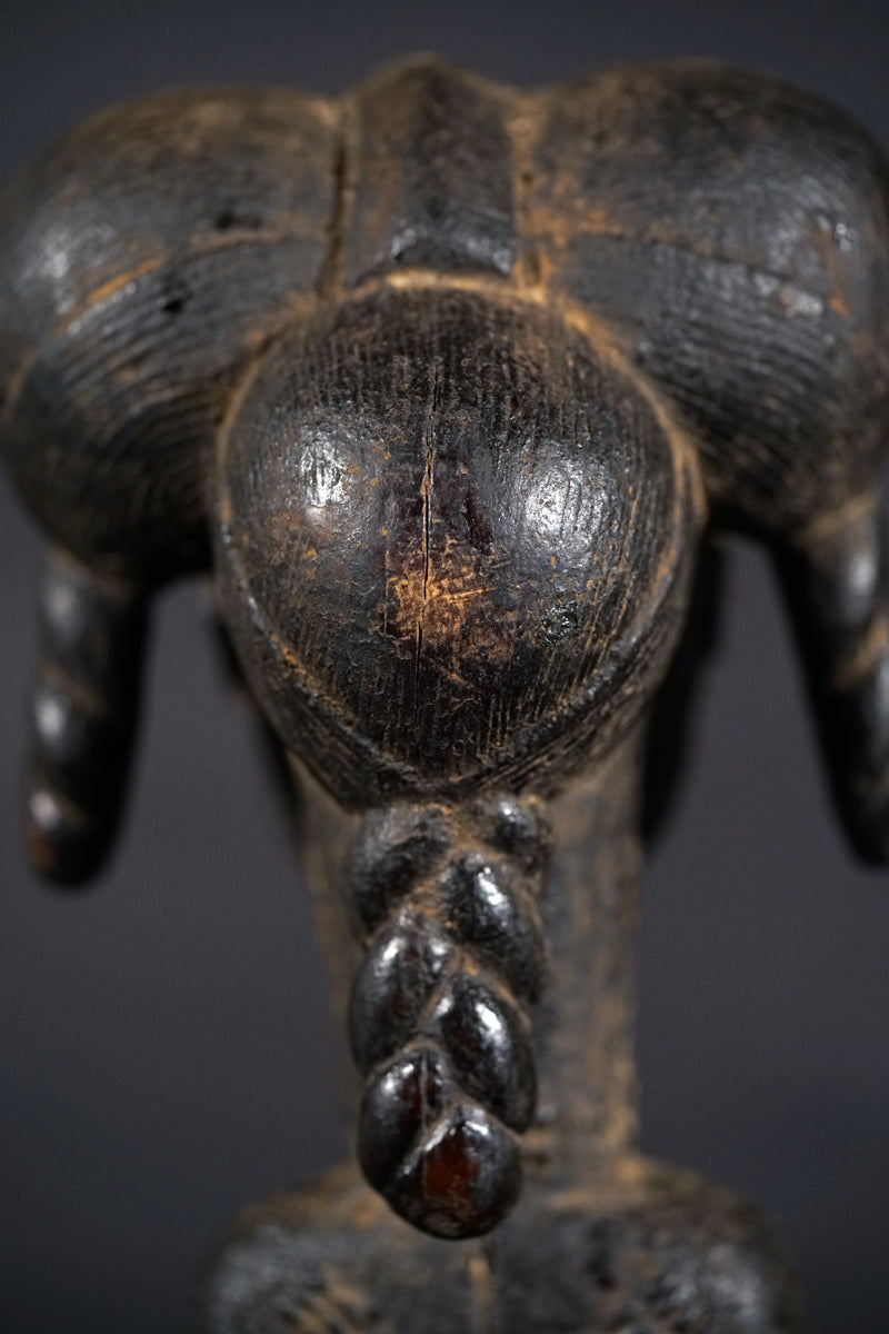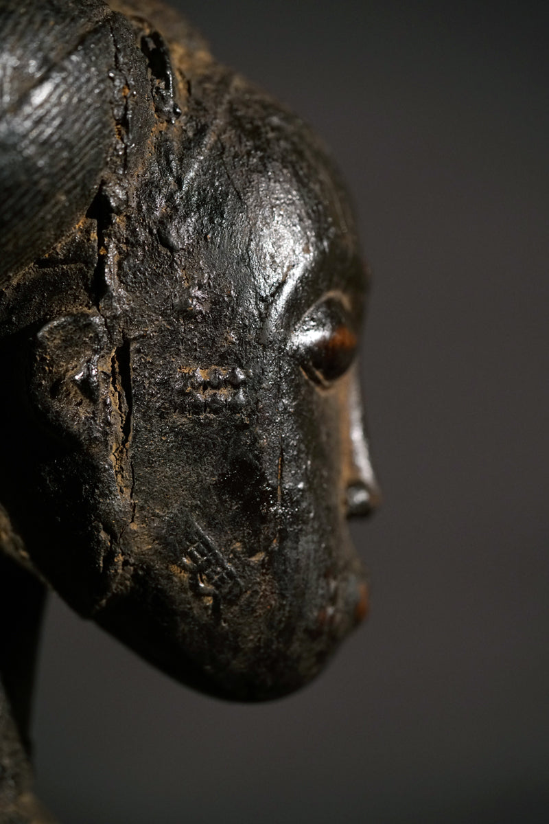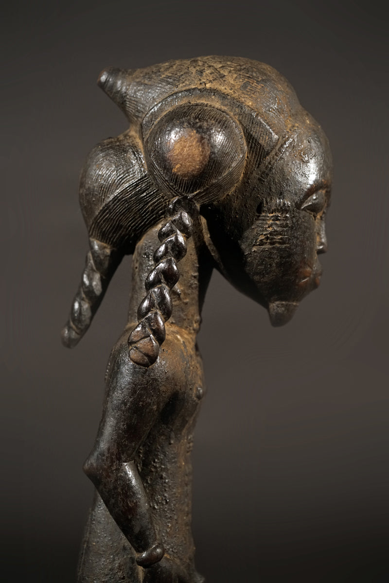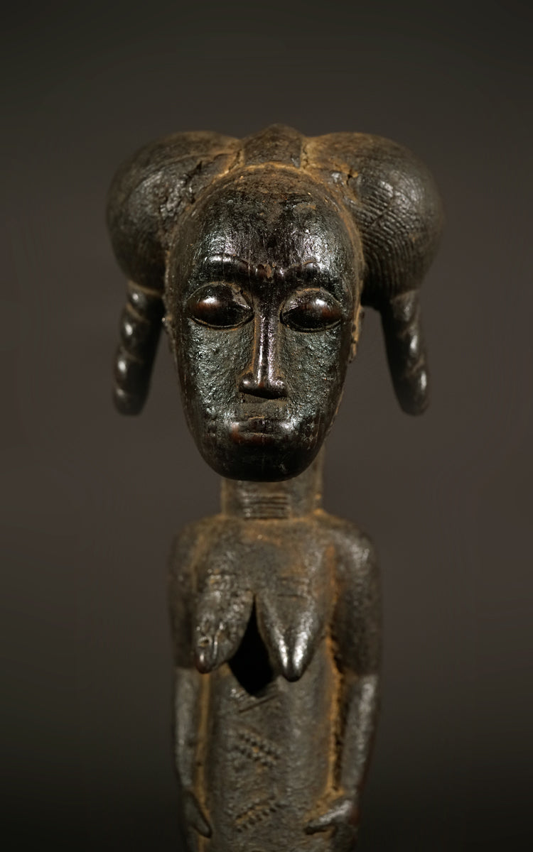A Baule couple, Ivory Coast, posted on one leg stools, the shortened legs ending up in prominent buttocks, the arms carved close to the body with hands touching the abdomen close to the pointed navel, a thick neck supporting large heads with domed coiffures with three pigtails at the back; encrusted patina, remnants of sacrifications, probably early 20th century.