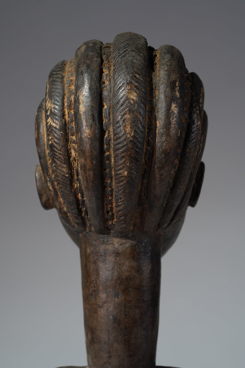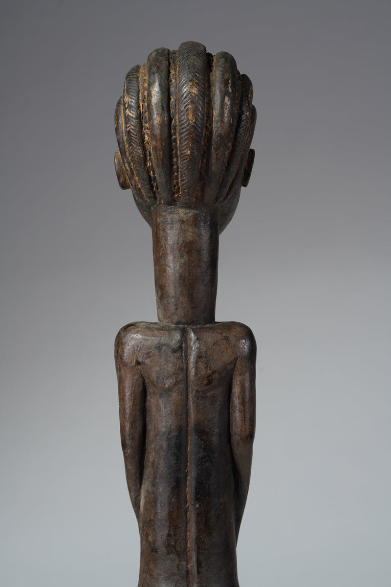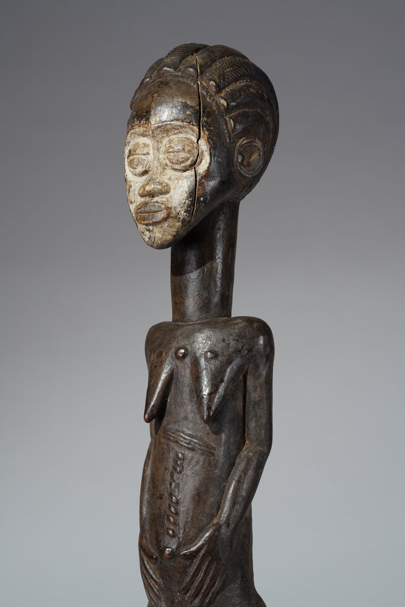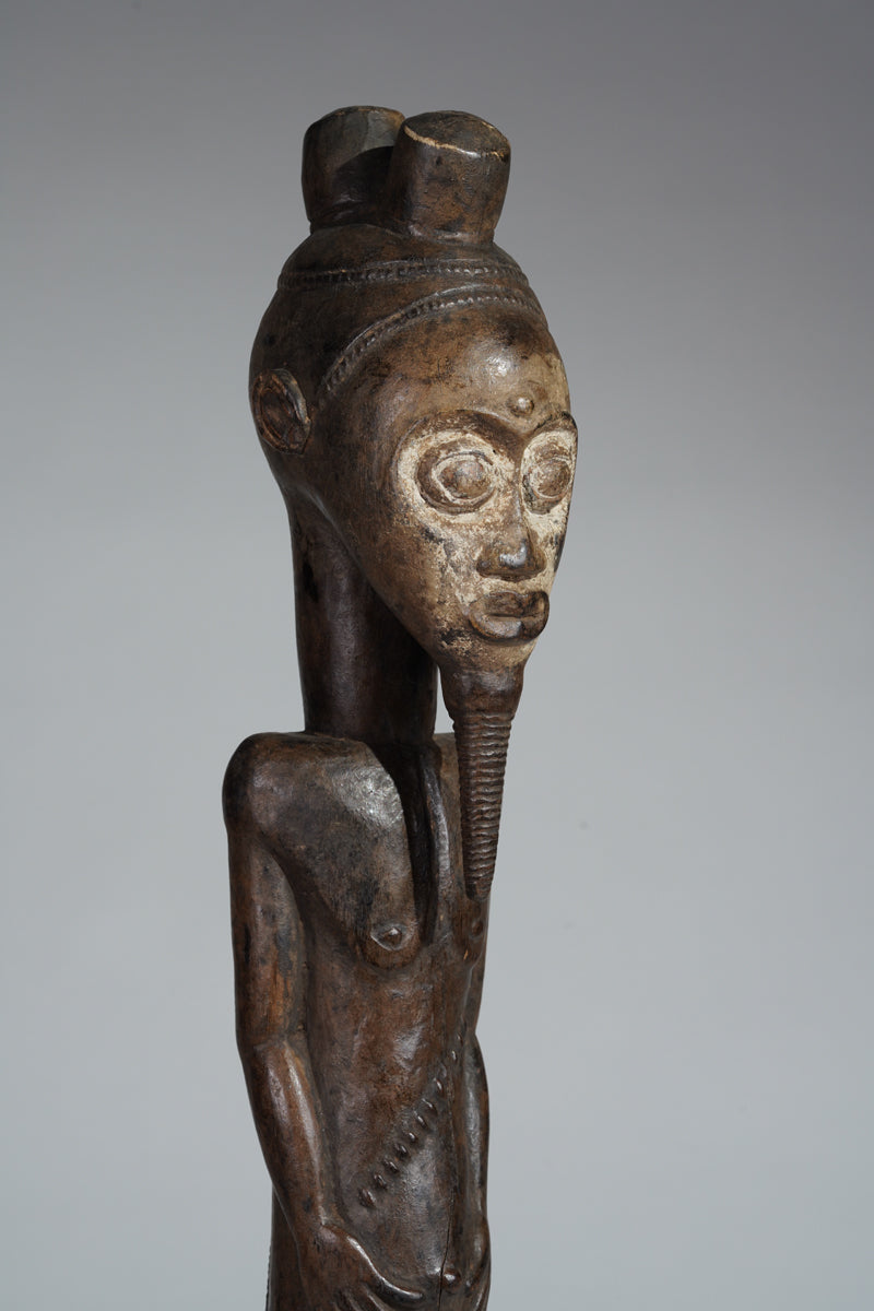 Within the practice of divination, sculptures such as this pair occupy a central position. They are not merely ancillary objects but materialized points of spiritual presence. Such figures could be inherited from senior diviners or commissioned anew, often following the instruction of a spirit revealed during trance. The act of carving thus forms part of a broader spiritual process that relativizes individual artistic authorship and situates the ultimate efficacy of the sculpture within the realm of the numinous.² The pair discussed here was explicitly created for a trance diviner and is widely regarded as one of the most accomplished works of Baule art.