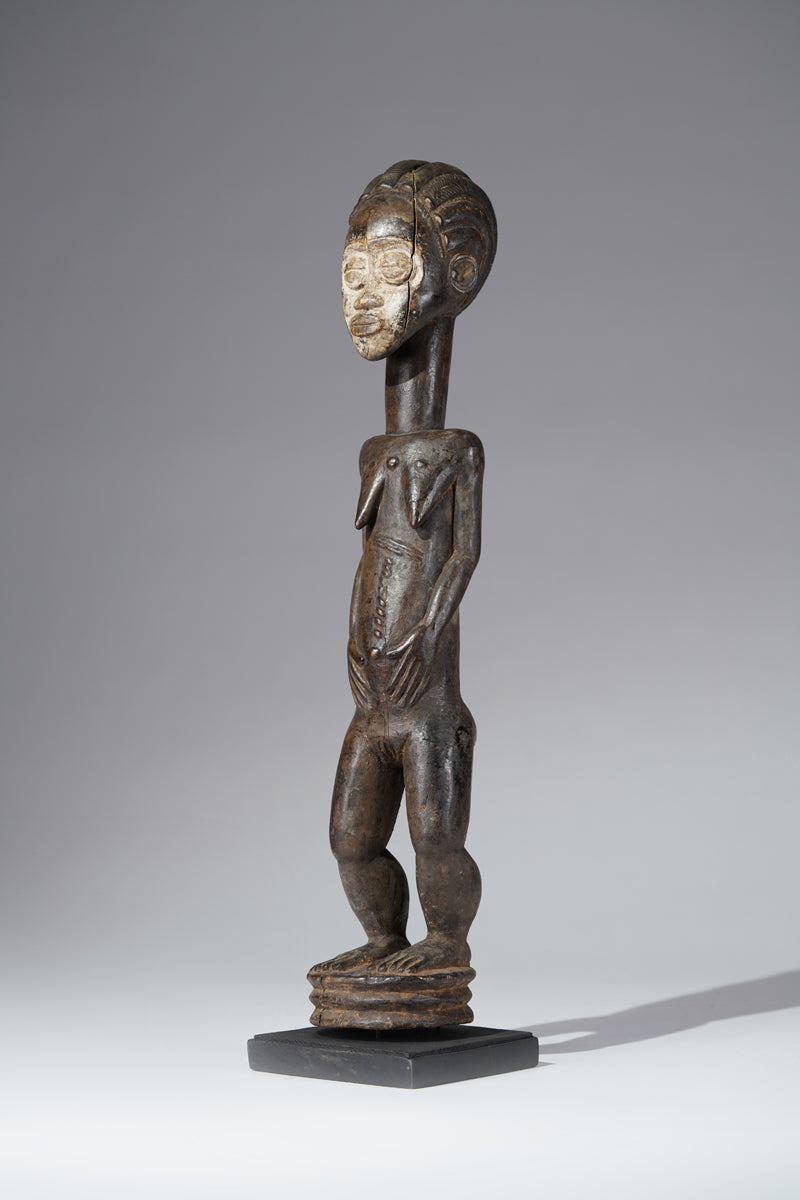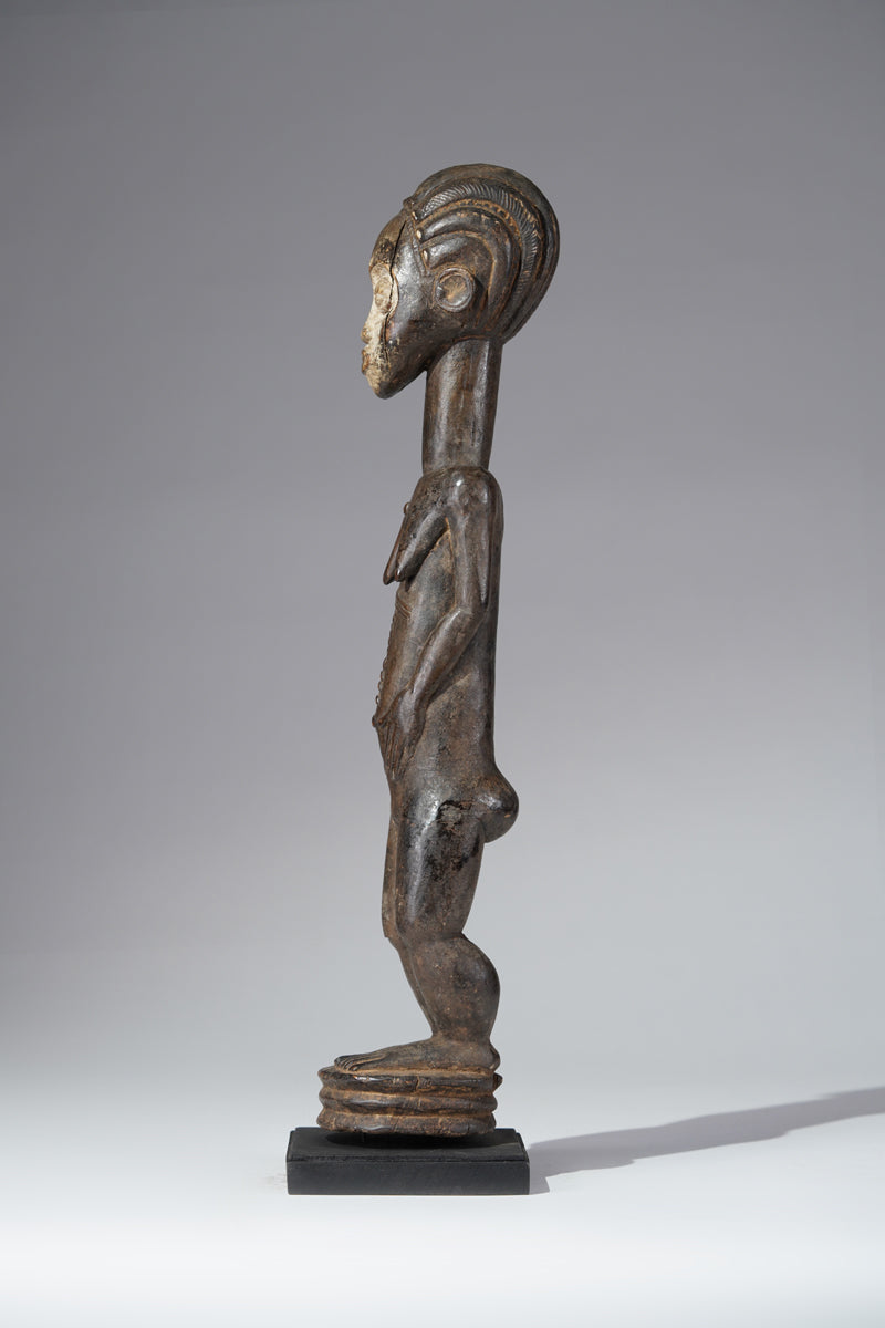 The attribution of such Baule pairs to the so-called Master of Essankro, however, remains unresolved in scholarly discourse. Earlier art historical literature repeatedly placed this and comparable sculptural pairs in close stylistic proximity to the corpus assembled under the notname Master of Essankro by Susan M. Vogel and other scholars. This association is based on formal criteria including the elegant elongation of the torso, the controlled tension of the slightly flexed legs, the compositional closure of the posture, and the subtle modeling of the facial features, all regarded as characteristic of this master’s style.