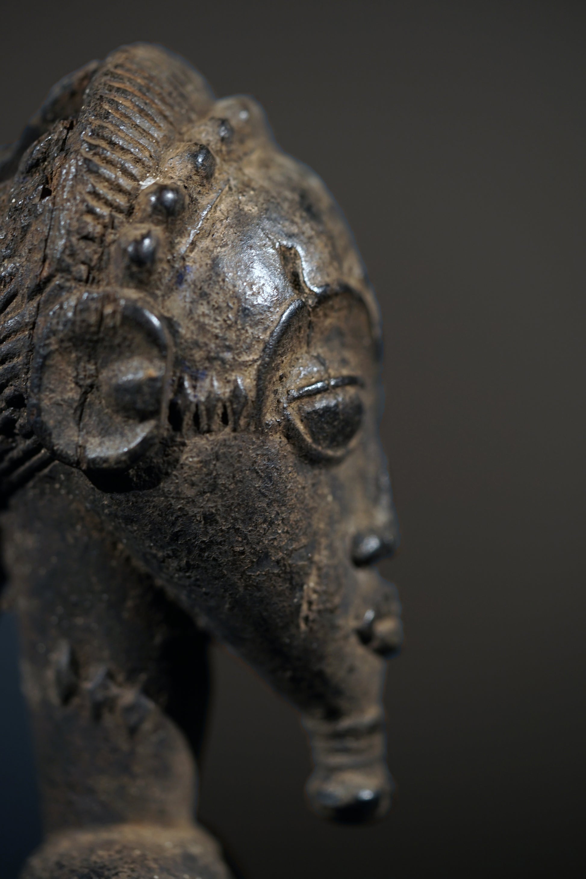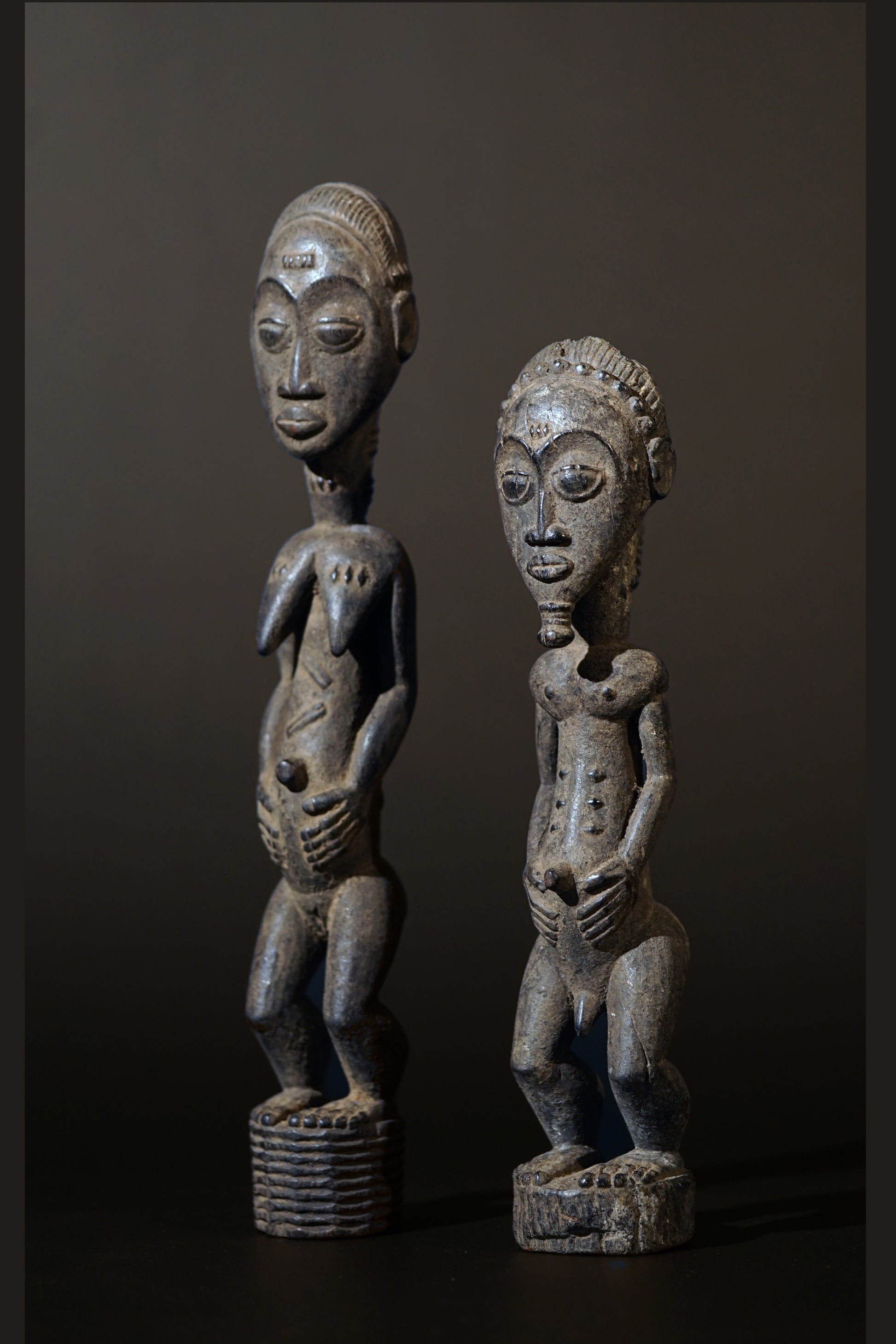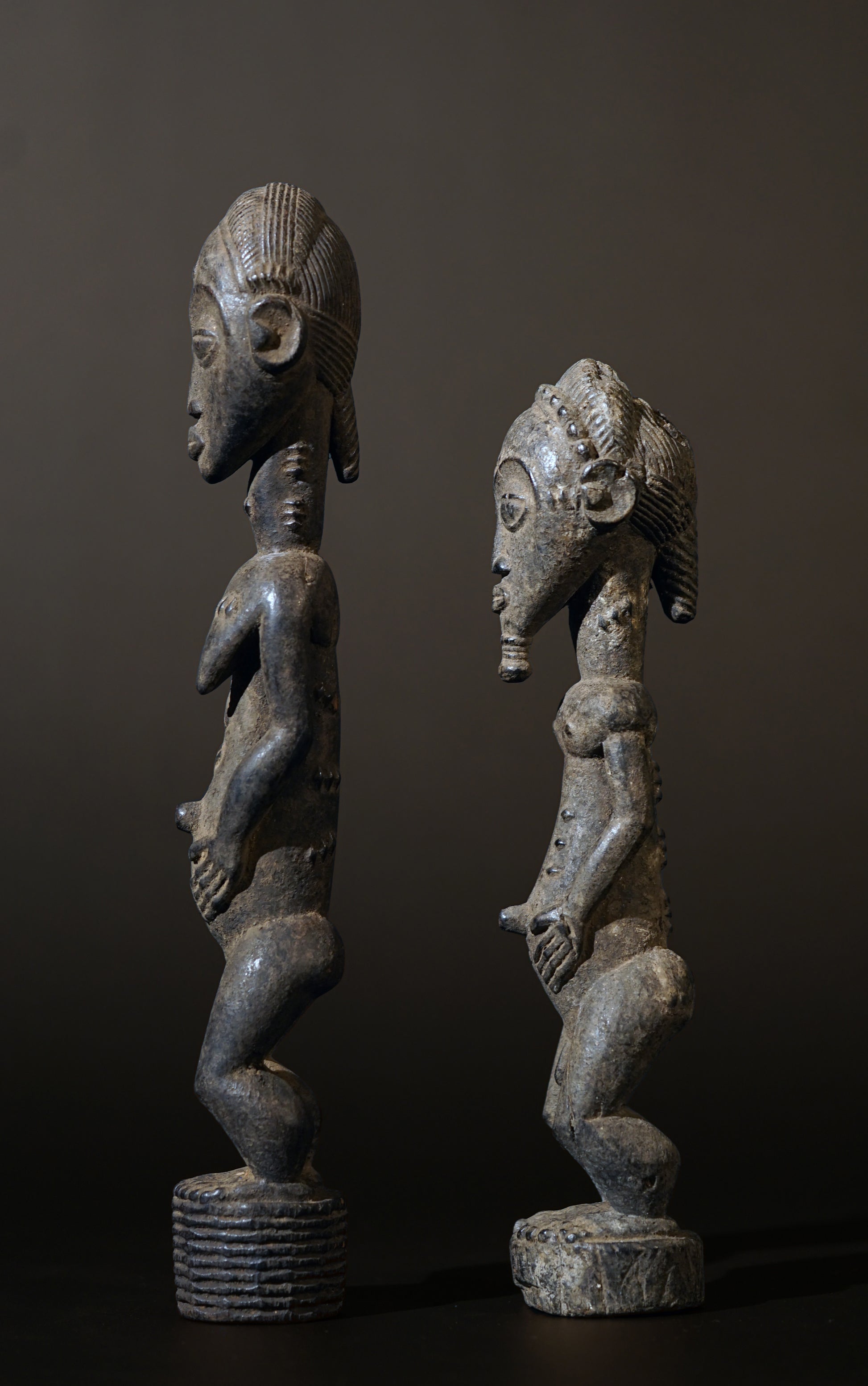 A Baule couple of the "atelier of the Masters of Sakassou", Ivory Coast, one of the most valued artists of this region, even there are also other excellent, more or less unknown sculptors of this region, which don´t have similar popularity: These two sculptures were standing on the same altar, a thick crusty patina "makes it possible to identify it with a statue of asia usu - representation dictated by the soothsayer of a "genie of the bush" in the form of a beautiful human."