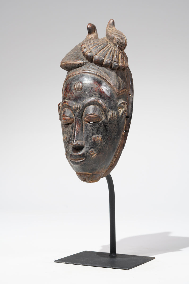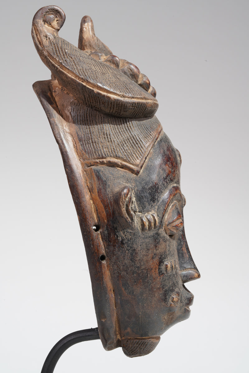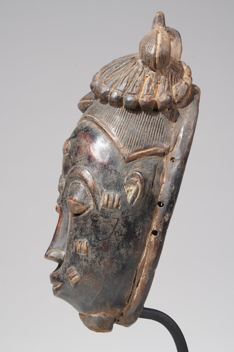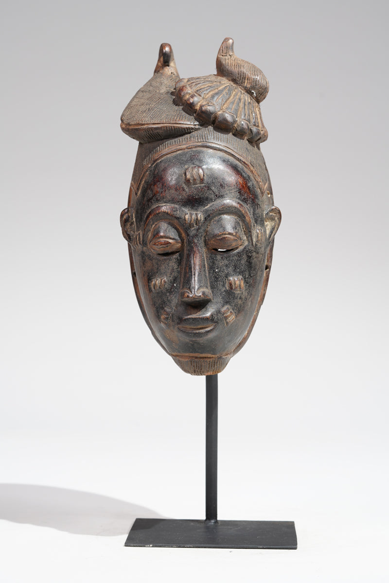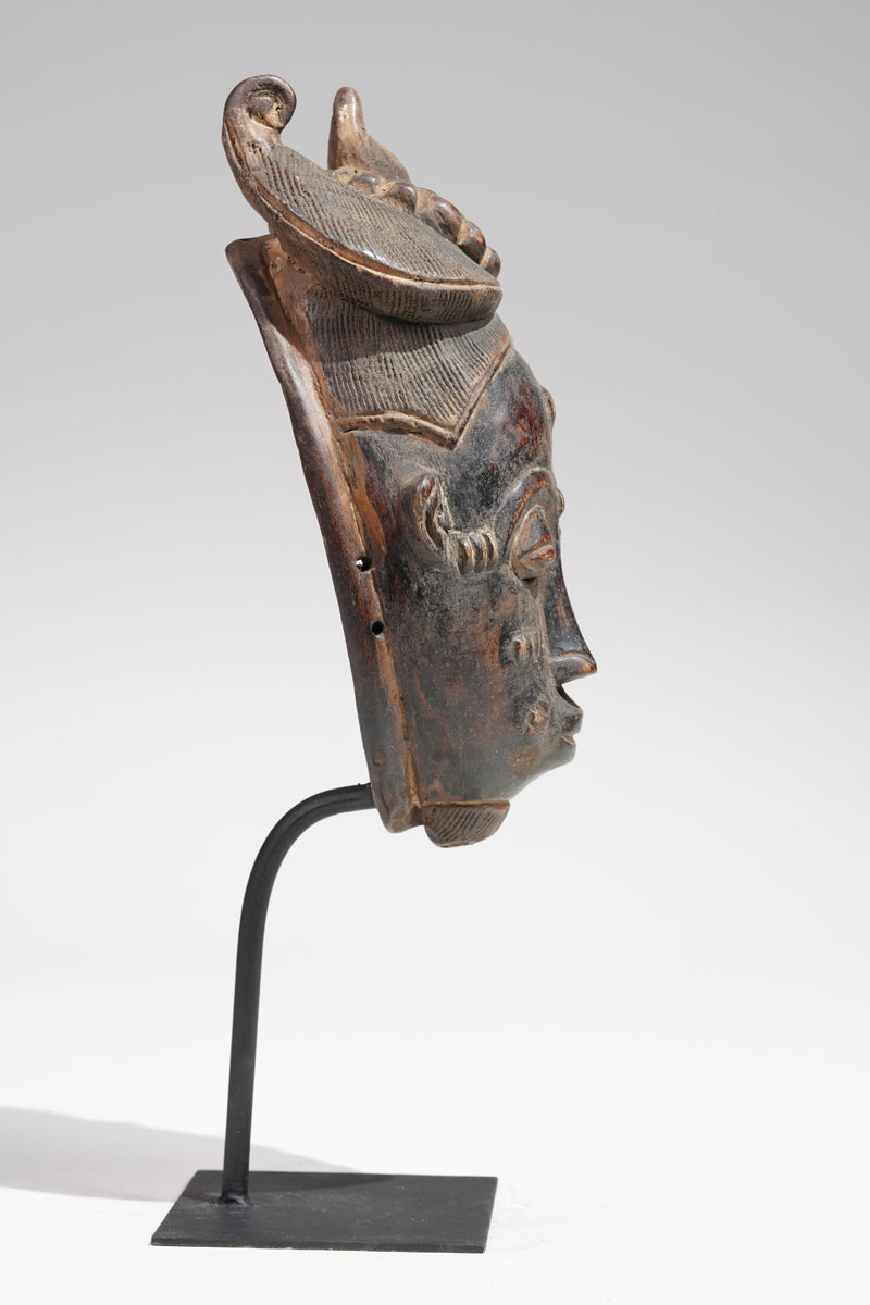 A Baule mask, collected in the Sakassou region, the region of the most skilful carvers of Ivory Coast, with an amazing, asymmetrical hairstyle, incl. stand. Certificate of origin and provenance.