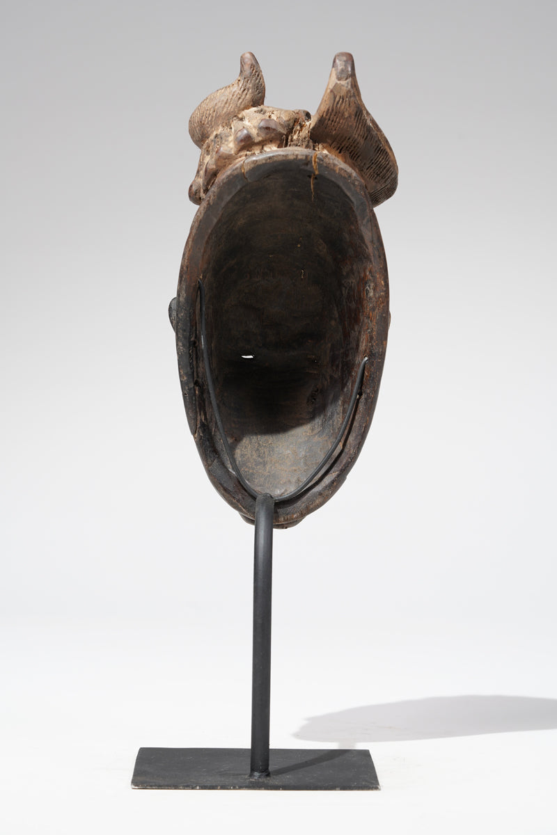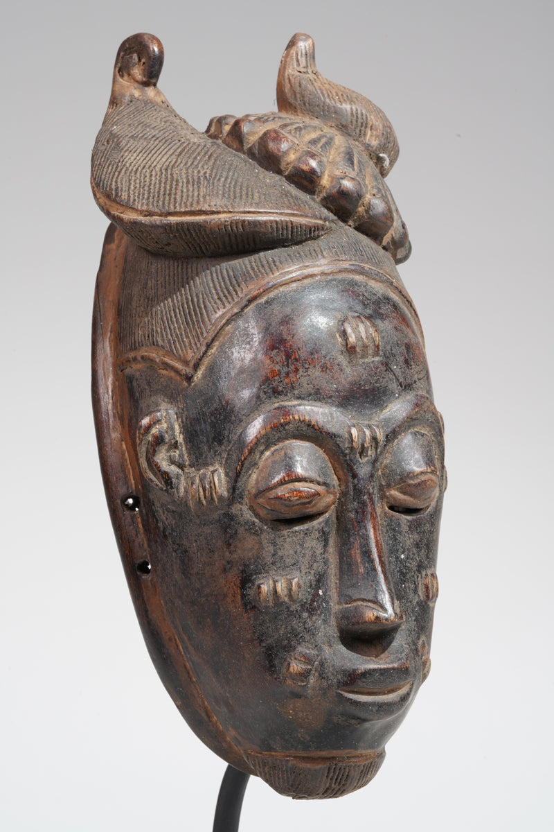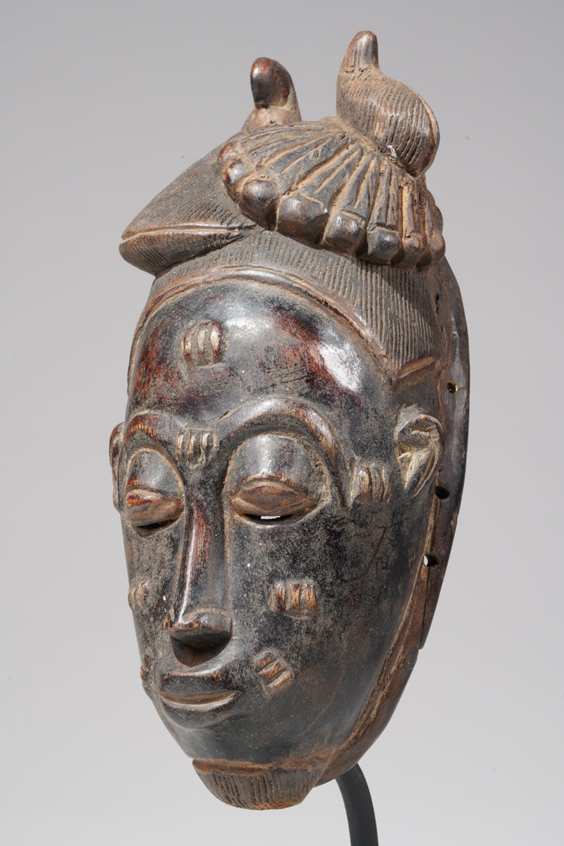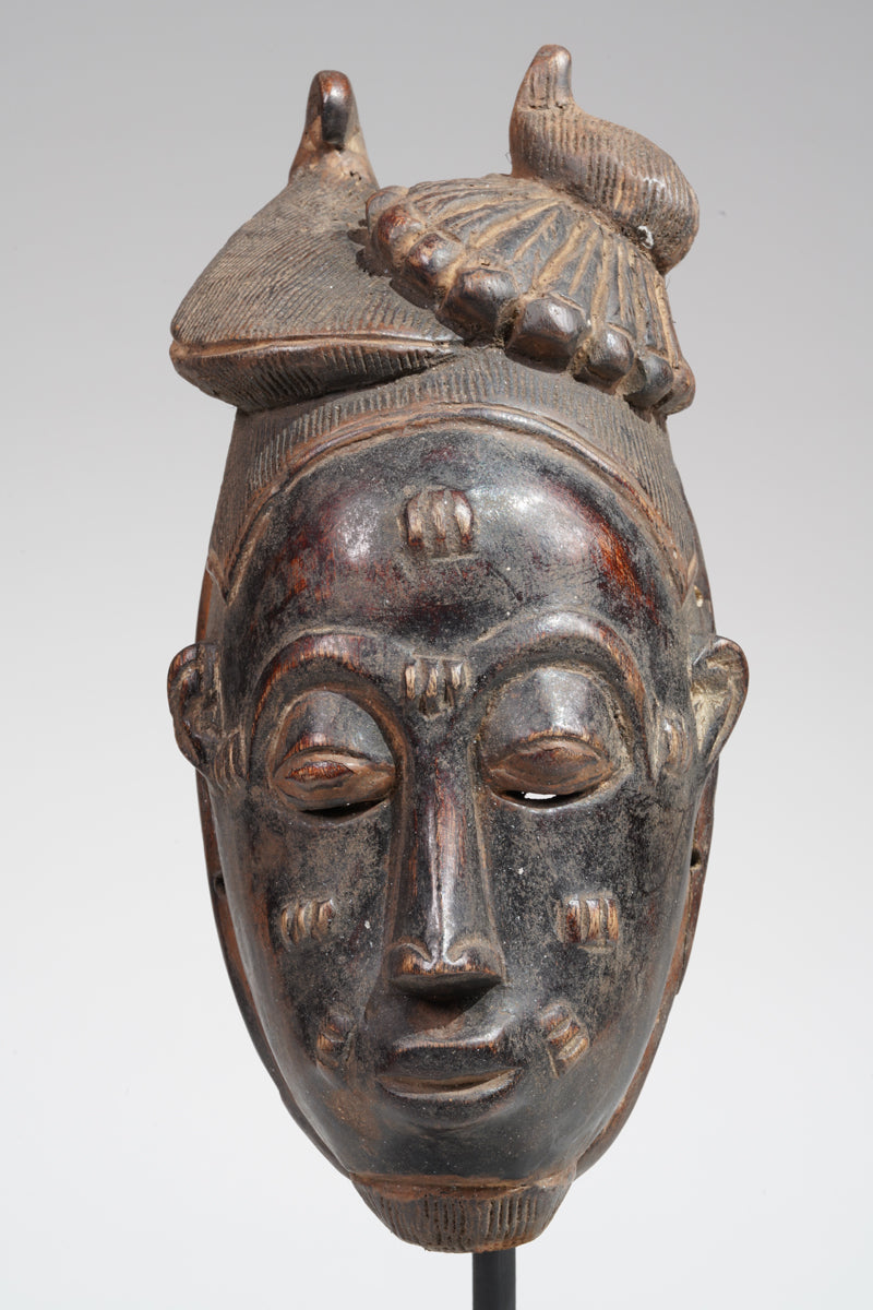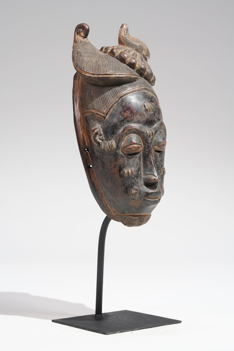 A Baule mask, collected in the Sakassou region, the region of the most skilful carvers of Ivory Coast, with an amazing, asymmetrical hairstyle, incl. stand. Certificate of origin and provenance.
