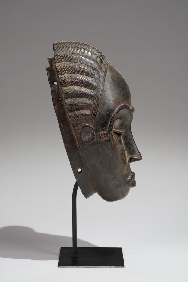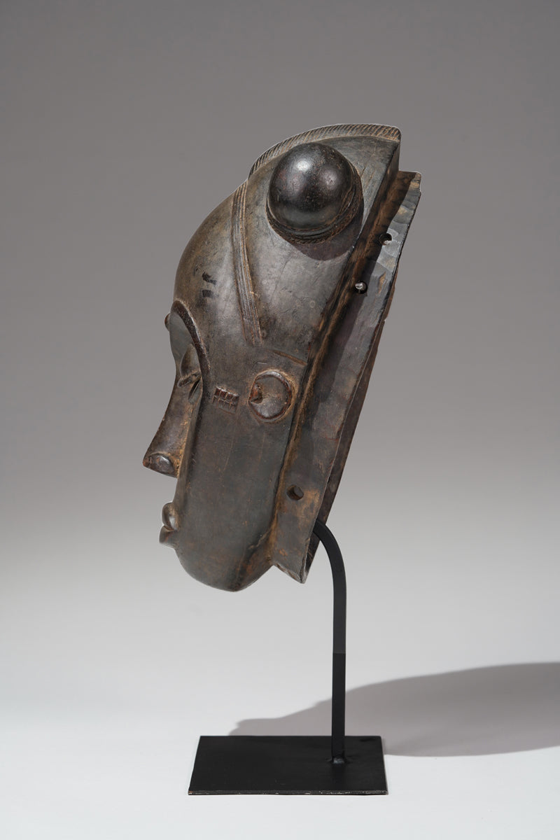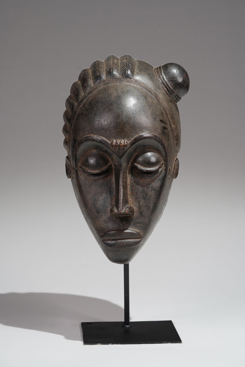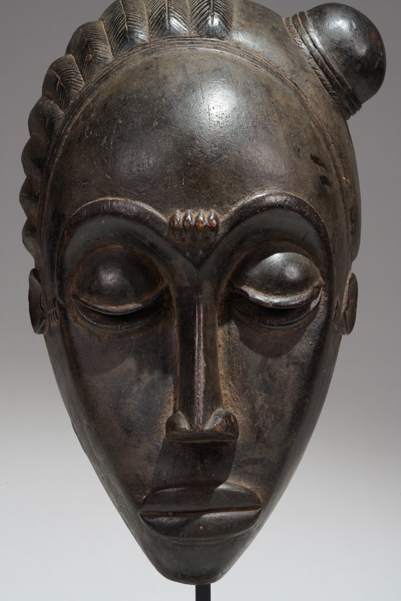 "Baule masks, with their refined elegance and meticulously carved features, are more than mere objects of aesthetic admiration; they are embodiments of the community's ideals and spiritual beliefs. The Mblo portrait masks, in particular, represent a confluence of personal identity and cultural values, capturing not just the likeness but the moral character of the individuals they honor. The smooth surfaces, high foreheads, and downcast eyes convey serenity, wisdom, and self-control—qualities highly esteemed in Baule society. In contrast, the Goli masks, with their bold forms and dynamic presence, serve as intermediaries between the human and spirit worlds, invoking protection and guidance during critical community events. Together, these masks illustrate the Baule's ability to navigate the realms of both the sacred and the secular, creating art that resonates with beauty and profound cultural significance."