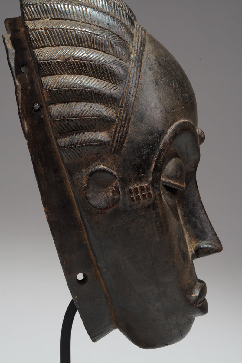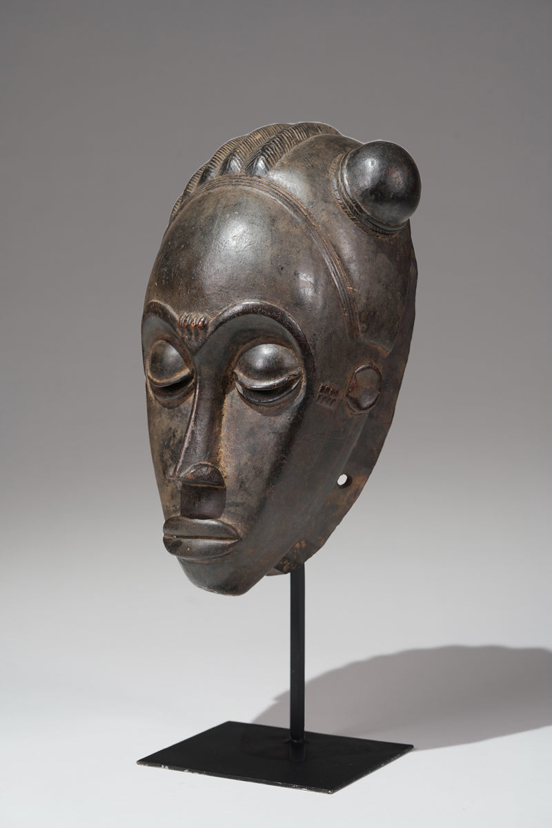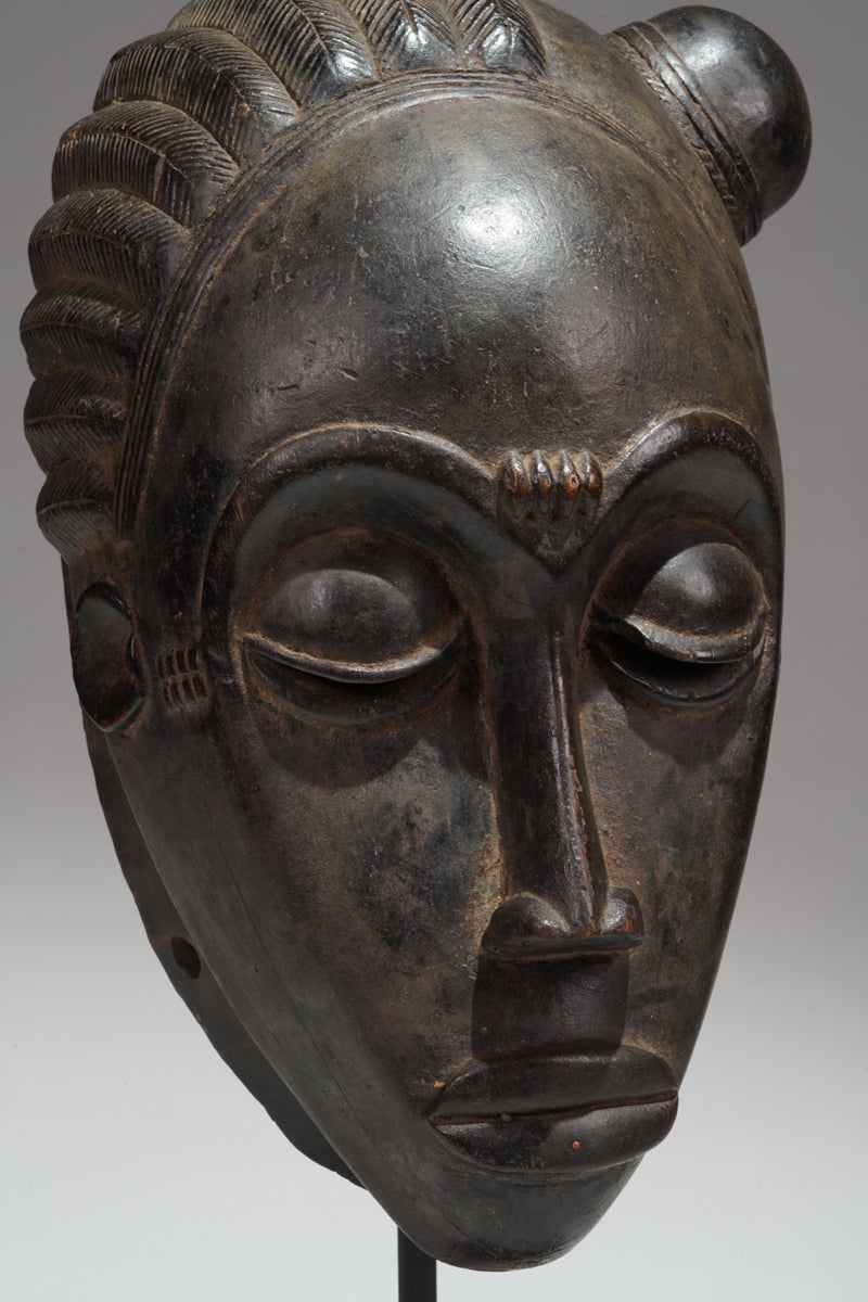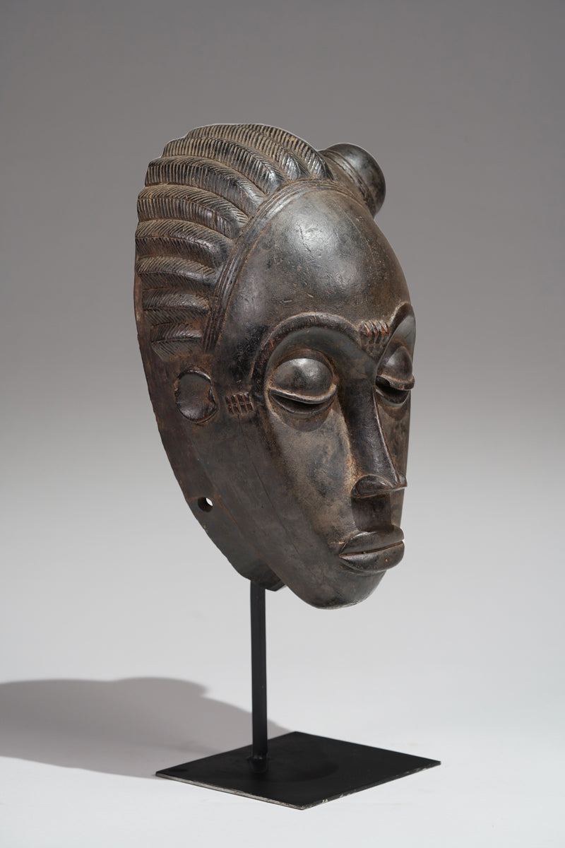"Baule masks, with their refined elegance and meticulously carved features, are more than mere objects of aesthetic admiration; they are embodiments of the community's ideals and spiritual beliefs. The Mblo portrait masks, in particular, represent a confluence of personal identity and cultural values, capturing not just the likeness but the moral character of the individuals they honor. The smooth surfaces, high foreheads, and downcast eyes convey serenity, wisdom, and self-control—qualities highly esteemed in Baule society. In contrast, the Goli masks, with their bold forms and dynamic presence, serve as intermediaries between the human and spirit worlds, invoking protection and guidance during critical community events. Together, these masks illustrate the Baule's ability to navigate the realms of both the sacred and the secular, creating art that resonates with beauty and profound cultural significance."