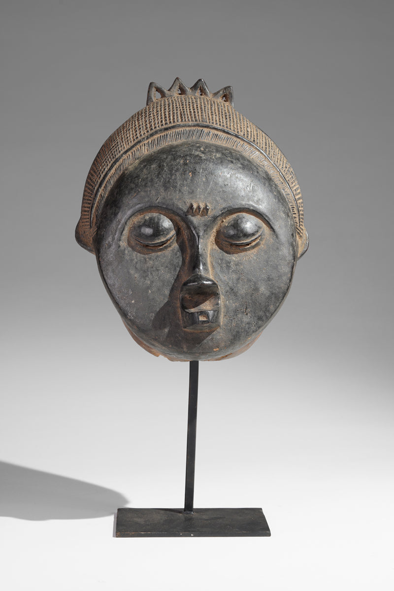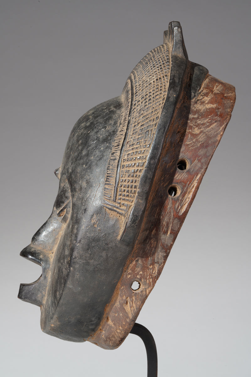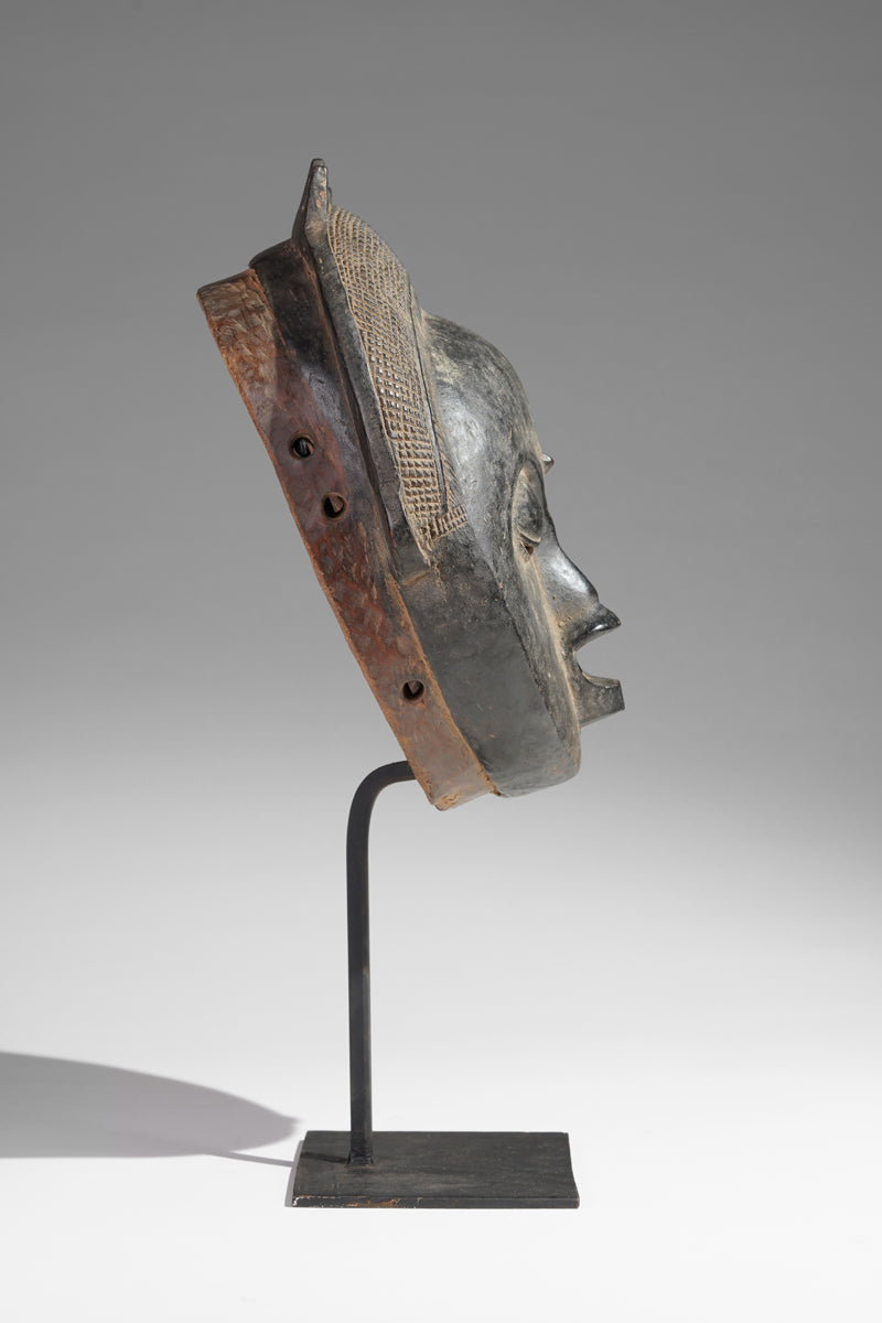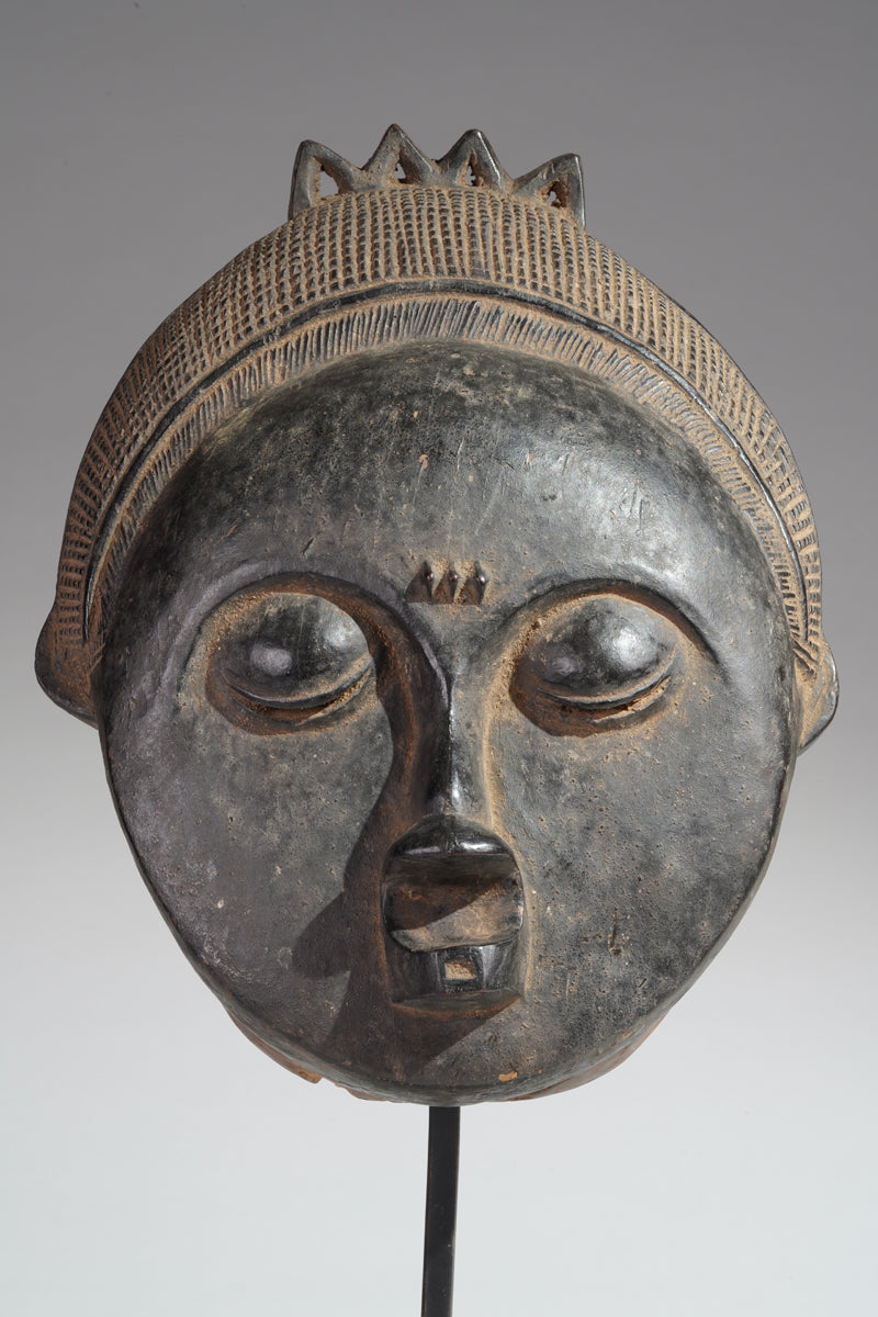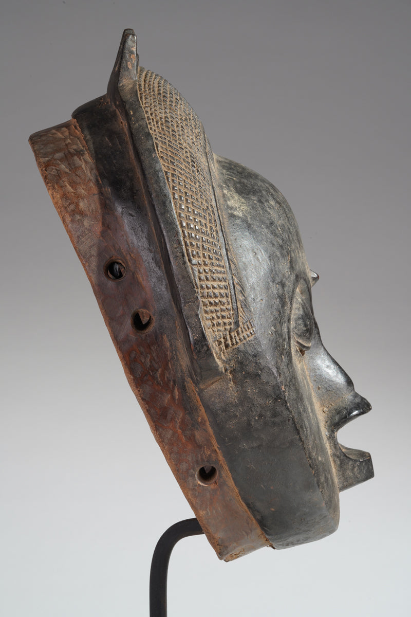 "Portrait masks embody the core Baule sculptural style that is echoed in figural sculpture and decorative arts. They also have provided Baule sculptors with their prime opportunity for artistic invention, and the corpus demonstrates enormous formal diversity. This diversity is often apparent in imaginative decorative passages extending above the face […] Such masks appeared as the final sequence of an operatic public entertainment known as Mblo. Mblo performances consist of a succession of dances that escalate in complexity and importance, culminating ultimately in tributes to the community's most distinguished member. Individuals honored in this way are depicted by a mask that is conceived of as their artistic double or namesake."