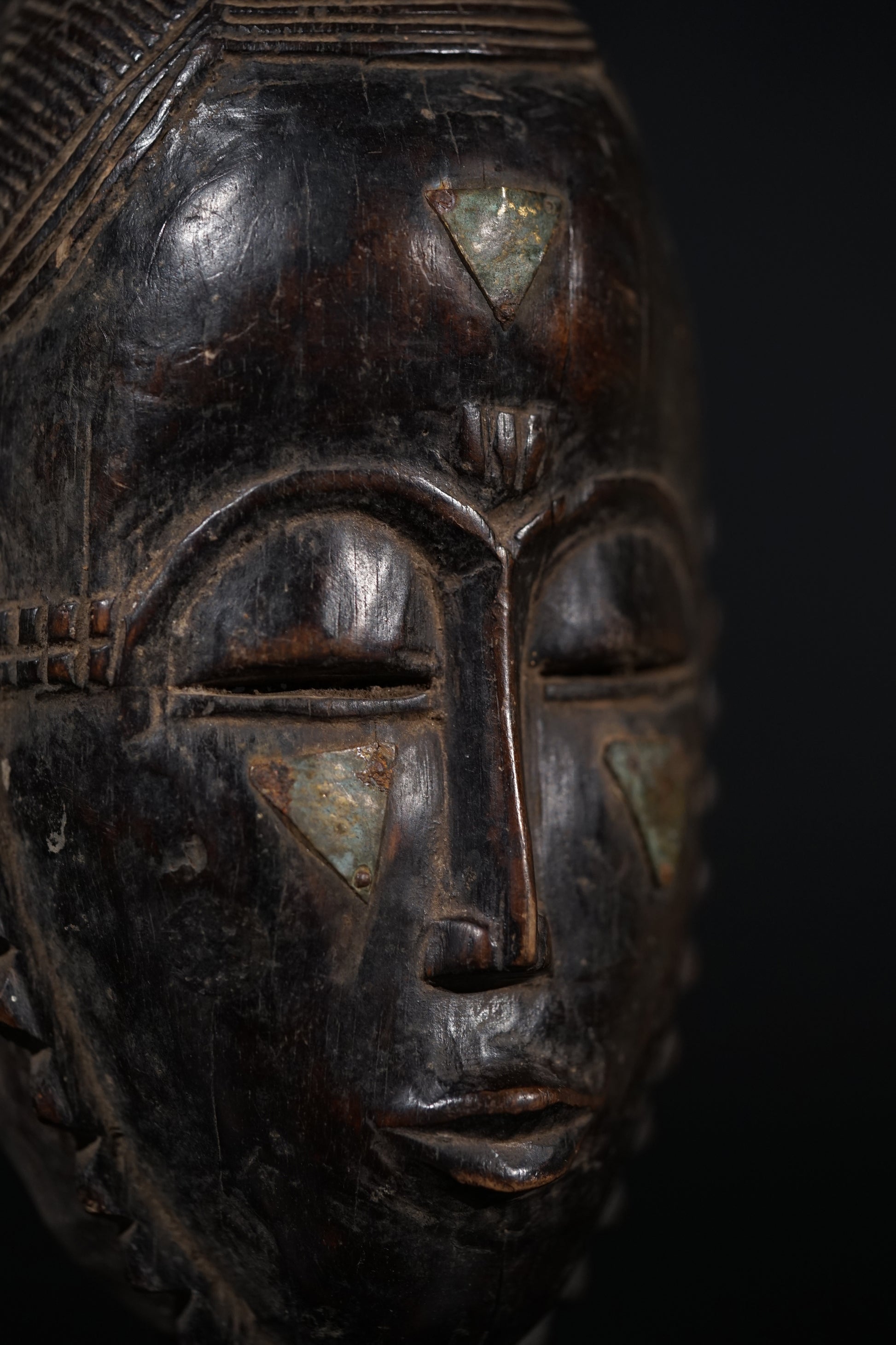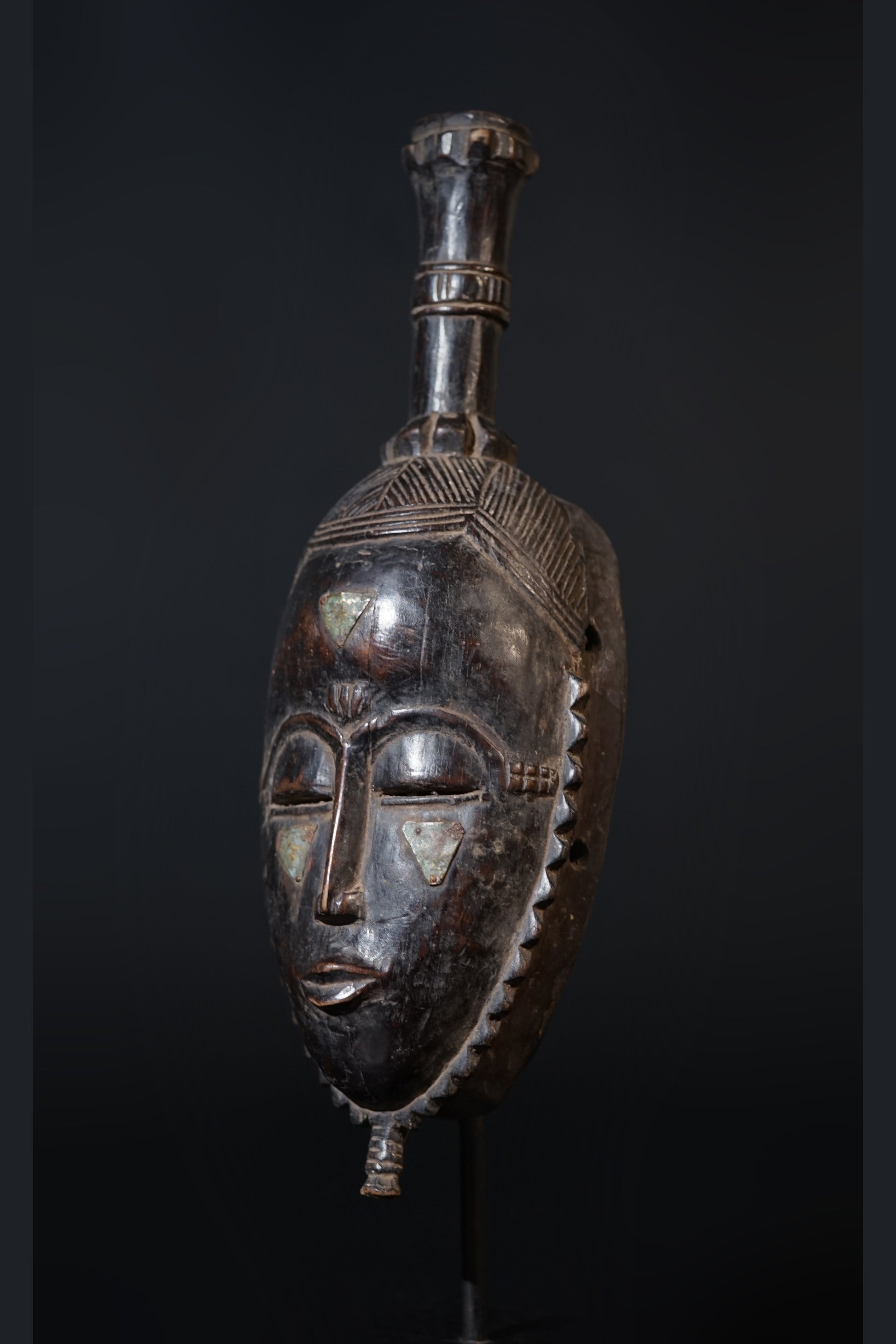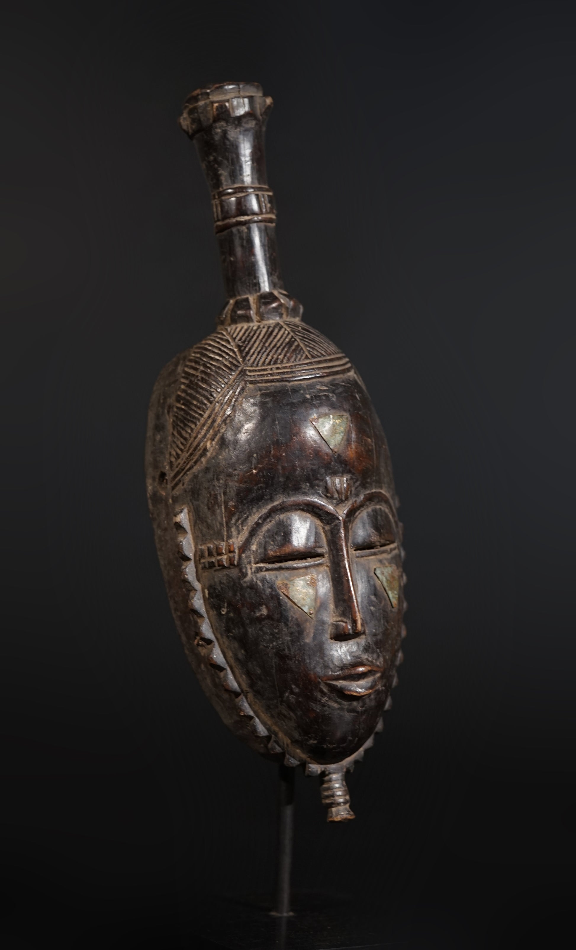 A Baule or Yaure mask of oval, hollowed form with metal plates on the cheeks, a slightly open mouth beneath a slender nose and high arched brows, heavy-lidded eyes with sliteyes pierced through, a carved zig-zag line around the fascial plane, the coiffure three-parted and striated, on top a handle-like staff with a fine touch-patina; brown to blackened surface.
