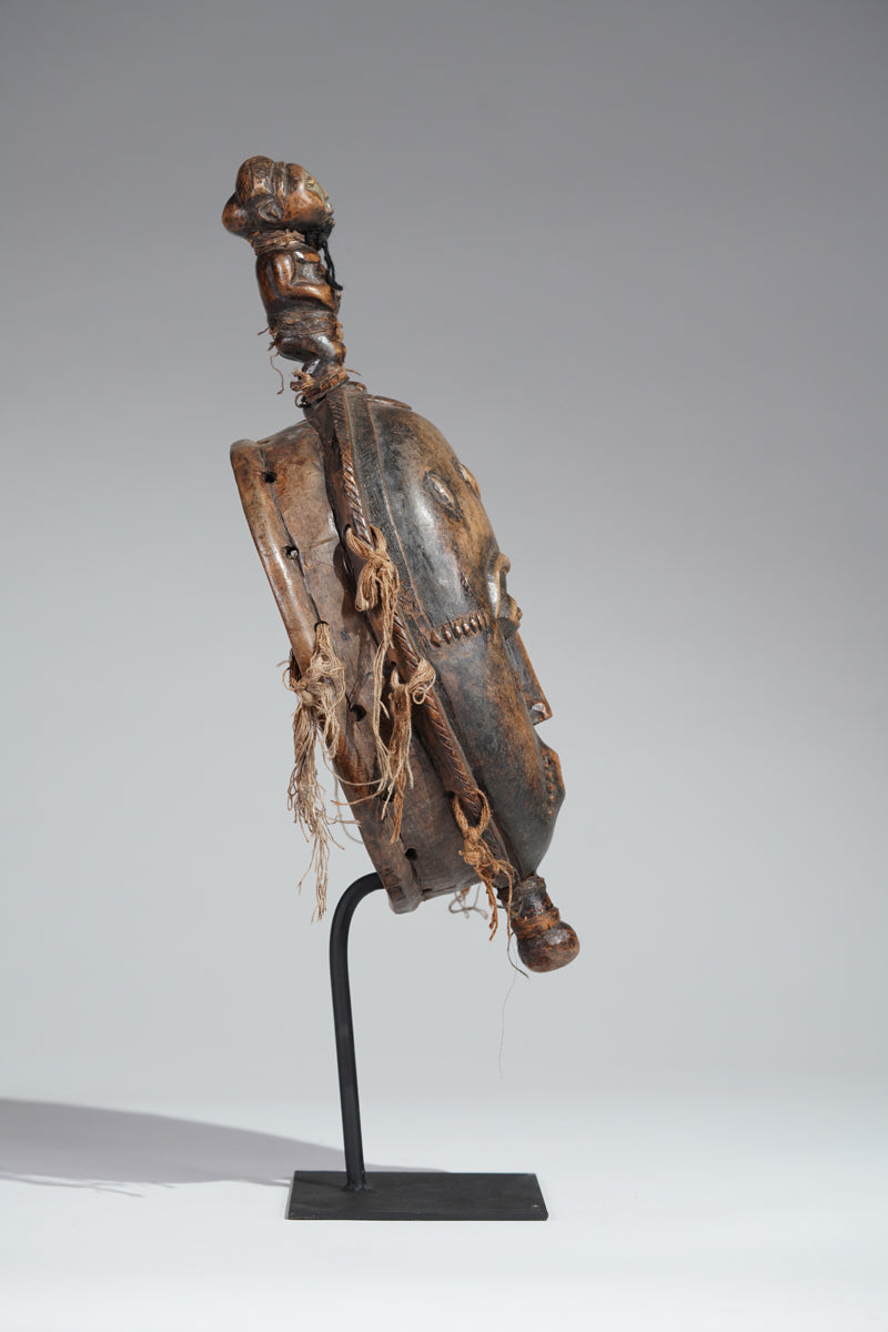 A Baule Royal mask collected in the Didieville region, Ivory Coast with a male figure created on top. Signs of ritual use and age.