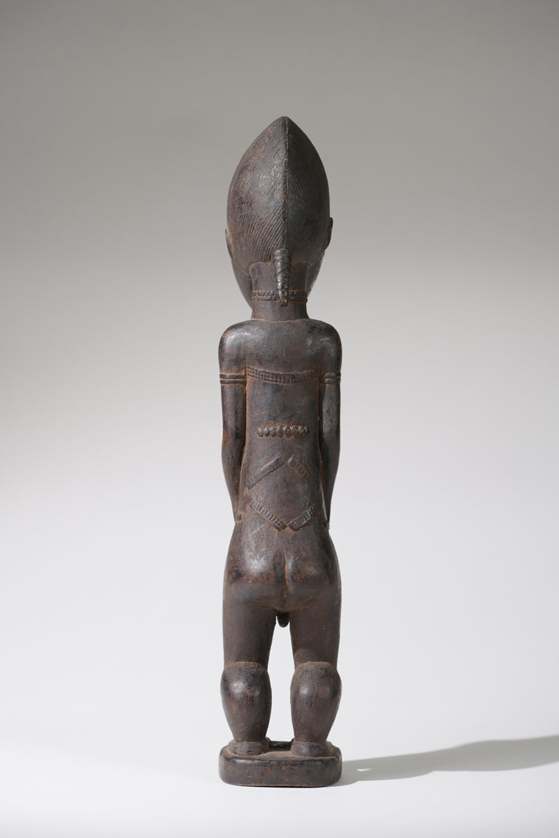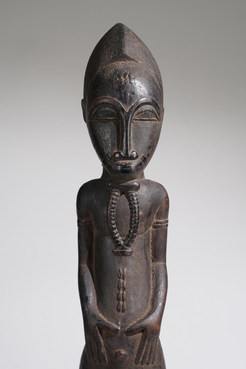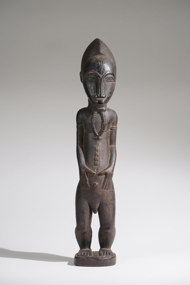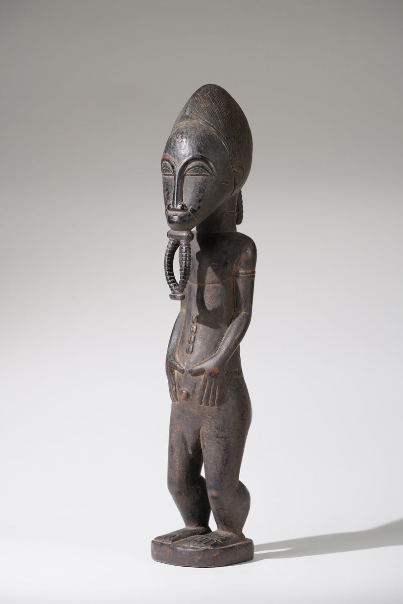 Beyond the spirit spouse context, male figures can also function as portraits of revered ancestors or embodiments of tutelary spirits. In certain contexts, they may be used in divination, healing rituals, or public ceremonies, particularly among Baule trance diviners. The representation of masculinity in these sculptures reflects Baule ideals of male virtue: dignity, strength, responsibility, and restraint. They are visual affirmations of social and moral order, modeling what a balanced and respected man should embody in Baule society. Baule male sculptures maintain a balance between stylization and realism, exhibiting a high level of technical skill and aesthetic refinement. While there are strong formal similarities between male and female sculptures, subtle distinctions—such as musculature, posture, or the presence of masculine objects like staffs or weapons—indicate gender differentiation.
