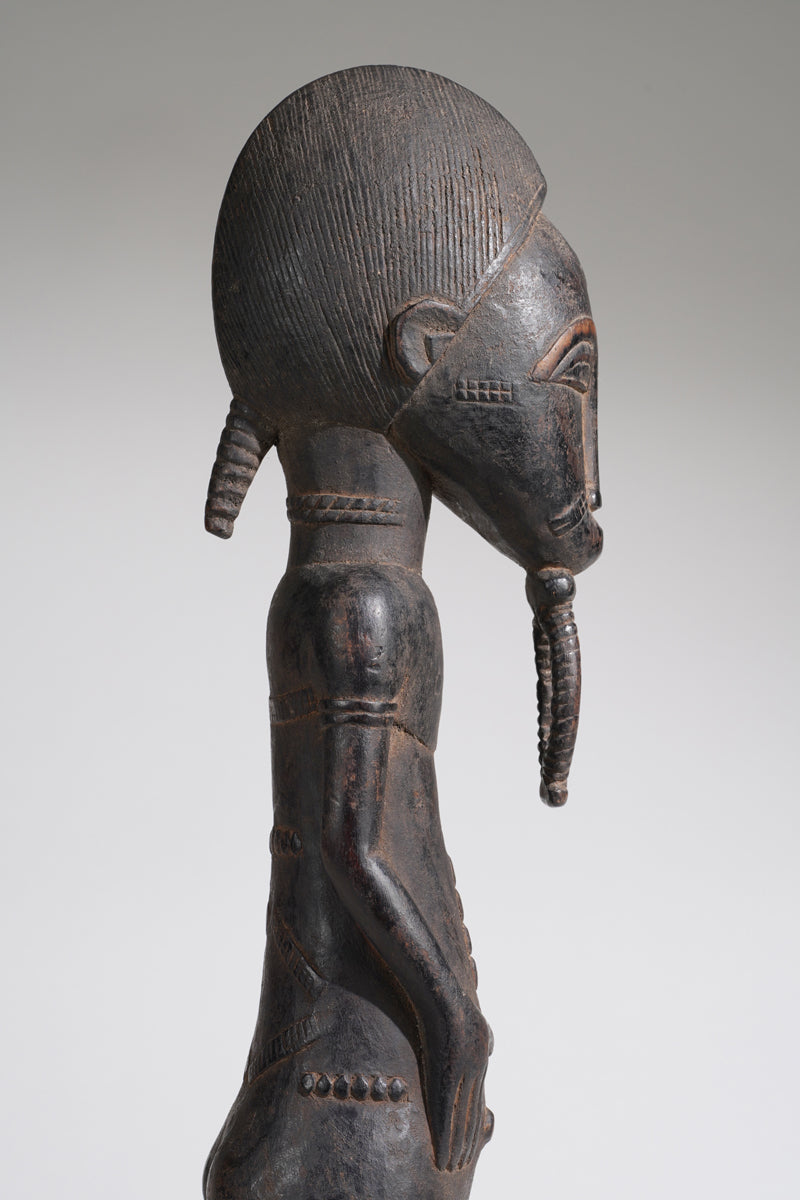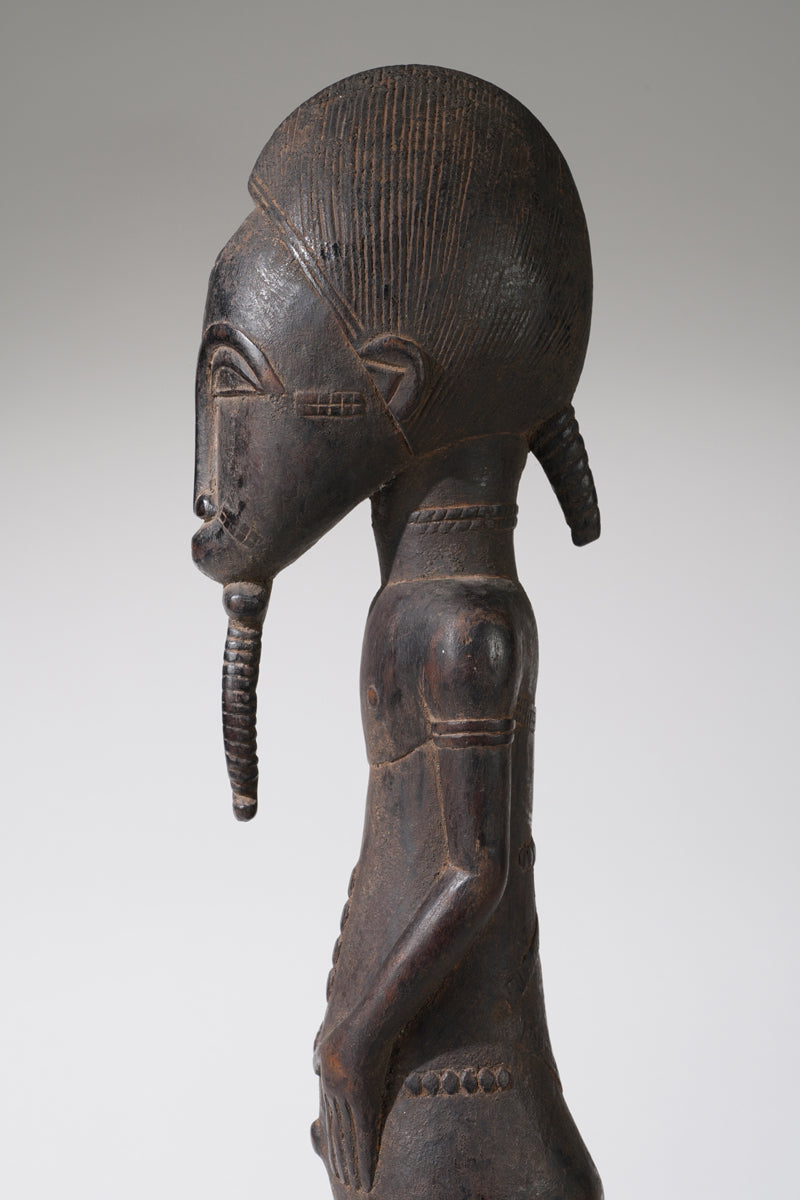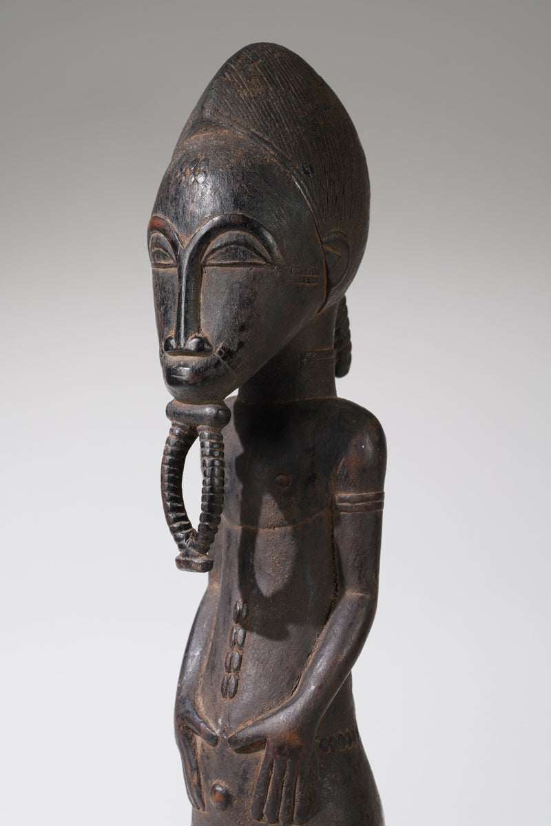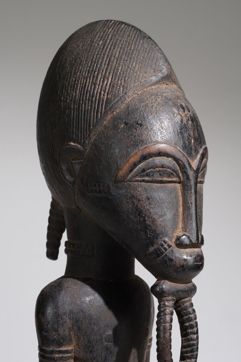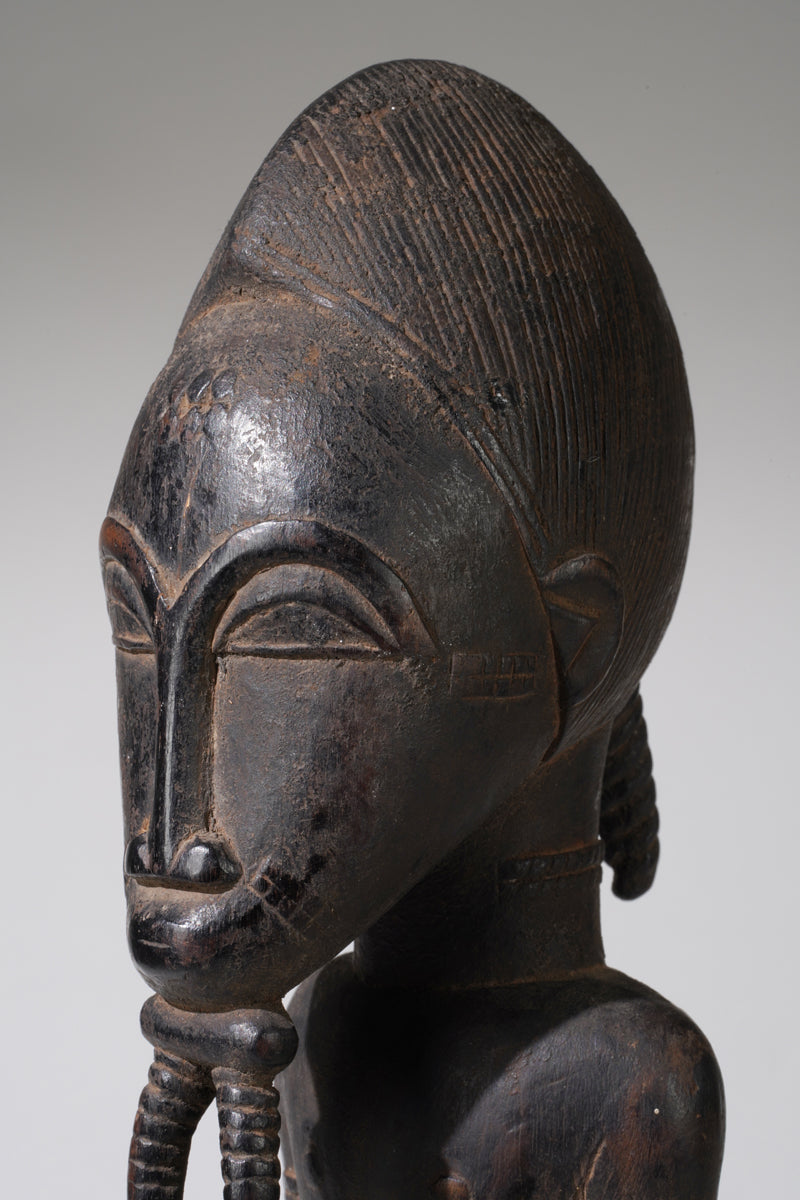 In comparison to the more abstracted or aggressive forms found in the sculpture of neighboring groups such as the Dan or Guro, Baule art remains notably introspective and harmonious, reflecting the community's cultural preference for order, clarity, and moderation.