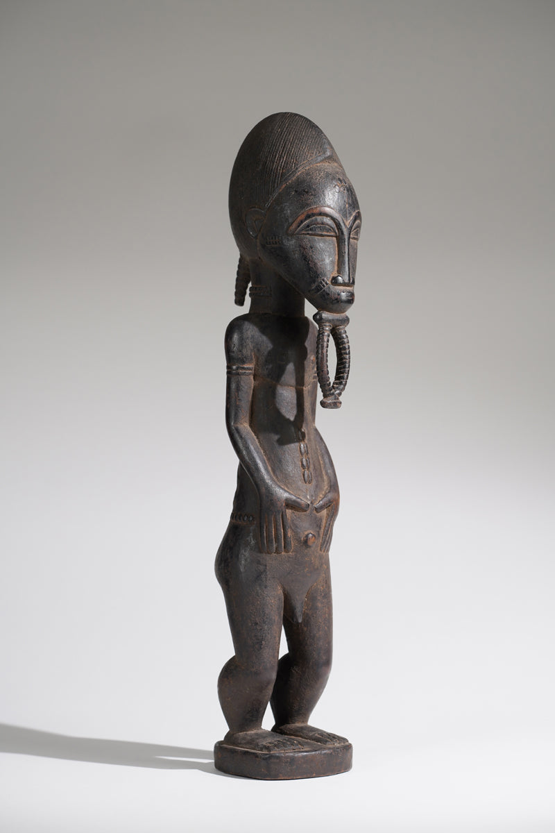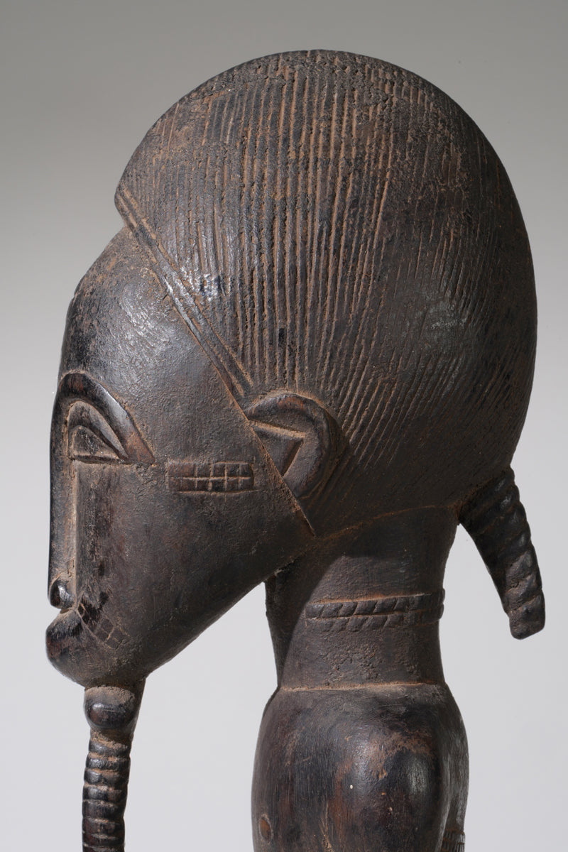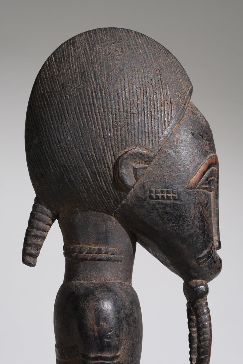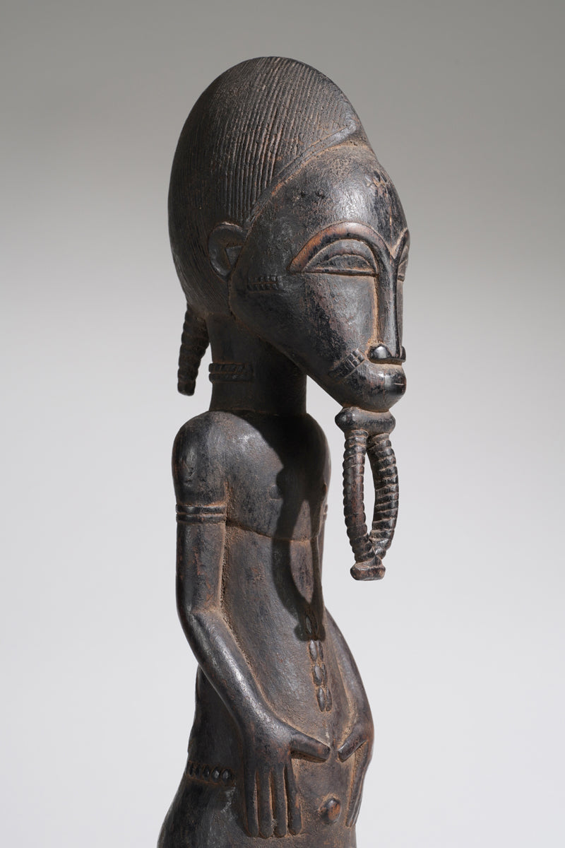 In comparison to the more abstracted or aggressive forms found in the sculpture of neighboring groups such as the Dan or Guro, Baule art remains notably introspective and harmonious, reflecting the community's cultural preference for order, clarity, and moderation.