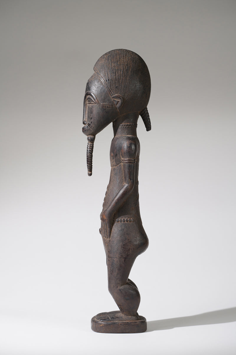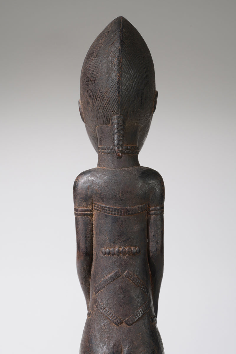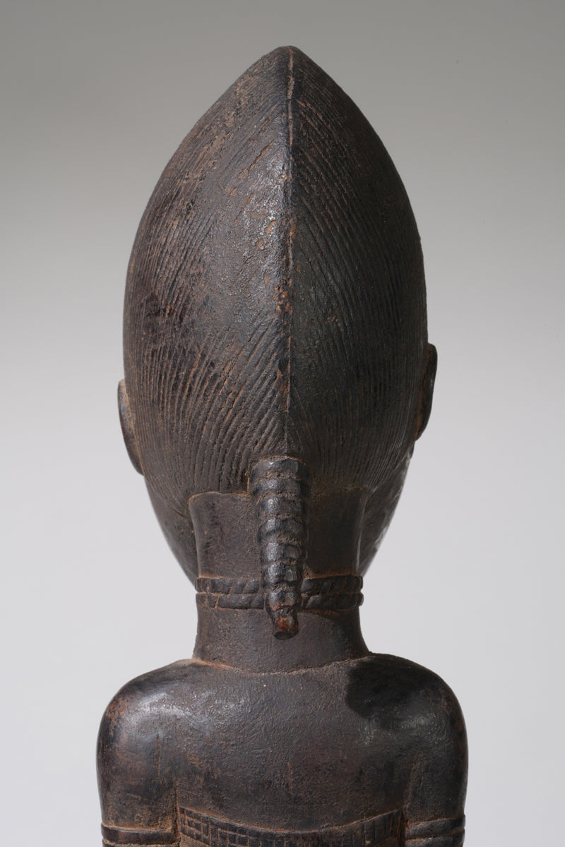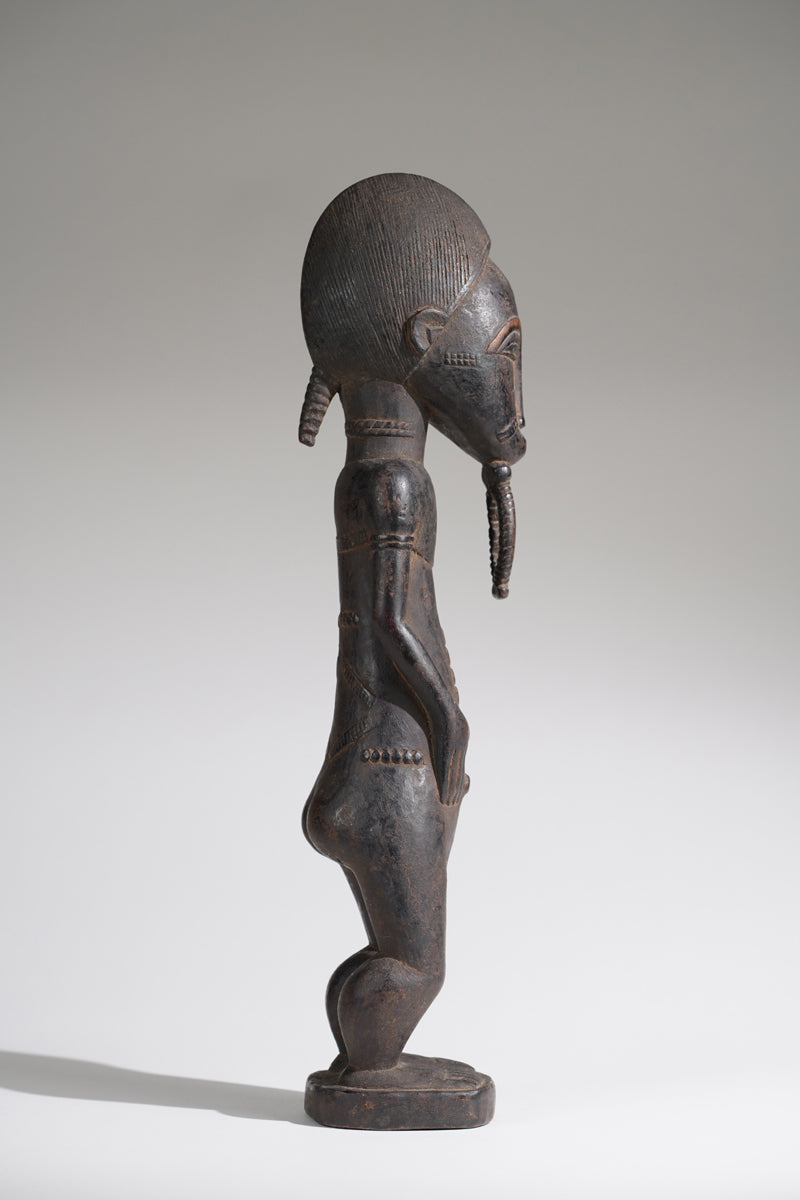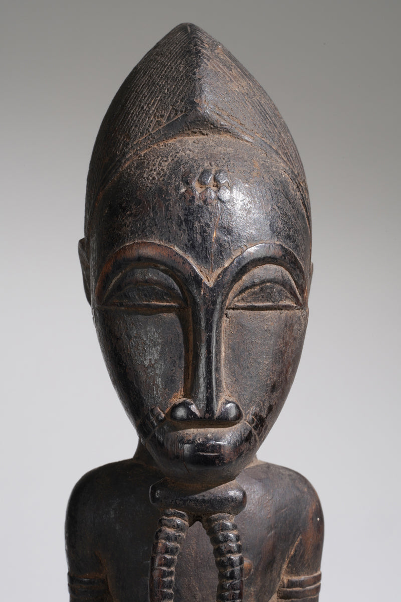 In comparison to the more abstracted or aggressive forms found in the sculpture of neighboring groups such as the Dan or Guro, Baule art remains notably introspective and harmonious, reflecting the community's cultural preference for order, clarity, and moderation.