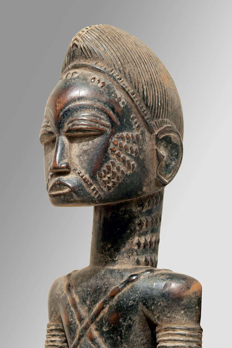 In the context of Baule sculpture, the term region refers to the geographical area in central Côte d’Ivoire where the Baoulé people are concentrated. This includes areas around Daoukro, Yamoussoukro, Bouaké, and nearby villages. The regional origin of a sculpture is significant because local variations in style, proportion, posture, and detail—such as coiffure, scarification, or seated pose—reflect both aesthetic preferences and ritual function specific to that locality. These regional traits help distinguish figures used for spiritual purposes, like blolo bian/blolo bla (spirit spouses) or Asie Usu (protective spirits), and indicate the cultural and social context in which the sculpture was created.