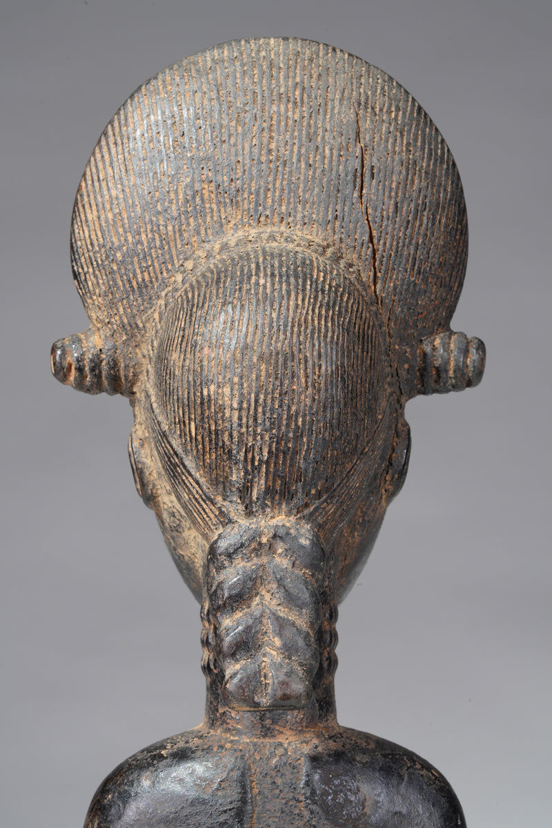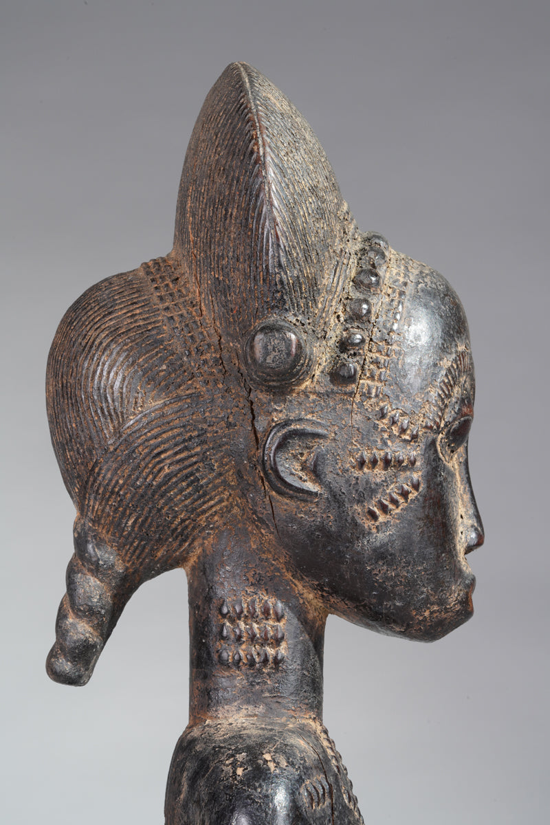 One notable feature of Yamoussoukro-region Baule sculptures is the emphasis on frontality and composure. Figures often present a compact, upright stance, with softly rounded limbs and a harmonious facial oval. The coiffure is elaborately carved, frequently in a crested or double-lobed style that reflects actual Baule hairdressing practices, and such attention to coiffure is especially pronounced in figures from this region. The surface treatment is smooth and polished, enhancing the sense of refinement and serenity, which is crucial to the sculpture's role in ritual contexts.