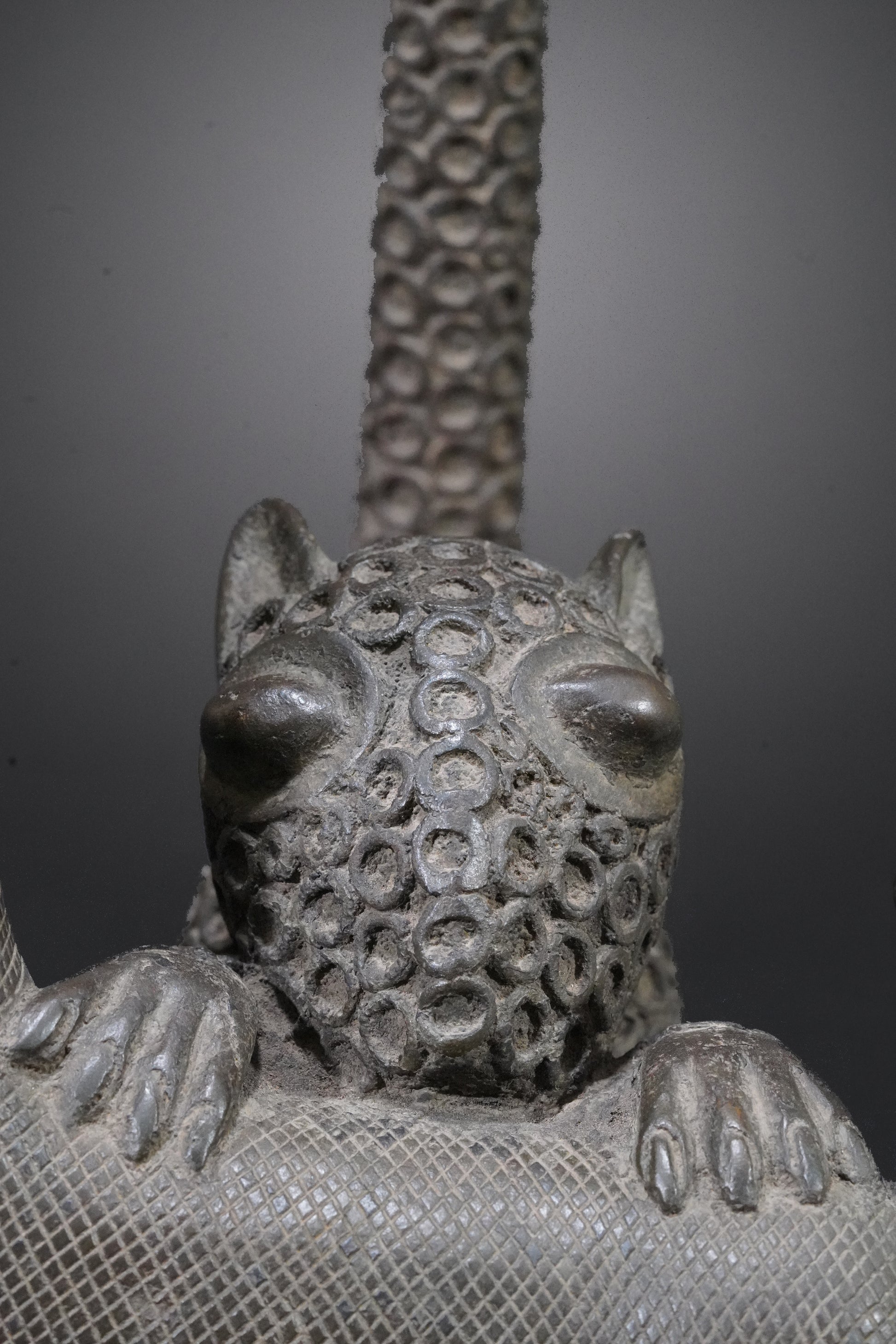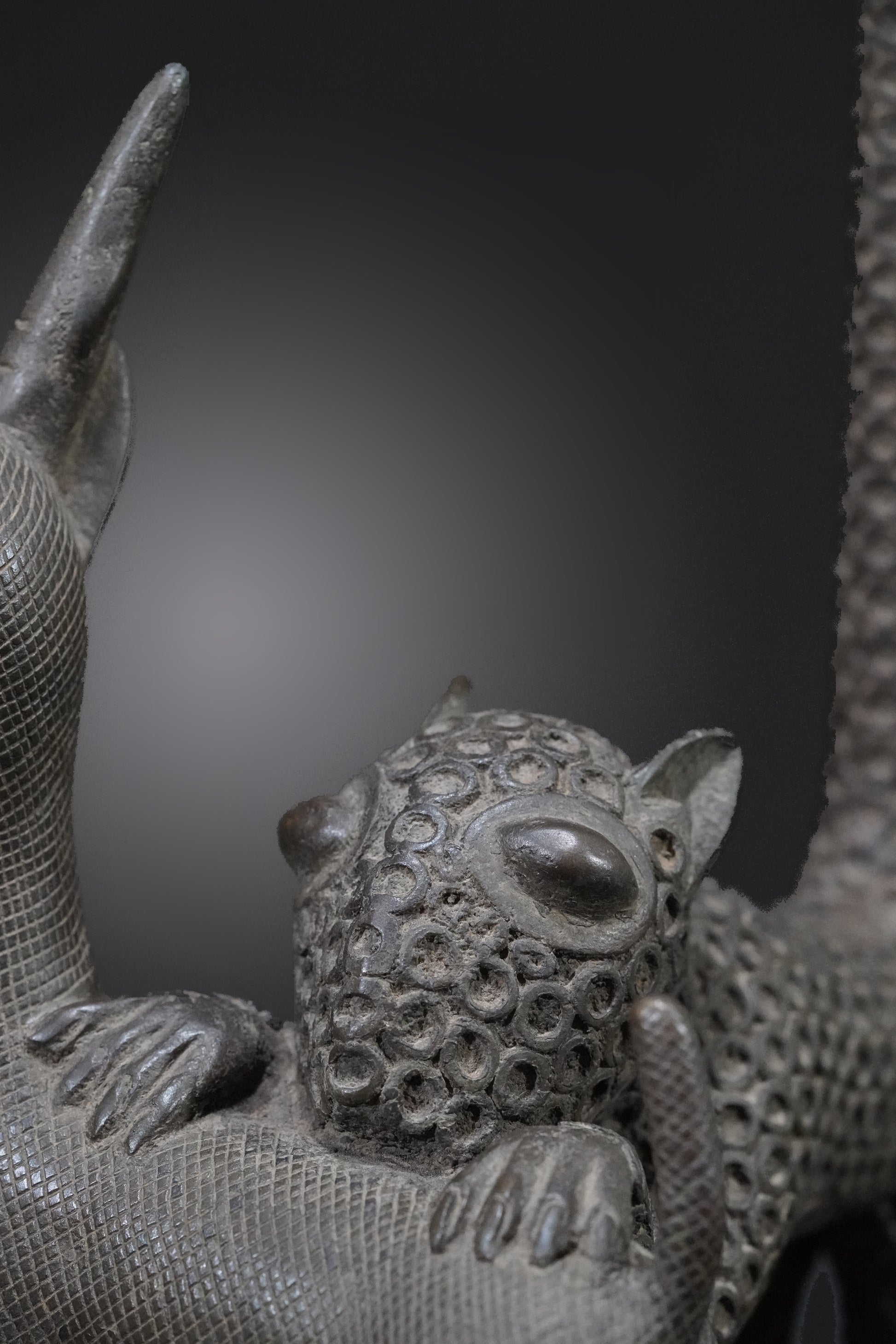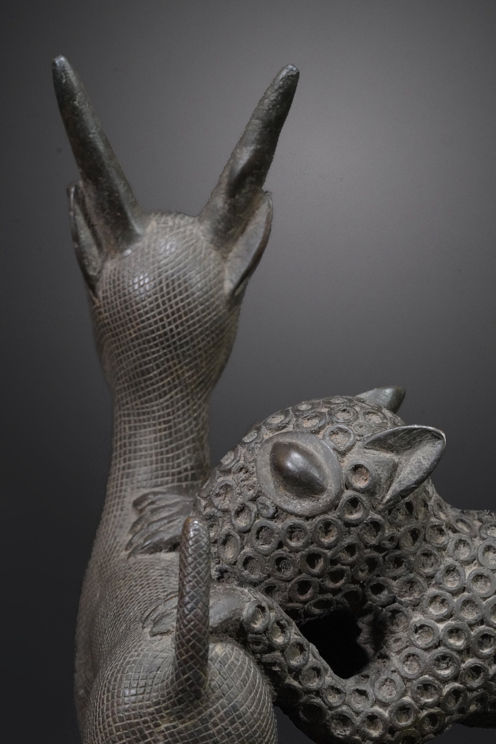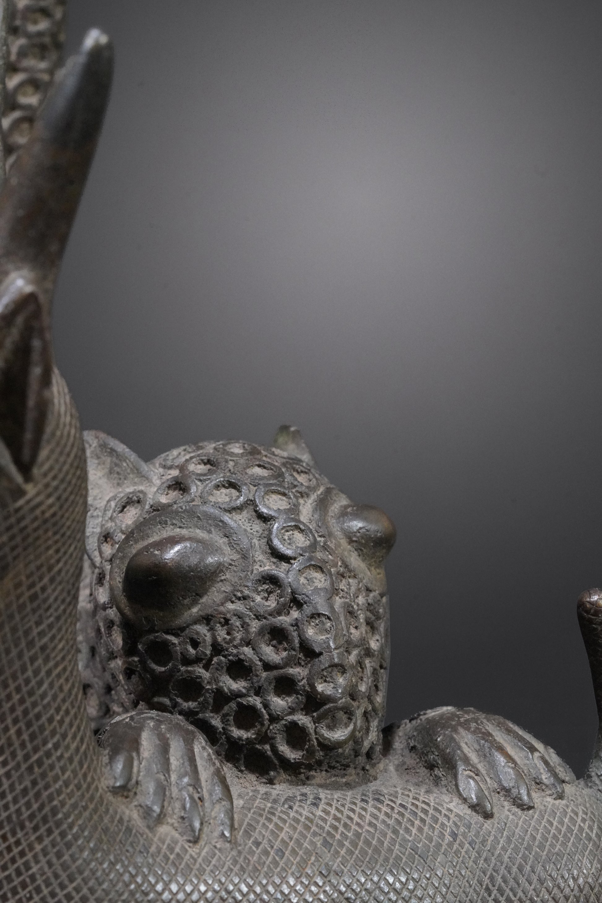 Probably one of the most beautiful Benin animal bronzes that we have ever seen. The type of depiction is reminiscent of the first jungle painting that Henri Rousseau painted in 1905 and which is now in the Fondation Beyeler.