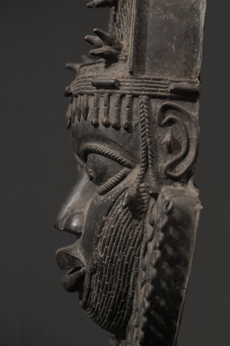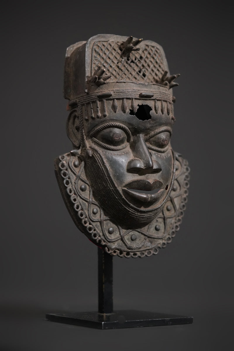A Benin Bronze in the shape of the face of an Oba, the neck and chin completely hidden under many layers of coral strings, which also lie around the forehead as a band and hang down from it next to six small feathers, a braided garland drapes around the lower face, on the head a a square cap representing a beaded cap, the full lips are just slightly open, the nose with wide nostrils springs from the domed forehead, the large fully rimmed eyes have iron inlays as pupils, star-shaped scarifications around the lower eyelids, the ears are shaped as a C-shaped bulge; a few tiny holes and a bit larger broken out area in the middle of the forehead, a beautiful encrusted patina, partly shiny, incl. stand.