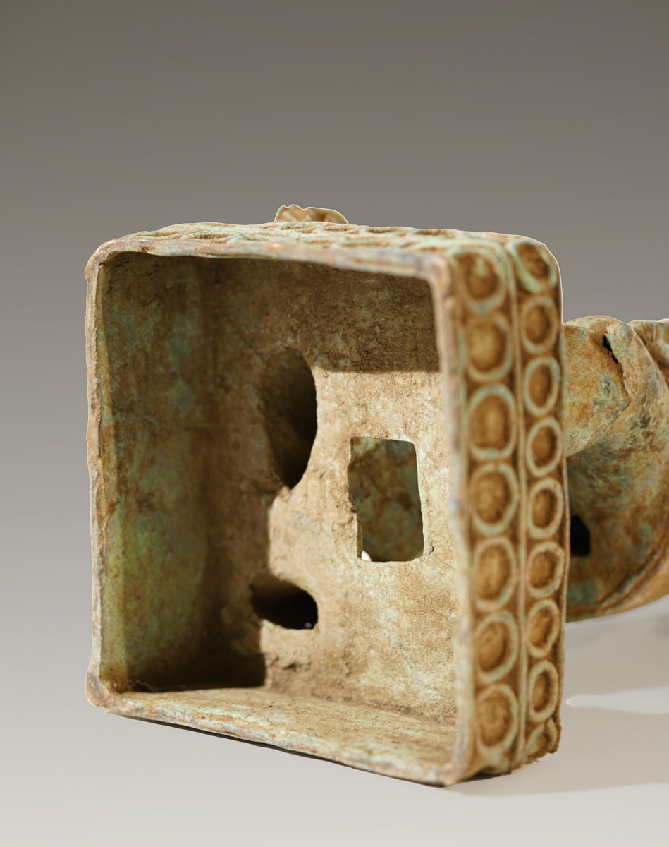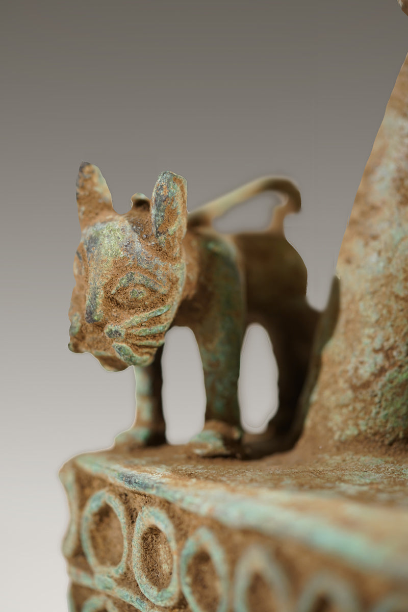 The hunter's motive, which carries a killed antelope on his shoulders, is more common in the iconography of the Yoruba, and has probably received the greatest publicity through its copy in the British Museum. At the foot of these figures, which are usually on a rectangular pedestal, we see a leopard, which is the symbol of the hunters, because he himself is the hunter of the other animals in the bush. In the middle of the base is usually a hole, which served to accept victims. The figure has a strongly oxidized, greenish patina and various cracks, especially in the torso and in the legs.