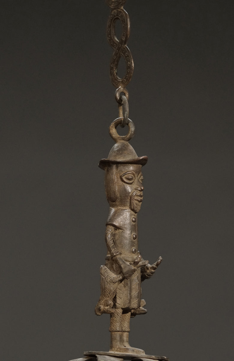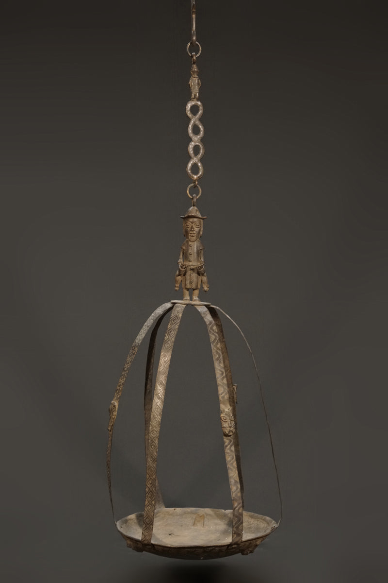 A Benin bronze oil lamp consisting of a shallow bowl, which is decorated with two rows of precisely incised waves and animal heads on the underneath. Riveted to the bowl are thin ornate bands, to every second of which is an animal head attached. On a flat disc, where the ribbons meet at the top, stands a bronze figure about 19 cm high, depicting a Portuguese man wearing boots, trousers and a thin undergarment and above that a long buttoned and belted coat. His arms are slightly bent, in both hands he carries a rooster, on his head sits a wide-brimmed hat. The trousers, undergarments, coat and roosters are decorated with very fine different geometric patterns. Under the hat appears a three-parted coiffure. The precisely worked face has an astonished expression due to the large eyes and the full, slightly open mouth. The hanging moustache and the short wavy chin beard are also designed differently. On the head of the Portuguese is a chain mounted with a large hook at the other end, which was used to hang the lamp from the ceiling. But between the hook and the braided chain decorated with circles, there is another smaller figure. It is a male figure in a loincloth decorated with squares and dots, around his neck he wears a heavy necklace, his hands with the fingers stretched out, rest on his abdomen. His coffee-bean-shaped eyes protrude, the nose has wide wings and the lips are full, the helmet-like hairstyle is ornate with checks.
