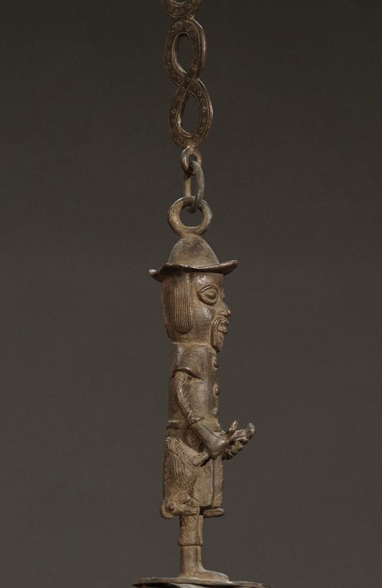 These oil lamps hung in the shrines of the palaces. The Oba of Benin has numerous shrines because he maintains unique relationships with the spiritual world. Thus, there are deities that are assigned to him alone and others that he attends to together with certain social groups. Such exclusive connections characterize the uniqueness of the Oba, which is also reflected in the materials used and the iconography of the artefacts. The precious bronze was reserved for the king and his court. This is the case for the commemorative heads as well as for other objects such as our oil lamp.