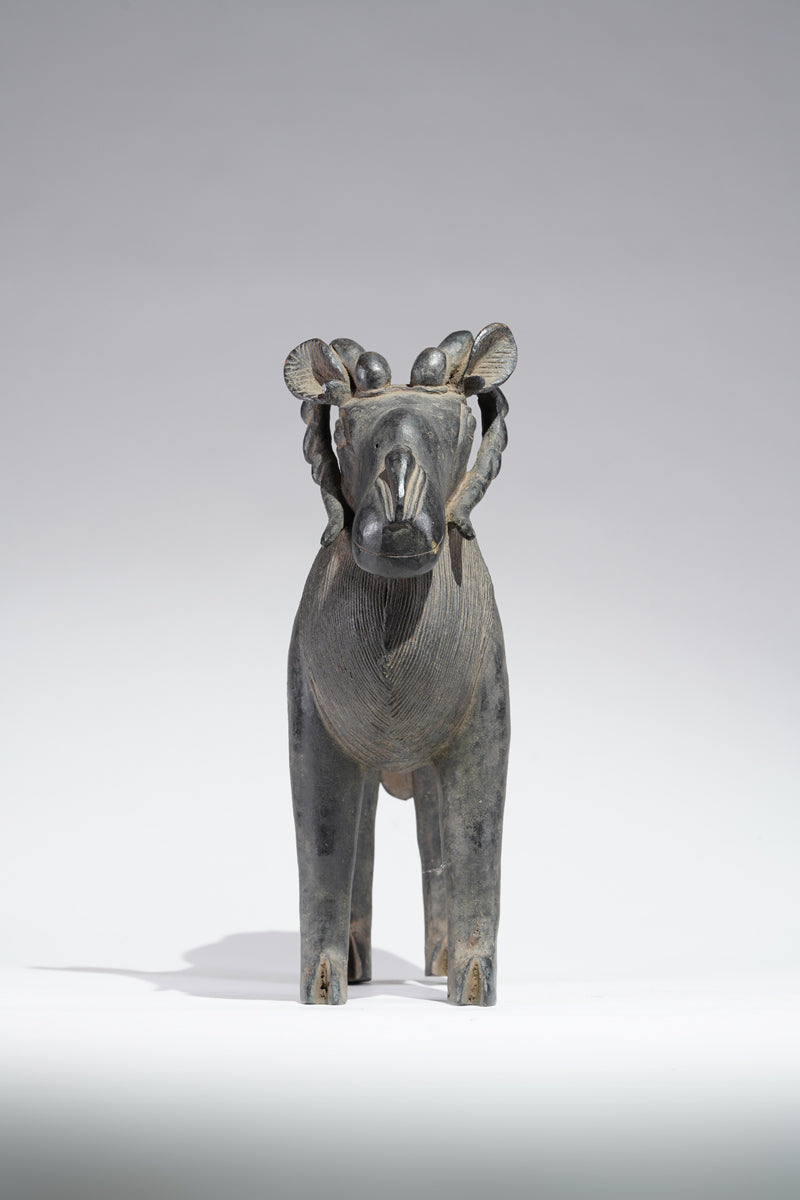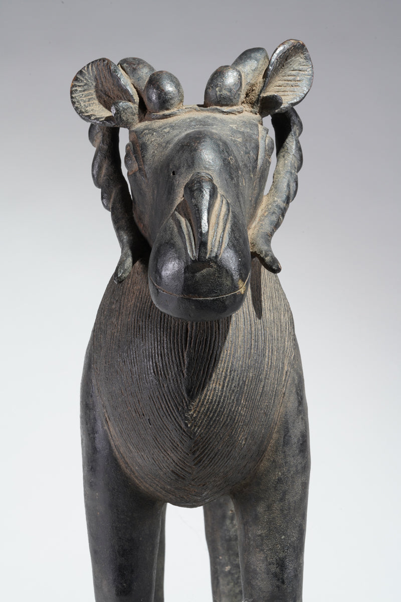 Kingdom of Benin, Nigeria, 16th/17th century Yellow cast iron, 34 x 44 x 14 cm The National Commission for Museums and Monuments, Nigeria, Inv. No. 53.22.2 Aquamaniles were introduced to Europe in the Middle Ages; they originated in Muslim countries, where such zoomorphic containers were used for ritual washing. They were also used liturgically in Europe, but by the 15th century they had also been integrated into secular table culture. Portuguese traders probably brought an example to the Oba of Benin as a gift, or a damaged example was brought there as scrap metal for reuse in a foundry. It is doubtful that such vessels were imported via the trans-Saharan trade, since aquamaniles are not found anywhere else in West Africa and had been abandoned in the Islamic world centuries earlier. The Oba used ram aquamanile to wash his hands during the final rites of the Ague ceremony, which was a purification ceremony associated with the new yam harvest (Curnow 1997a: 50).