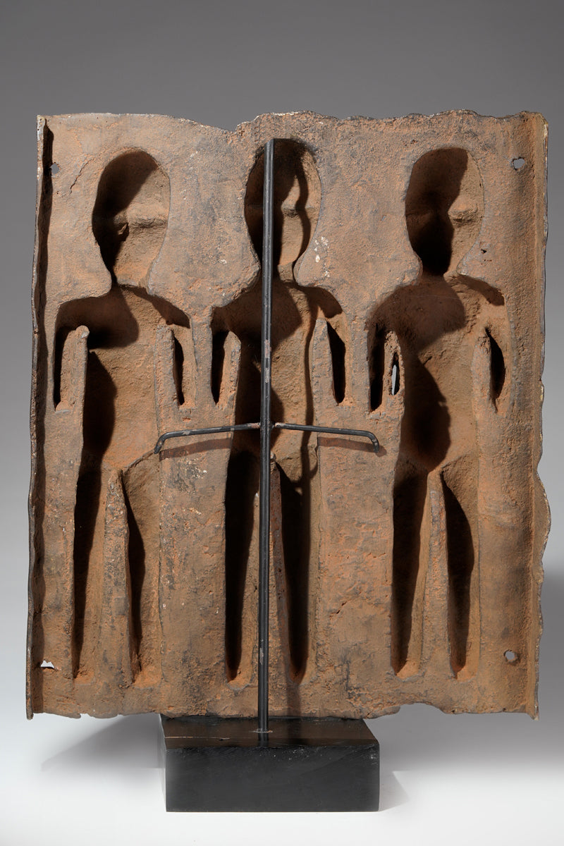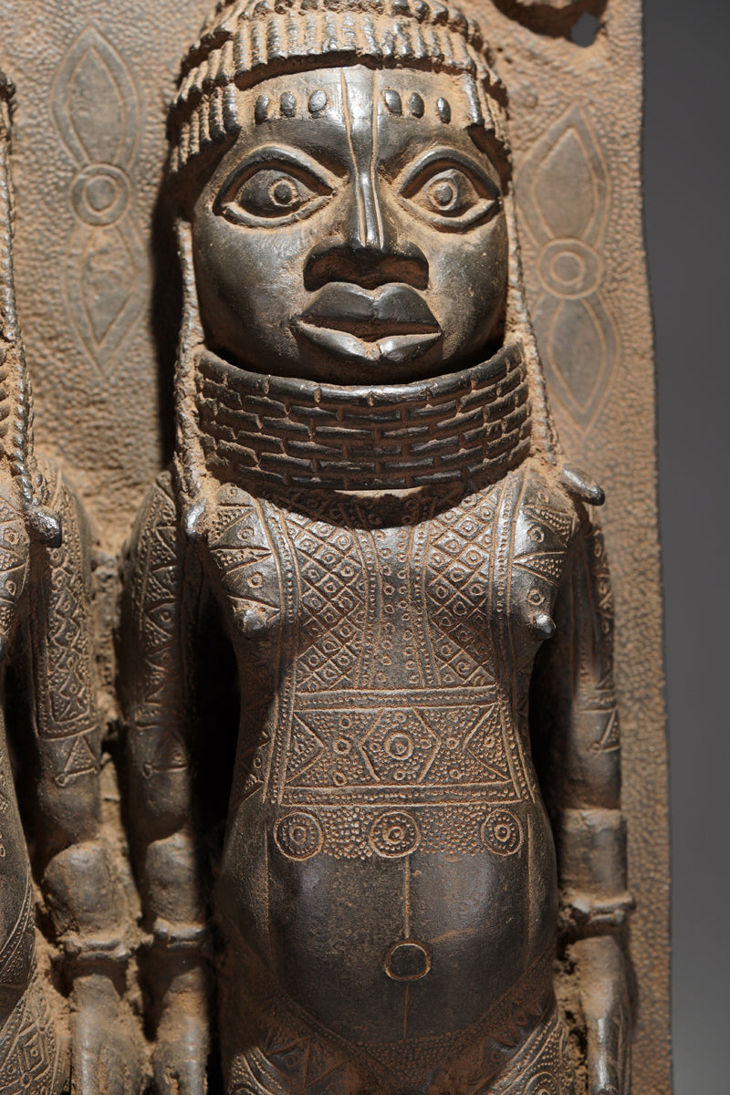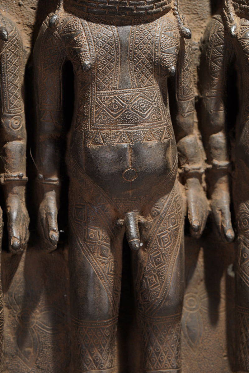 A Benin plate in the style of Benin, "The three unclothed young men with coral necklaces on their necks and ankles, whose bodies are tattooed or painted, are probably not the king's personal servants (emada), who are usually depicted unclothed. According to oral tradition, this plate is now considered to be a depiction of Prince Odogbo, later King Ohuan (1608-1641). When he was born, a rumor arose that the newborn was a girl. After his appointment as heir to the throne, he had to prove his male gender by appearing naked." Source Digital Benin.