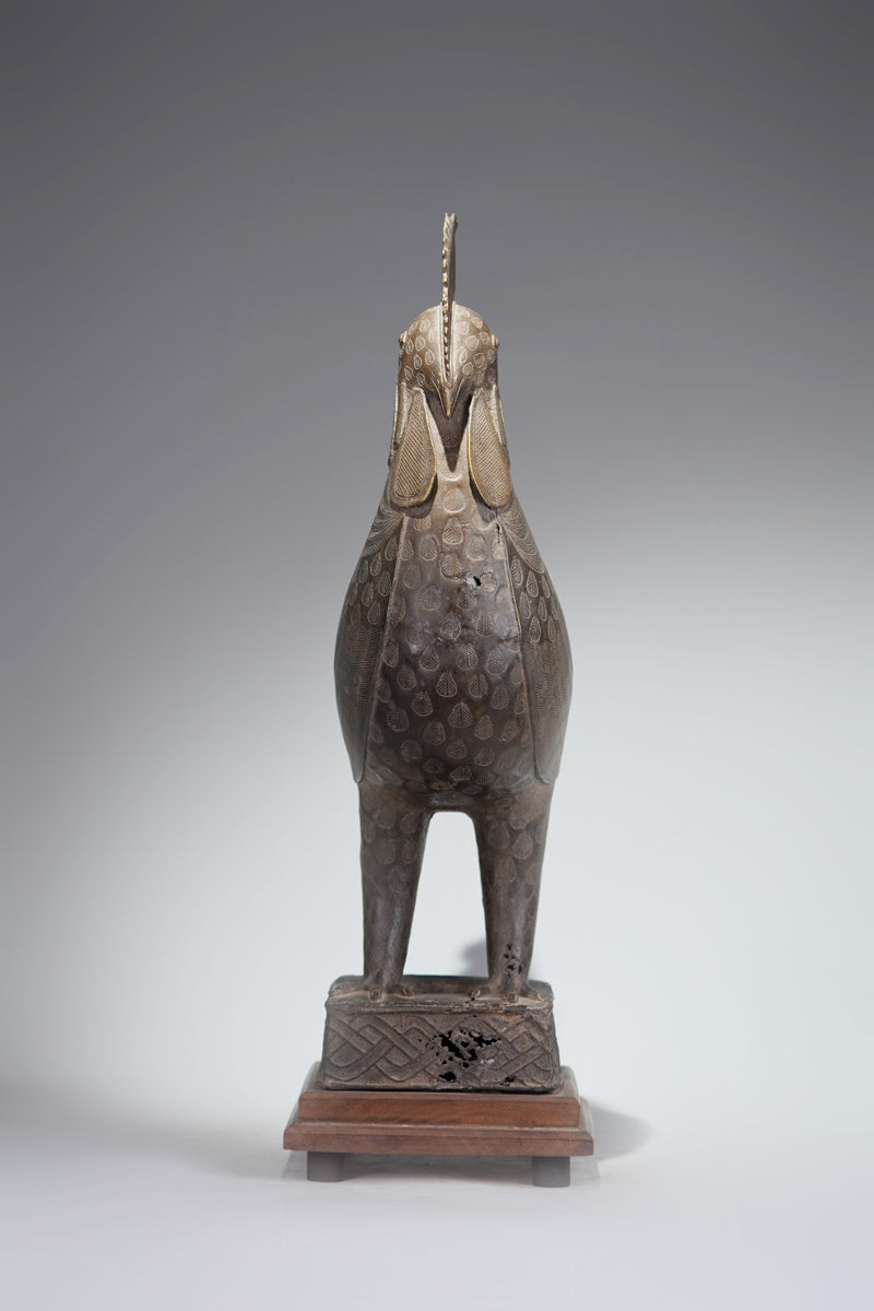 A Benin rooster, (Okukor / Okpa). standing on a rectangular base, which is supported by a wooden pedestal. The meandering pattern indicates an early bronze (see Wisocky & Gunsch). This majestic animal, with its splendid, finely crafted plumage, is probably one of the most beautiful pieces we have collected. Given its well-preserved condition, it likely stood for centuries in an aristocratic palace before finding its place in a private collection in Lomé., incl. stand.