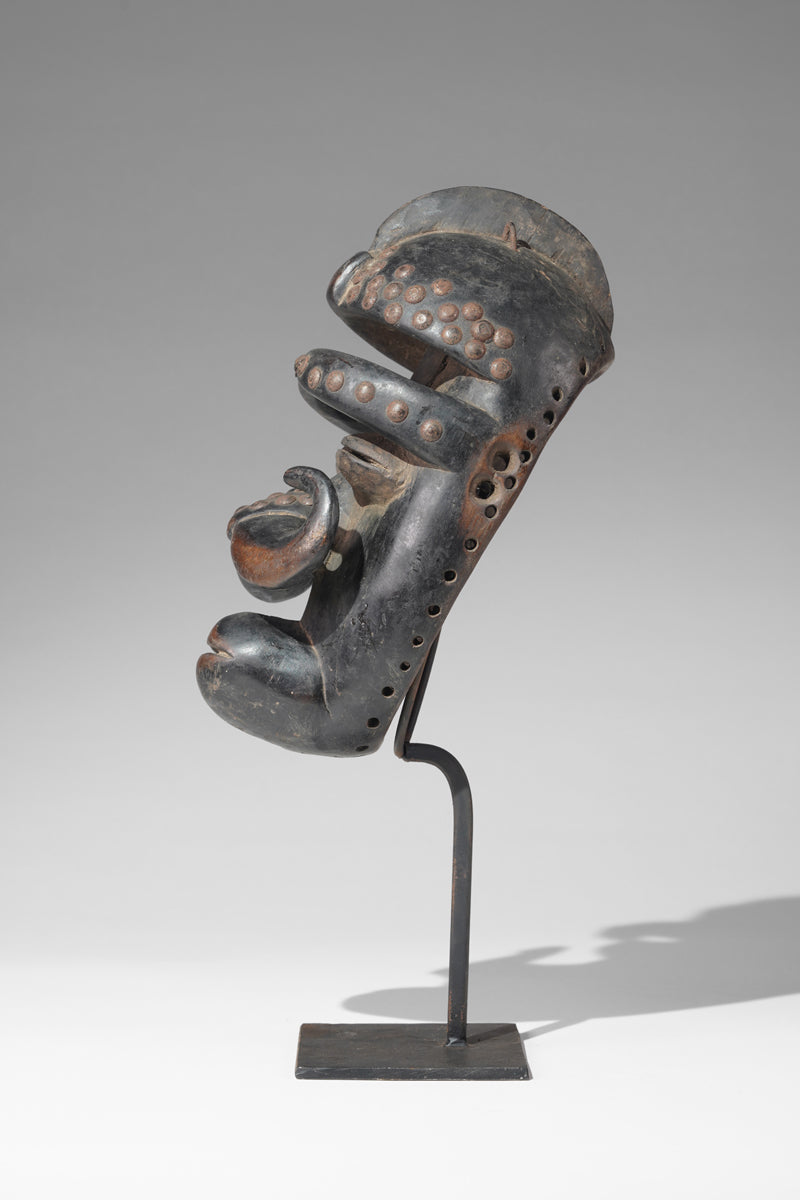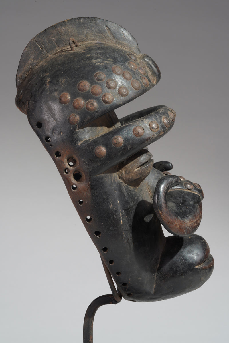 Bété masks are often characterized by their bold and expressive forms, featuring large, rounded eyes, prominent noses, and wide mouths with bared teeth. Many masks incorporate animalistic elements, such as horns or crests, symbolizing strength and spiritual power. The designs frequently use strong geometric patterns and a limited palette dominated by black, white, and red, which enhance their dramatic effect during performances.