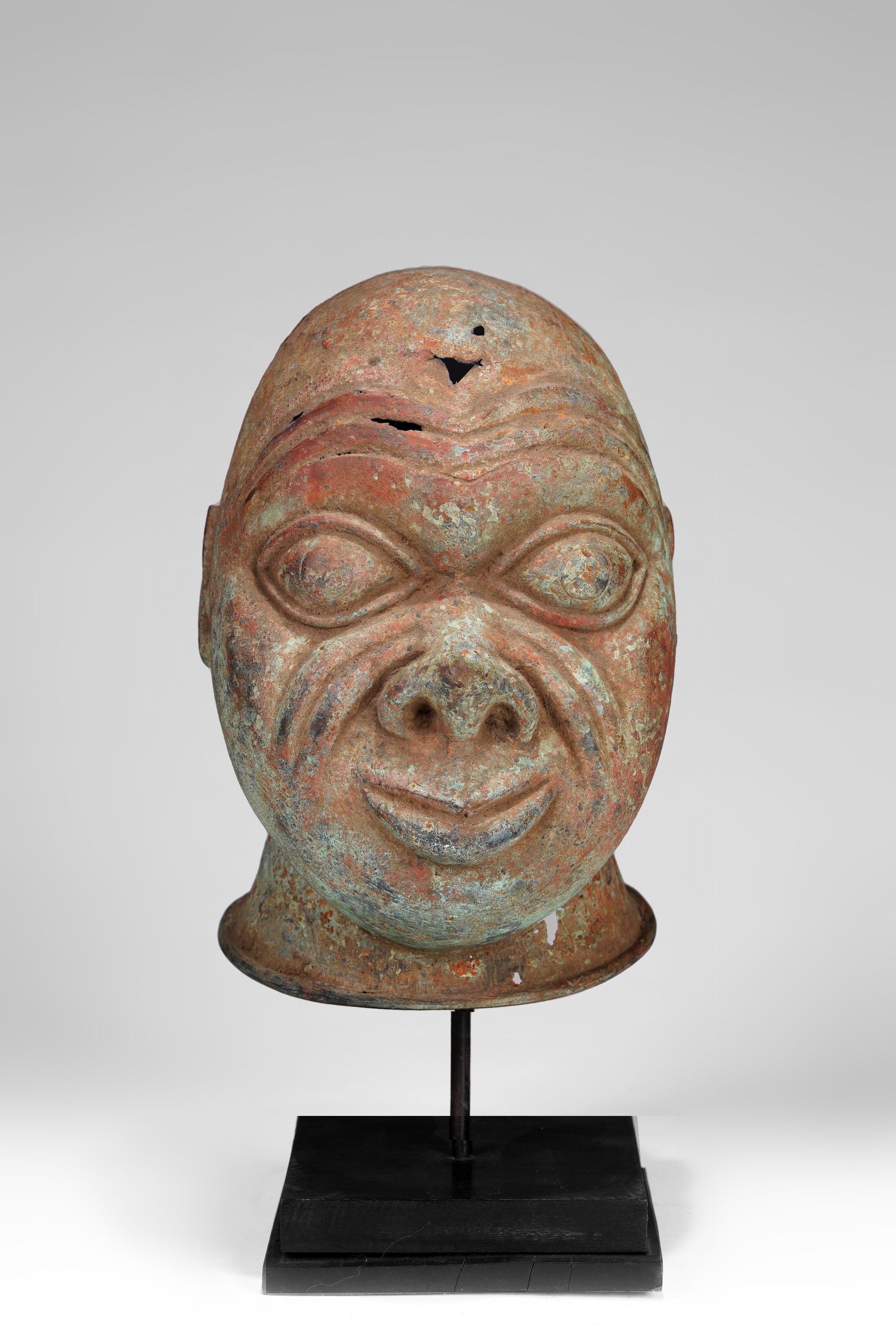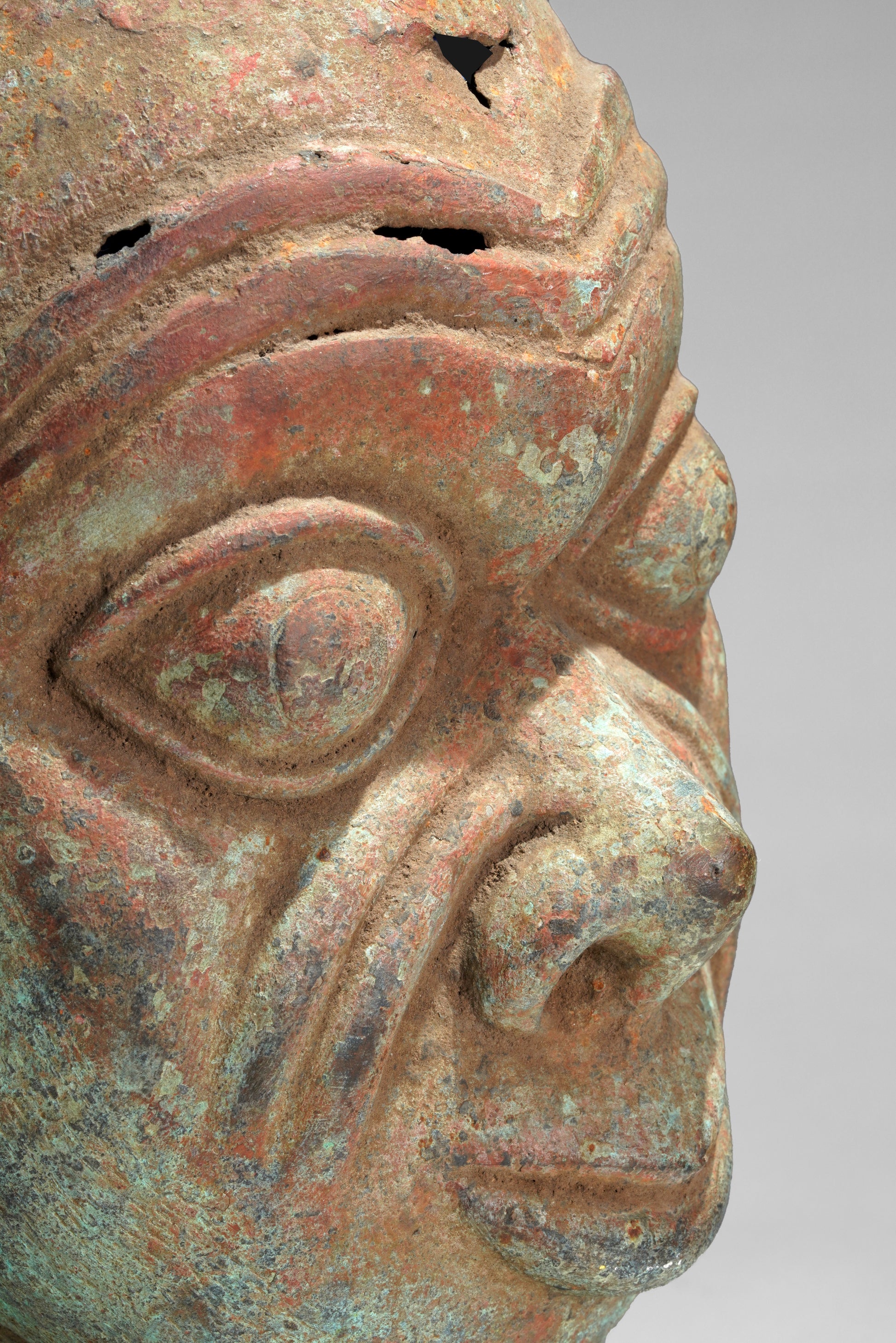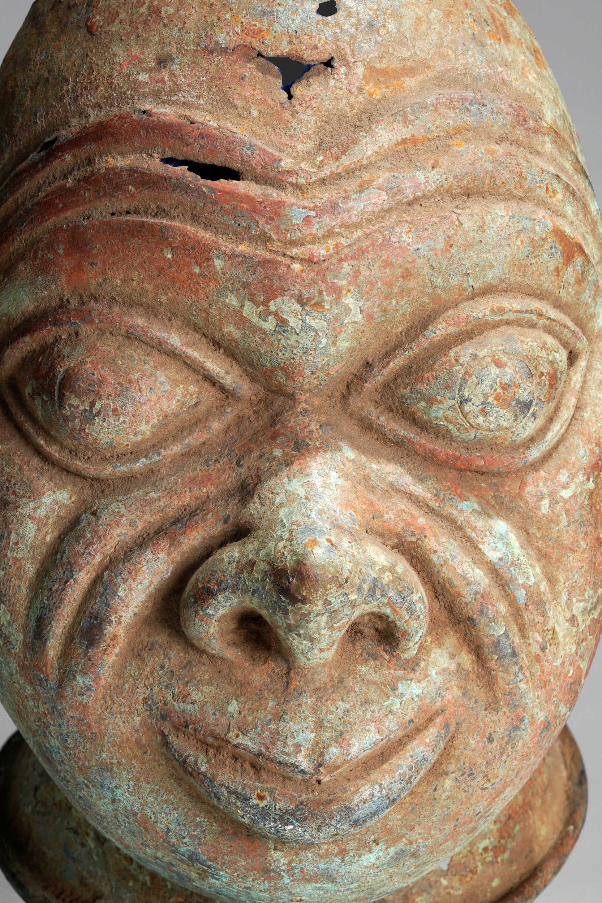 A bronze head in the style of Tada, different layers of oxidized patina, some small holes of the thin-walled bronze, TL-Test Kotalla 420 years +/- 20,5 percent.