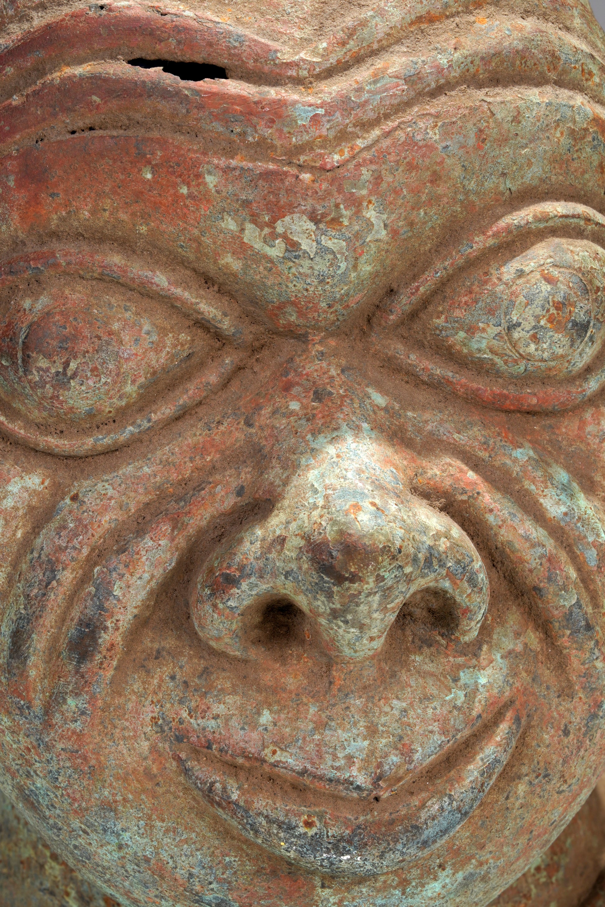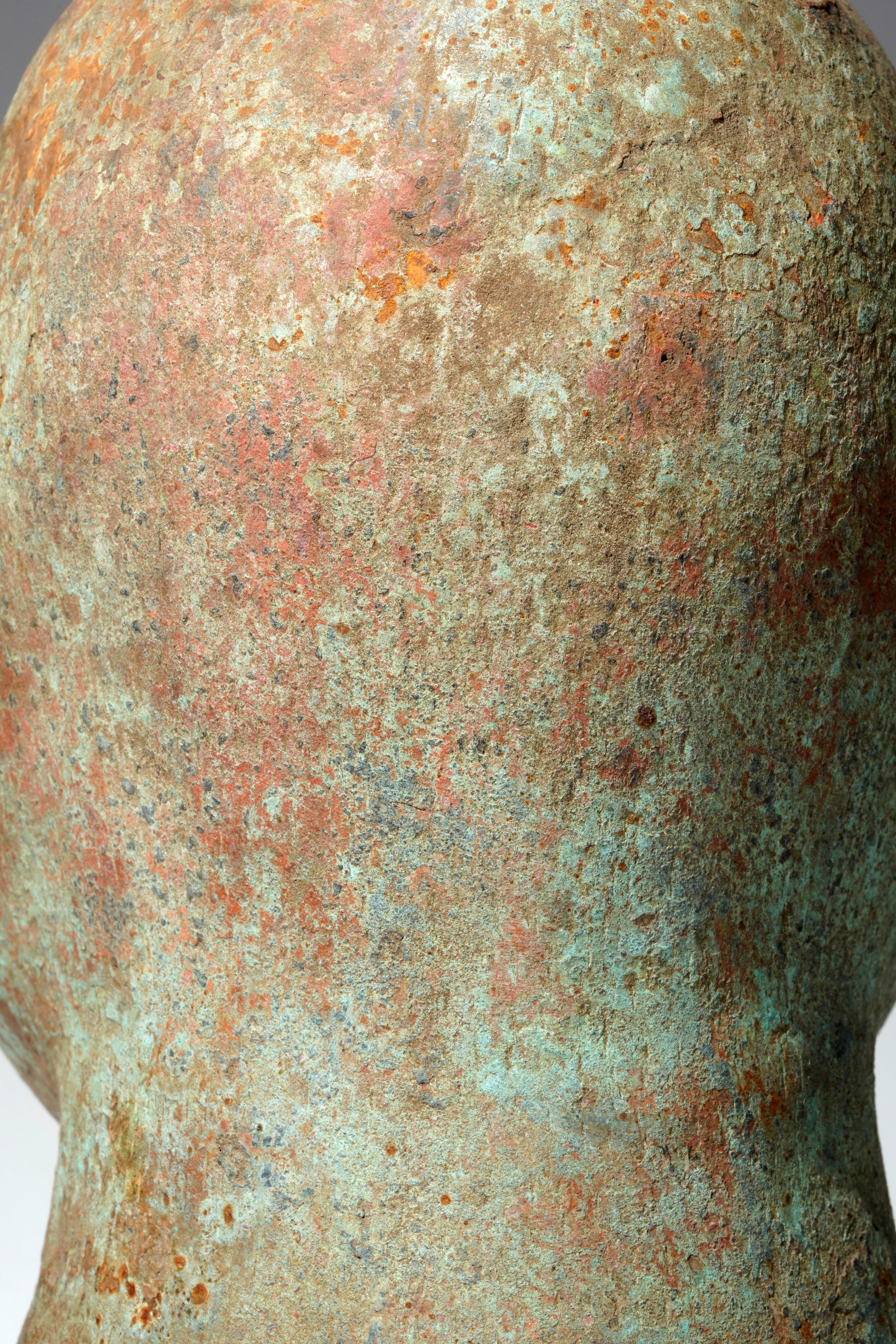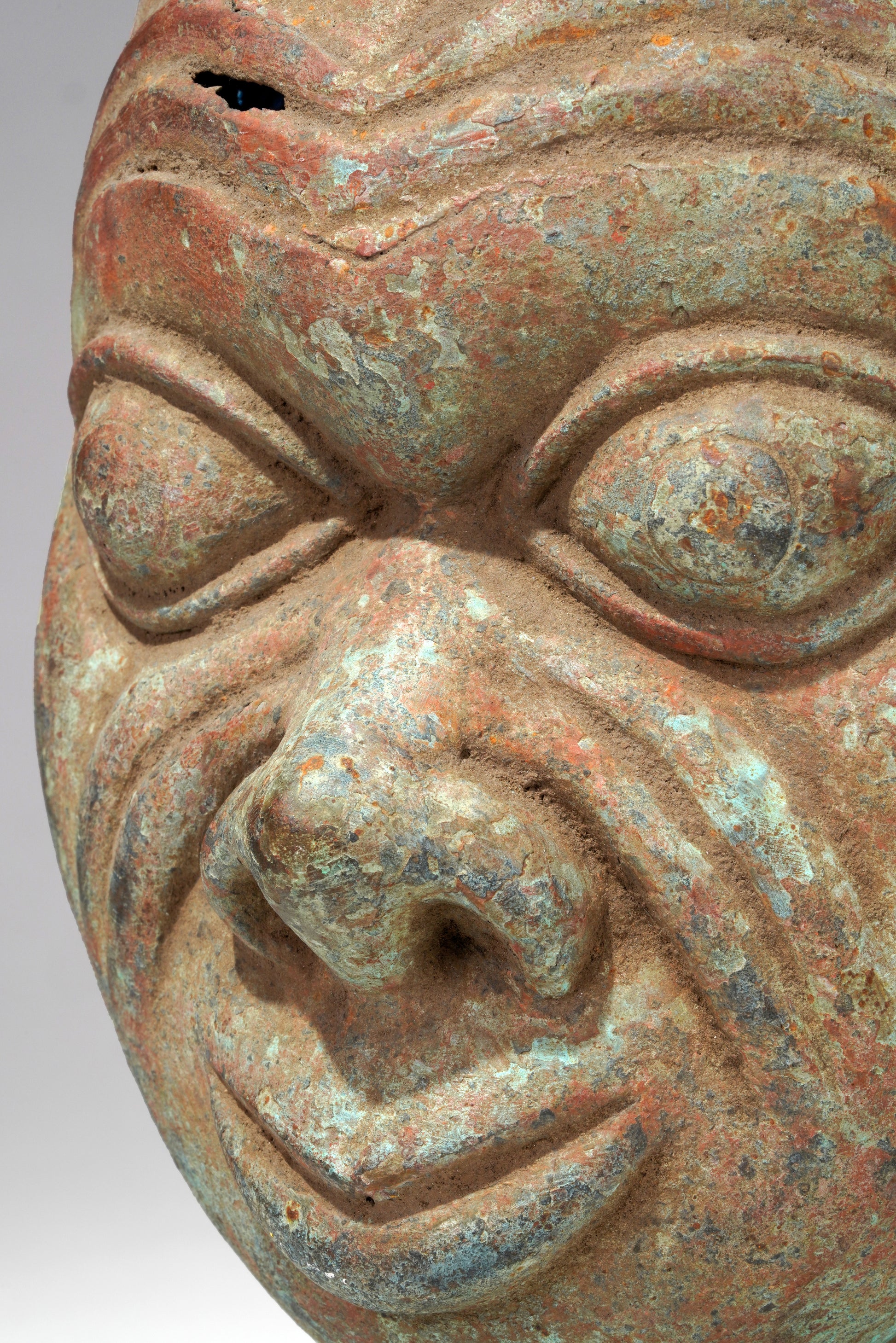 A bronze head in the style of Tada, different layers of oxidized patina, some small holes of the thin-walled bronze, TL-Test Kotalla 420 years +/- 20,5 percent.