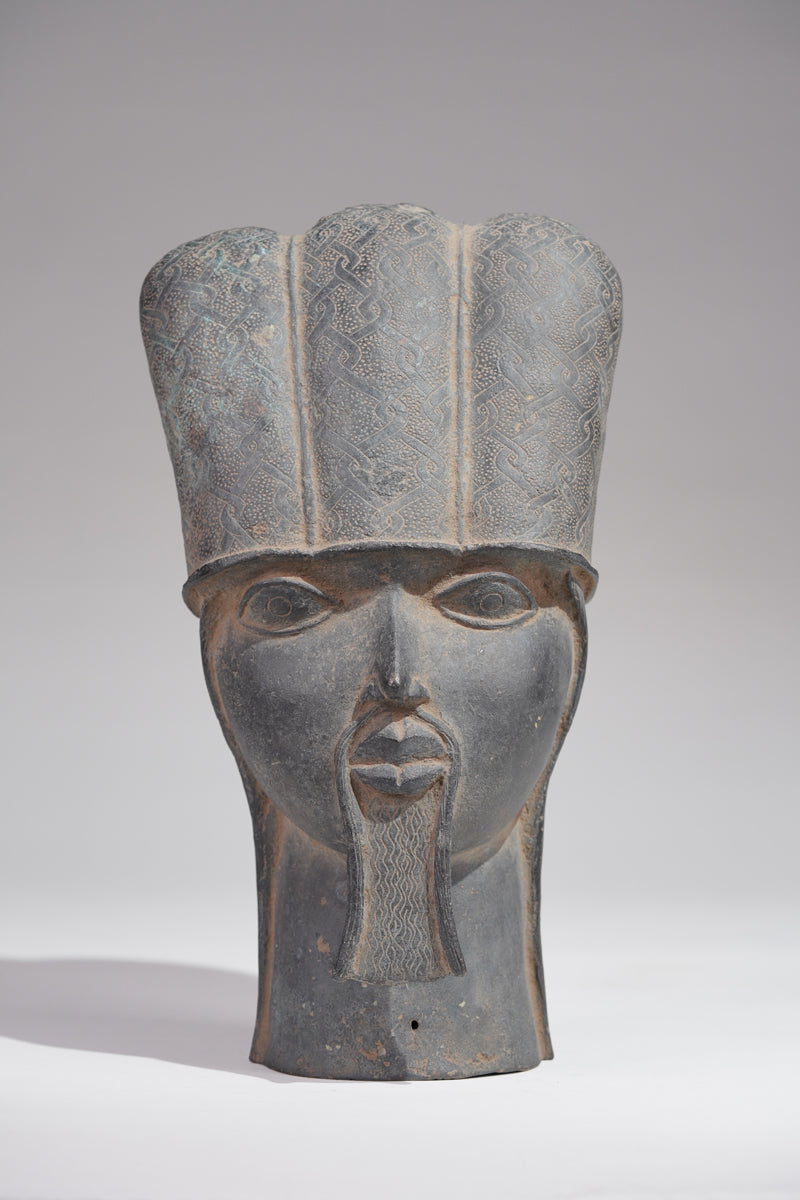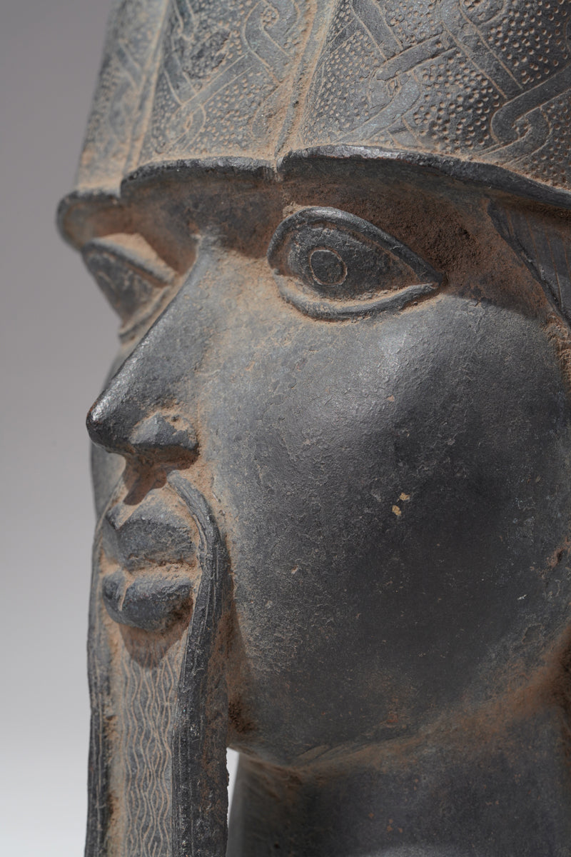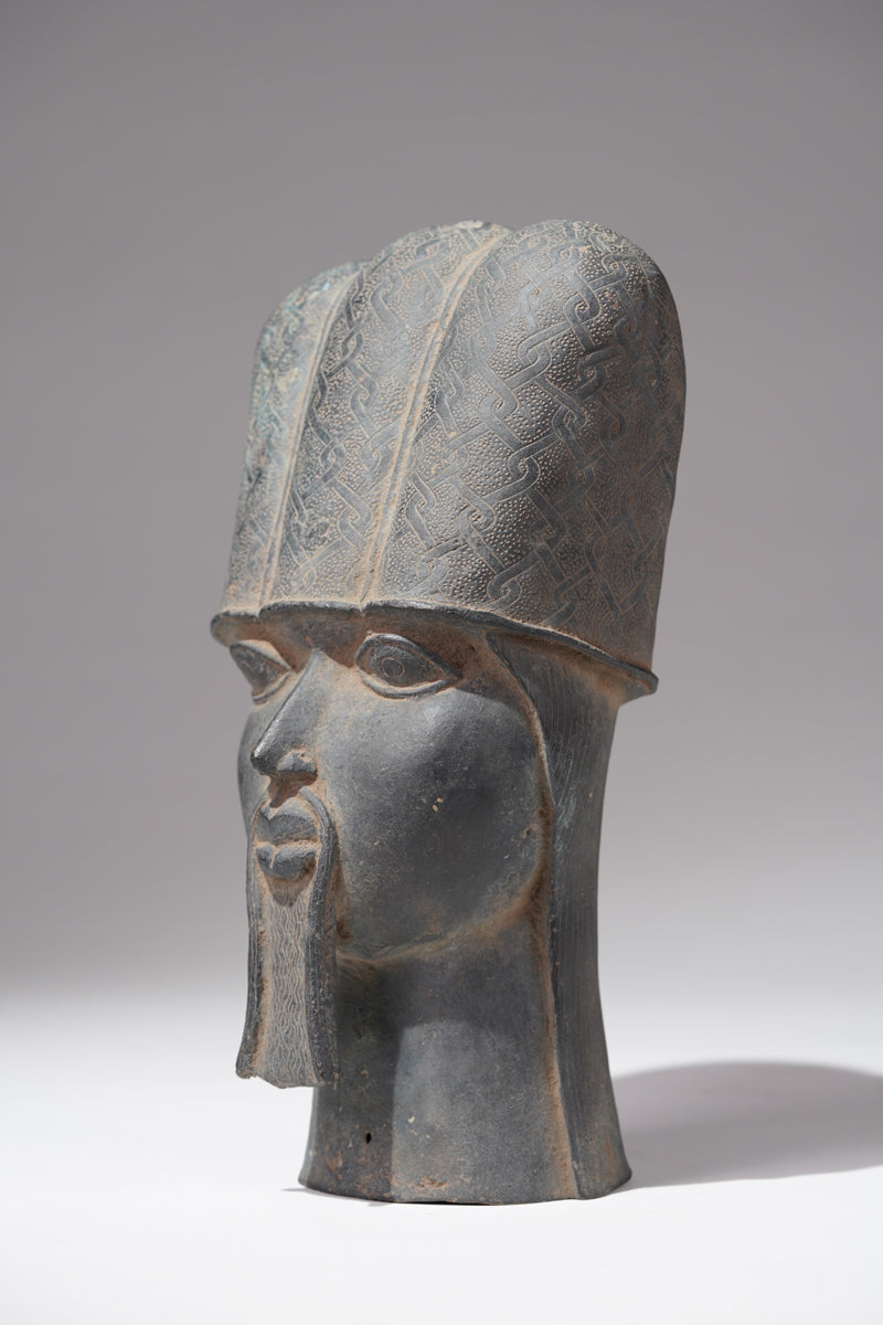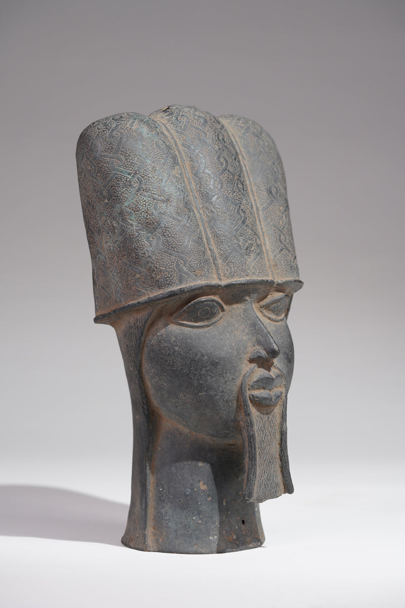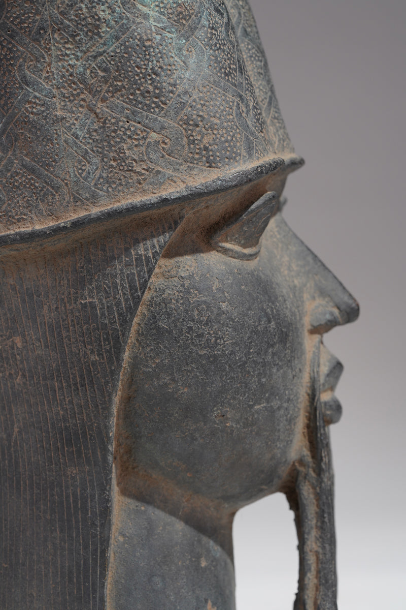 A Bronze head of a Portuguese in the style of Benin, a large cylindrical neck, the face is composed of delicate features of a closed bulbous mouth, surrounded by a straight mustache and thin rectangular goatee, small pointed nose, two eyes, large, opened, with pupils showing, they both are looking downwards, the top of the head is adorned with a large three part hat, onto which are double wooden flange, which, according of Kathryn Wysocki Gunch, belong to the reign of Oba Orhogbua 1550 - 1578 and not of the reign of his father Oba Esigie 1504 - 1550; There is some damage done at the top of the headdress, of visible holes. Certificate of provenance.