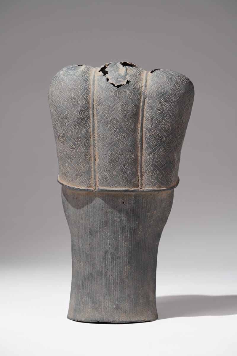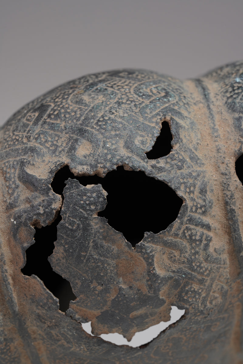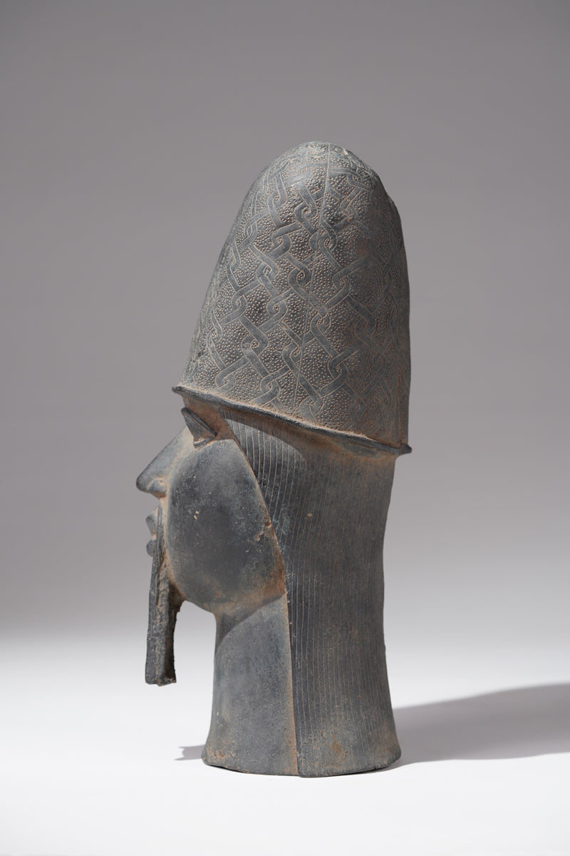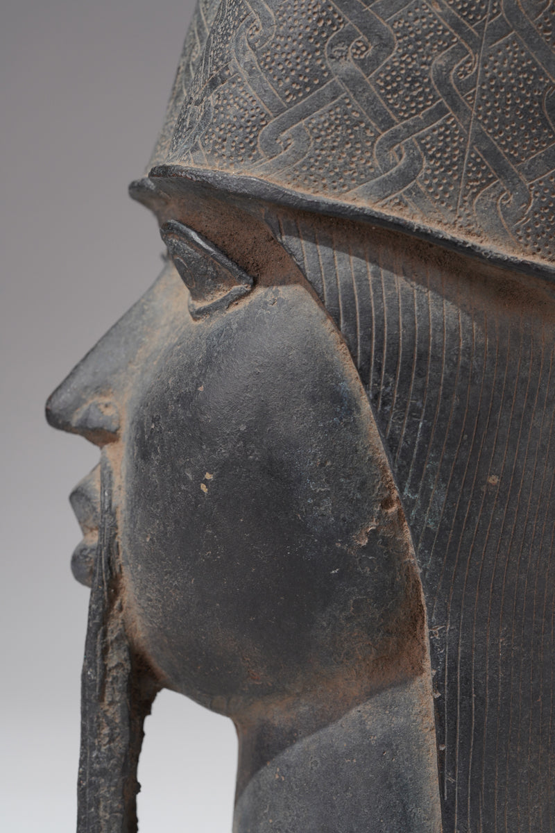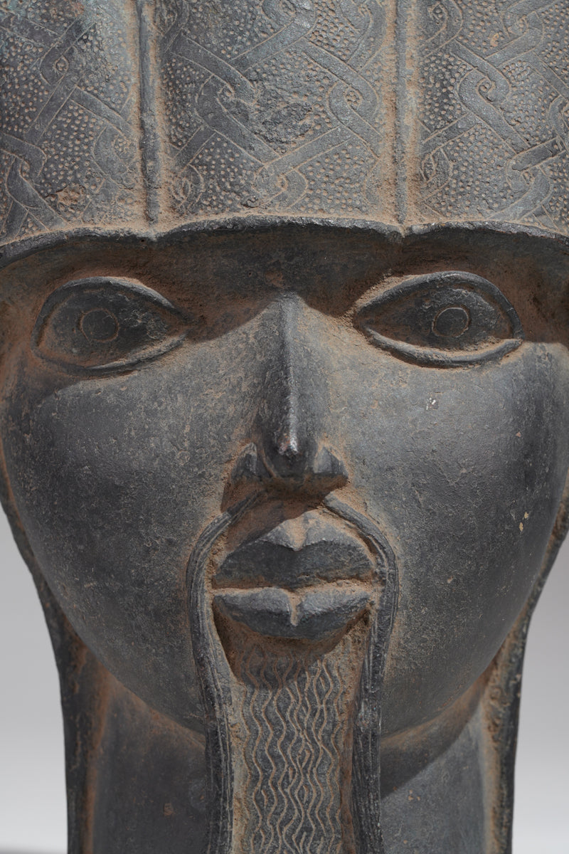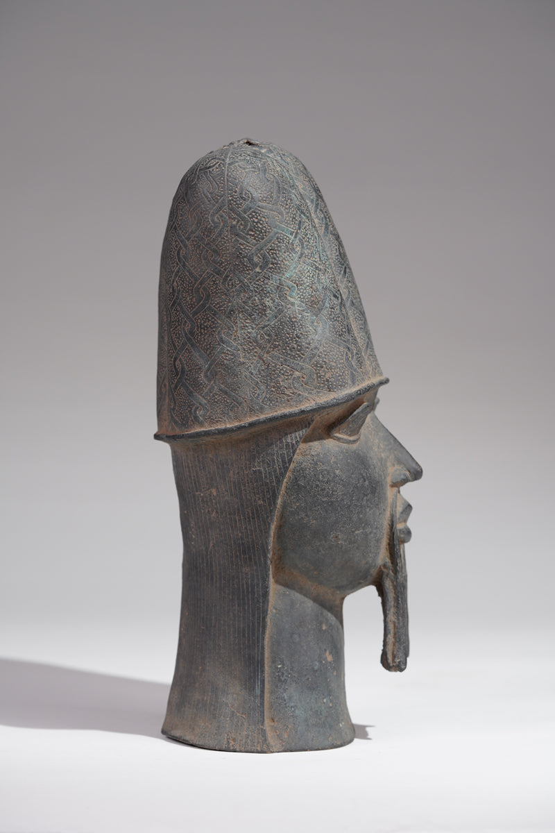 A Bronze head of a Portuguese in the style of Benin, a large cylindrical neck, the face is composed of delicate features of a closed bulbous mouth, surrounded by a straight mustache and thin rectangular goatee, small pointed nose, two eyes, large, opened, with pupils showing, they both are looking downwards, the top of the head is adorned with a large three part hat, onto which are double wooden flange, which, according of Kathryn Wysocki Gunch, belong to the reign of Oba Orhogbua 1550 - 1578 and not of the reign of his father Oba Esigie 1504 - 1550; There is some damage done at the top of the headdress, of visible holes. Certificate of provenance.