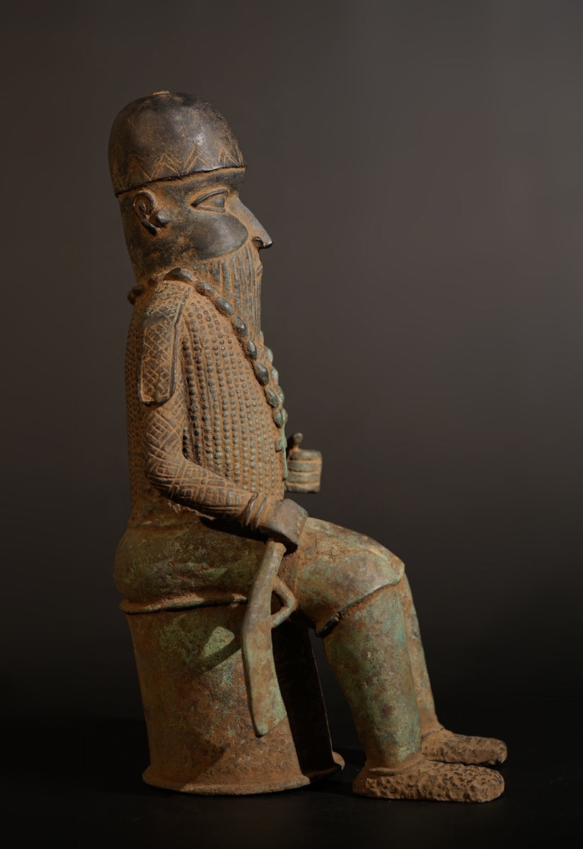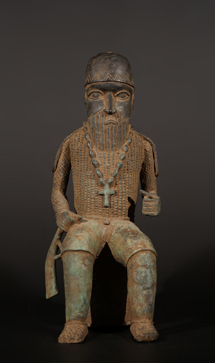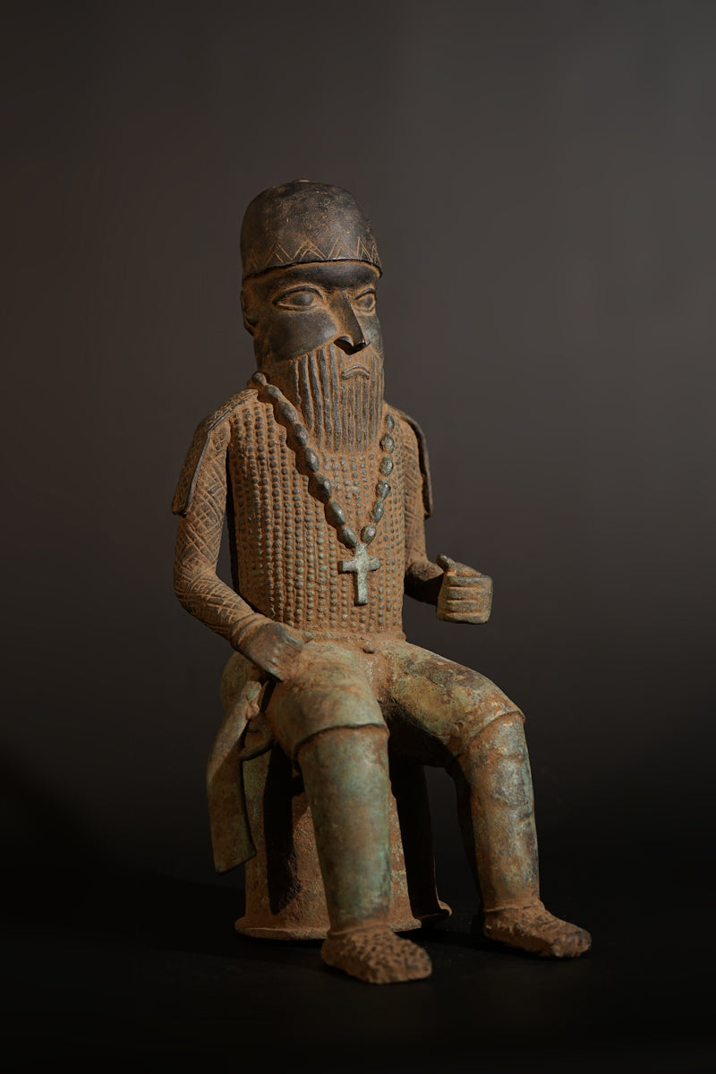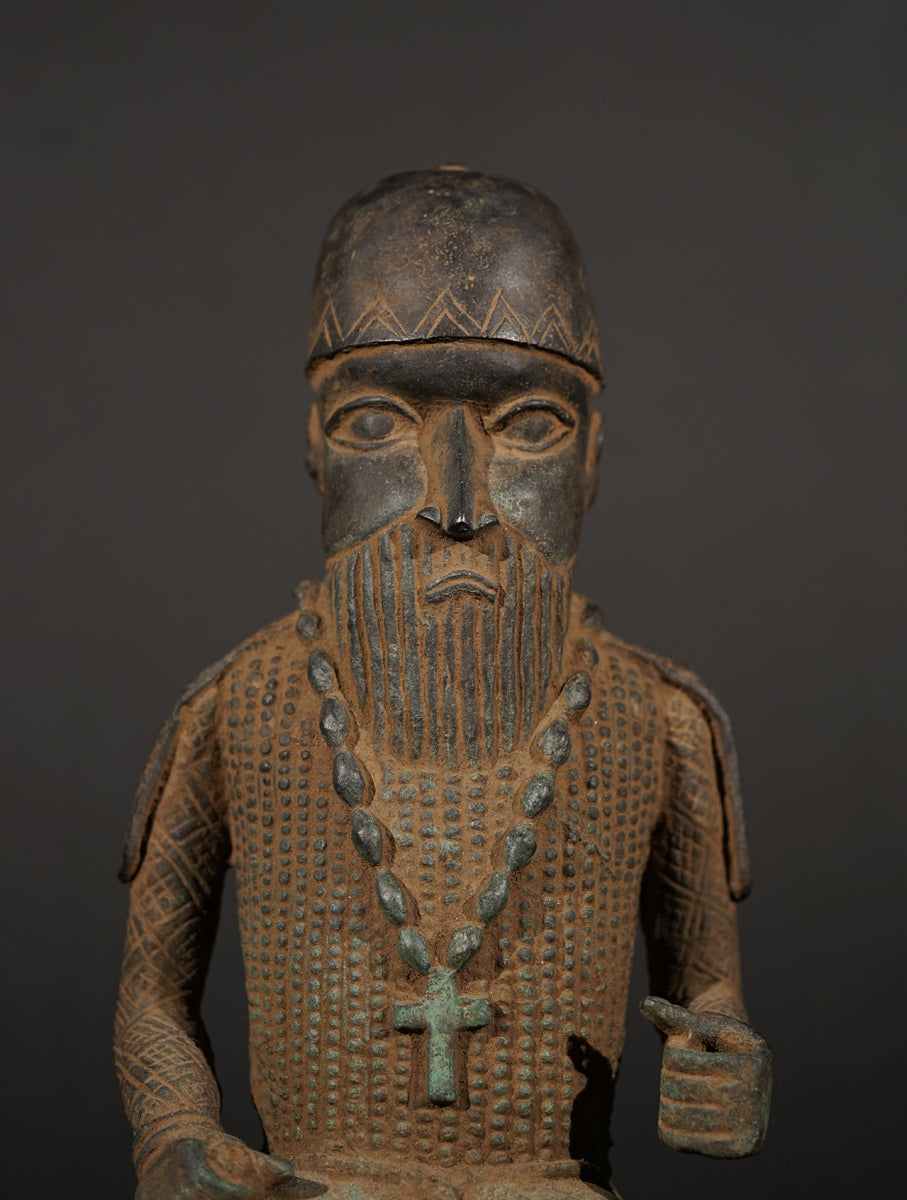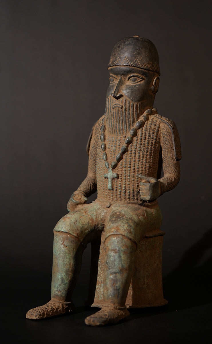 This striking Bronze in the style of Benin, represents an upright sitting Portuguese soldier. He wears a finely worked chain armour with shoulder protection over a shirt decorated with large and small squares, knee-length trousers and low shoes. Around his neck hangs a rosary-like thick chain with a cross. His left hand is closed around an object which is lost, the right hand holds a musket whose barrel has broken off. The buttocks of the soldier are outstretching and he is sitting on a cylindrical chair with a "here I am and here I will stay" habit. On his head sits a round helmet with zigzag decoration at the edge. The Portuguese has a full beard, which reaches from the nostrils down to the chest. The mouth with the grimly drawn-down corners looks as if it is set on the beard, which only underlines the sinister expression. The nose is long and sharp-edged with a pointed end, the eyes are bordered by bulging eyelids and the small, close-fitting ears are set wide at the back of the head. The soldier has a bull's neck and under the helmet no hair sticks out. The artist has really used all physiognomic means to make the Portuguese soldier look powerful and imperious - and not exactly likeable; greenish oxidised patina of different encrusted layers; TL Analysis 500 years (+/-18,5 percent)