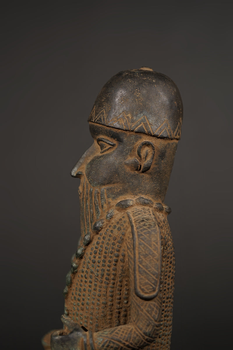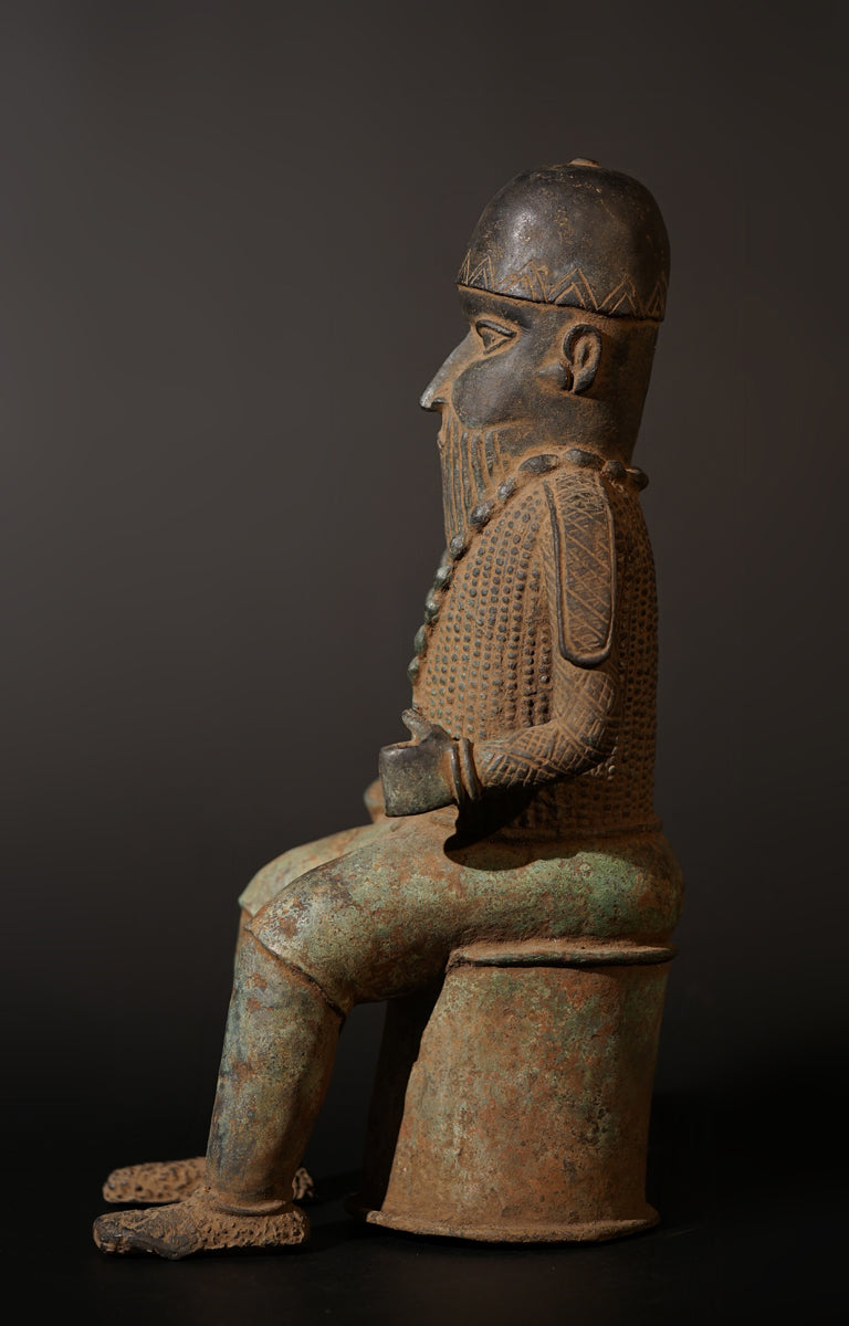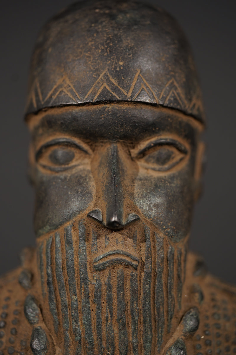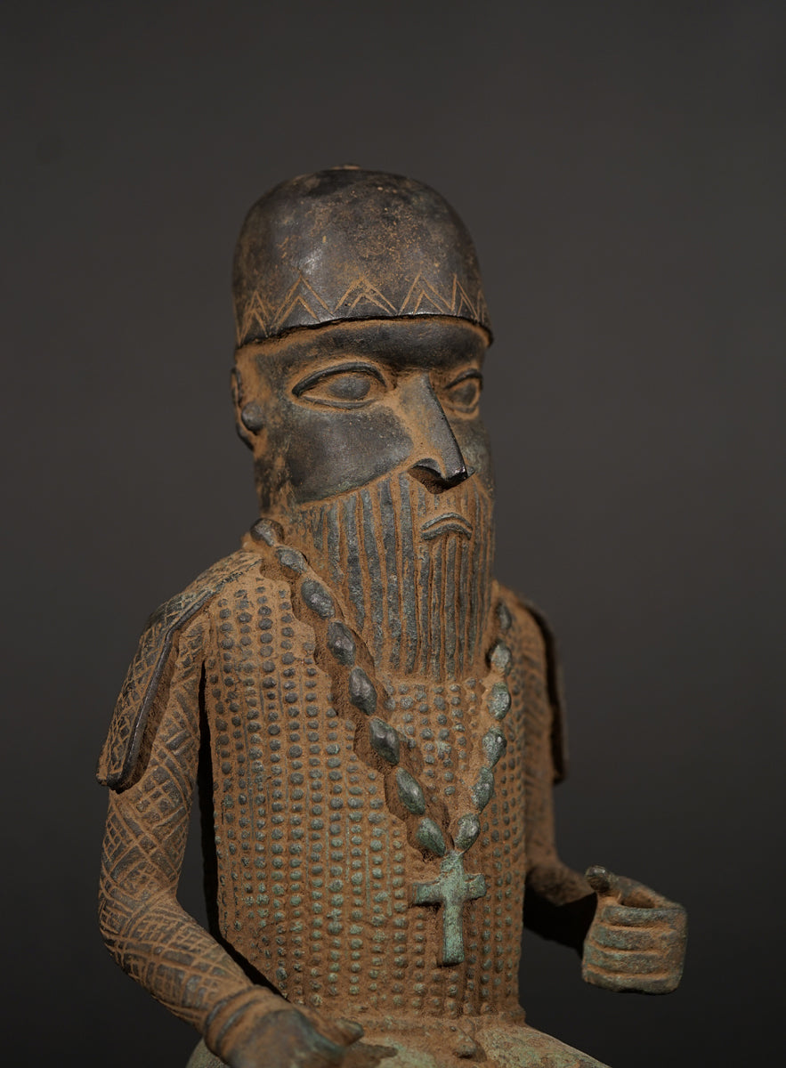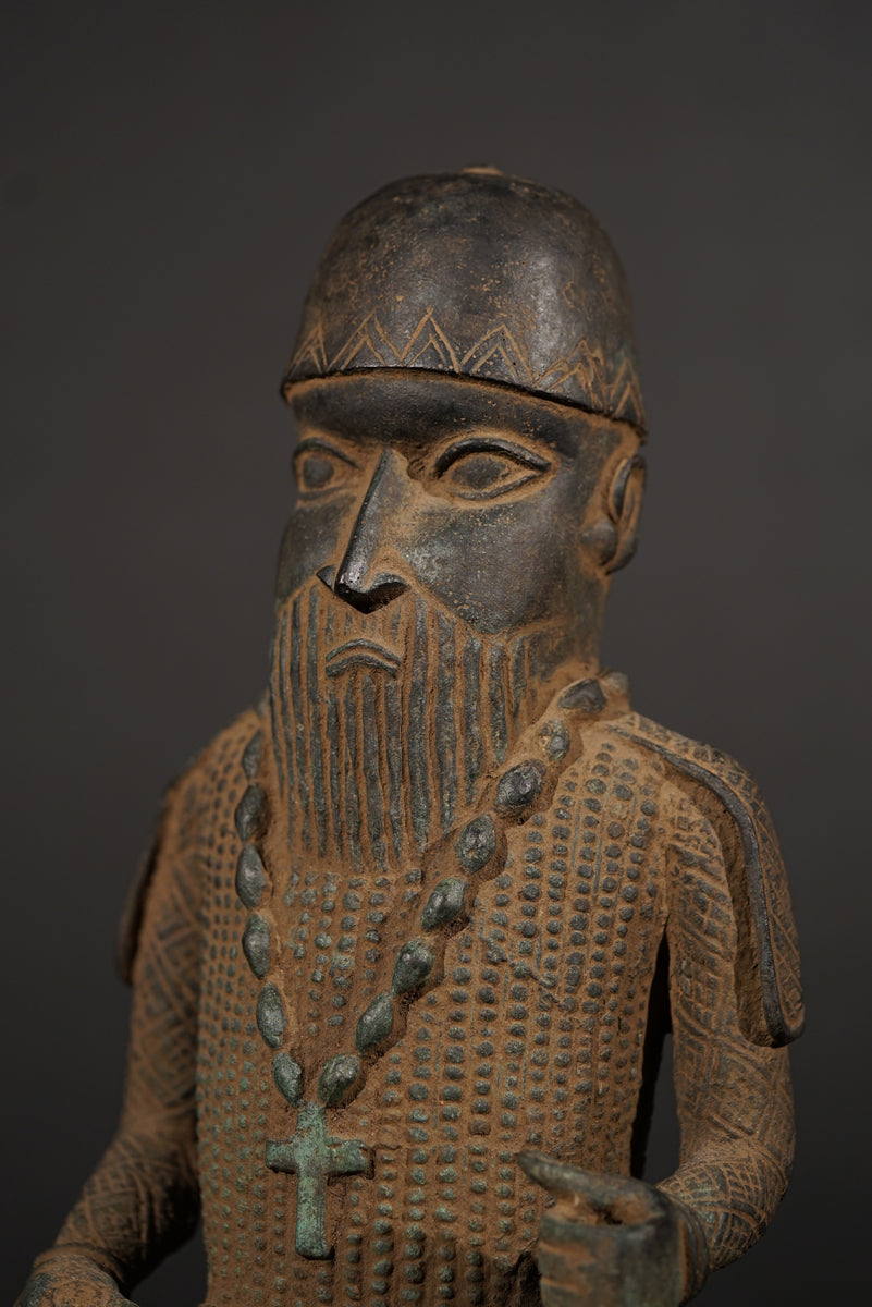 This striking Bronze in the style of Benin, represents an upright sitting Portuguese soldier. He wears a finely worked chain armour with shoulder protection over a shirt decorated with large and small squares, knee-length trousers and low shoes. Around his neck hangs a rosary-like thick chain with a cross. His left hand is closed around an object which is lost, the right hand holds a musket whose barrel has broken off. The buttocks of the soldier are outstretching and he is sitting on a cylindrical chair with a "here I am and here I will stay" habit. On his head sits a round helmet with zigzag decoration at the edge. The Portuguese has a full beard, which reaches from the nostrils down to the chest. The mouth with the grimly drawn-down corners looks as if it is set on the beard, which only underlines the sinister expression. The nose is long and sharp-edged with a pointed end, the eyes are bordered by bulging eyelids and the small, close-fitting ears are set wide at the back of the head. The soldier has a bull's neck and under the helmet no hair sticks out. The artist has really used all physiognomic means to make the Portuguese soldier look powerful and imperious - and not exactly likeable; greenish oxidised patina of different encrusted layers; TL Analysis 500 years (+/-18,5 percent)