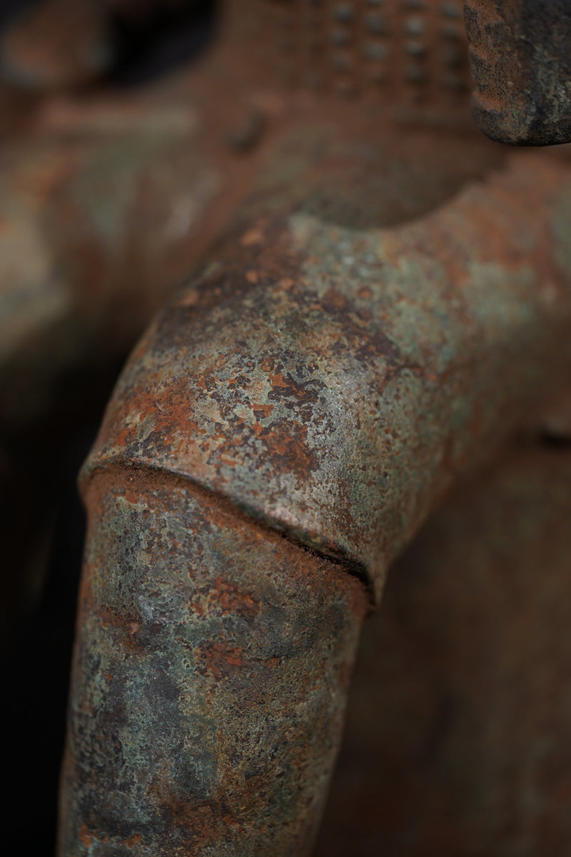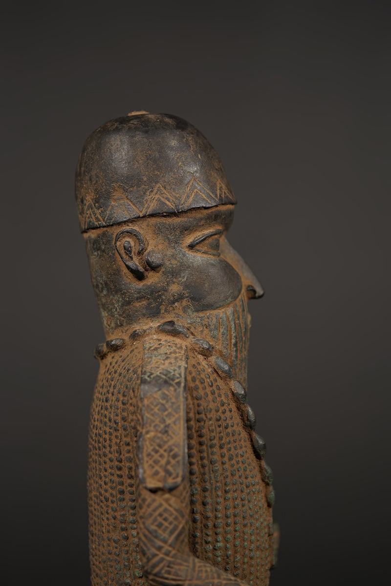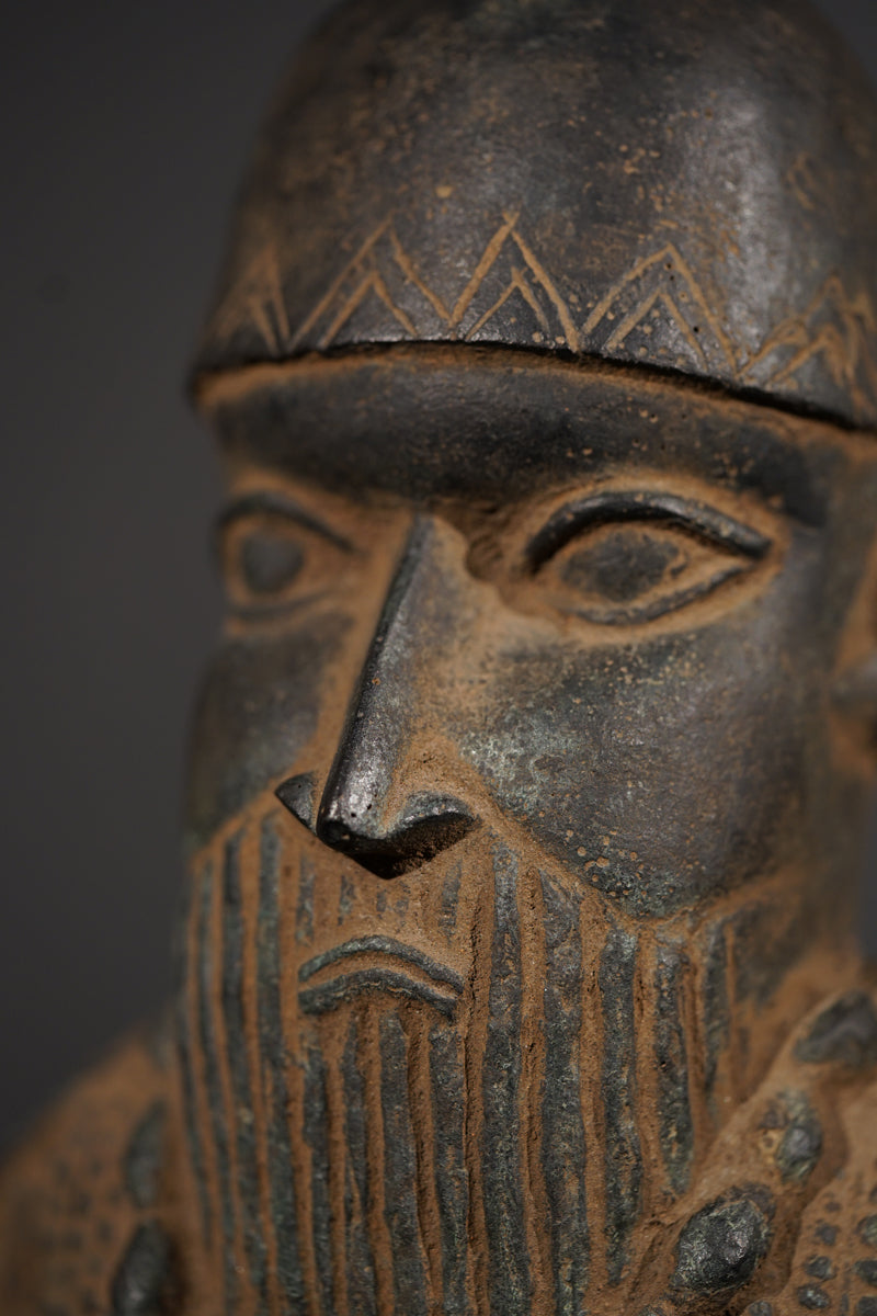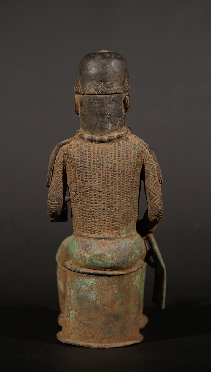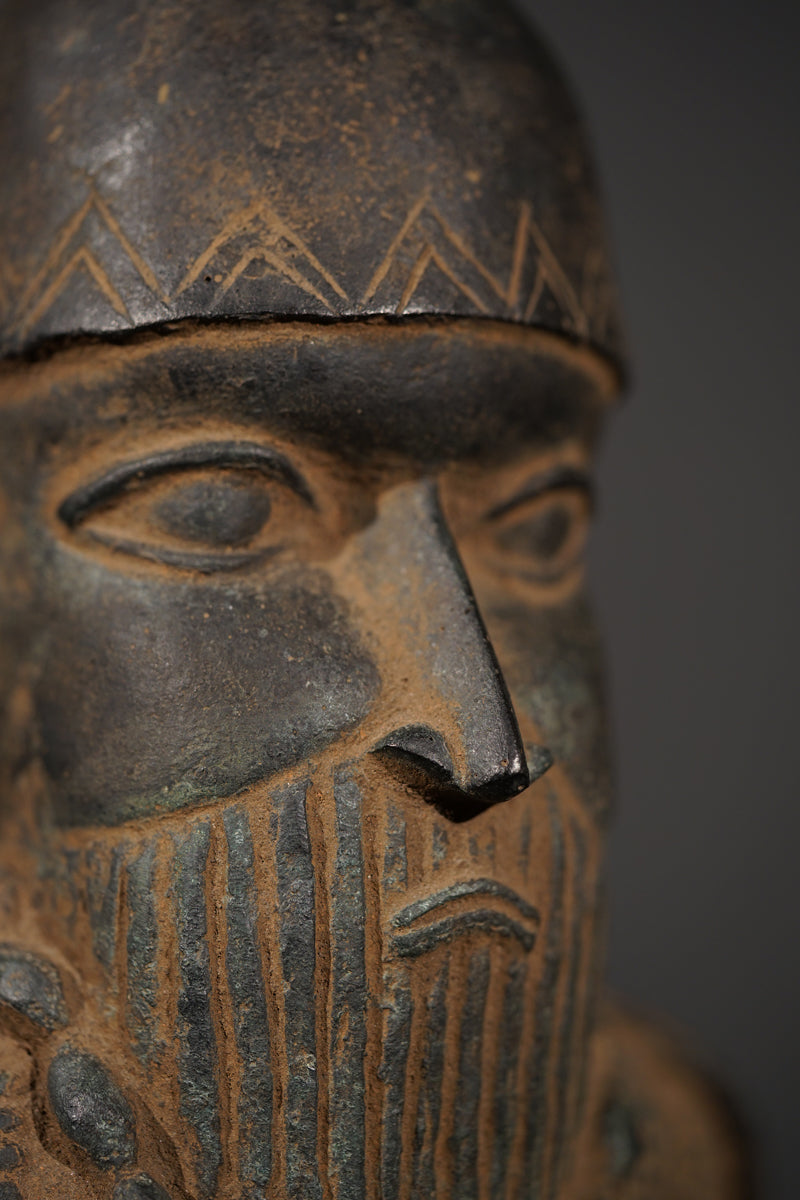 This striking Bronze in the style of Benin, represents an upright sitting Portuguese soldier. He wears a finely worked chain armour with shoulder protection over a shirt decorated with large and small squares, knee-length trousers and low shoes. Around his neck hangs a rosary-like thick chain with a cross. His left hand is closed around an object which is lost, the right hand holds a musket whose barrel has broken off. The buttocks of the soldier are outstretching and he is sitting on a cylindrical chair with a "here I am and here I will stay" habit. On his head sits a round helmet with zigzag decoration at the edge. The Portuguese has a full beard, which reaches from the nostrils down to the chest. The mouth with the grimly drawn-down corners looks as if it is set on the beard, which only underlines the sinister expression. The nose is long and sharp-edged with a pointed end, the eyes are bordered by bulging eyelids and the small, close-fitting ears are set wide at the back of the head. The soldier has a bull's neck and under the helmet no hair sticks out. The artist has really used all physiognomic means to make the Portuguese soldier look powerful and imperious - and not exactly likeable; greenish oxidised patina of different encrusted layers; TL Analysis 500 years (+/-18,5 percent)