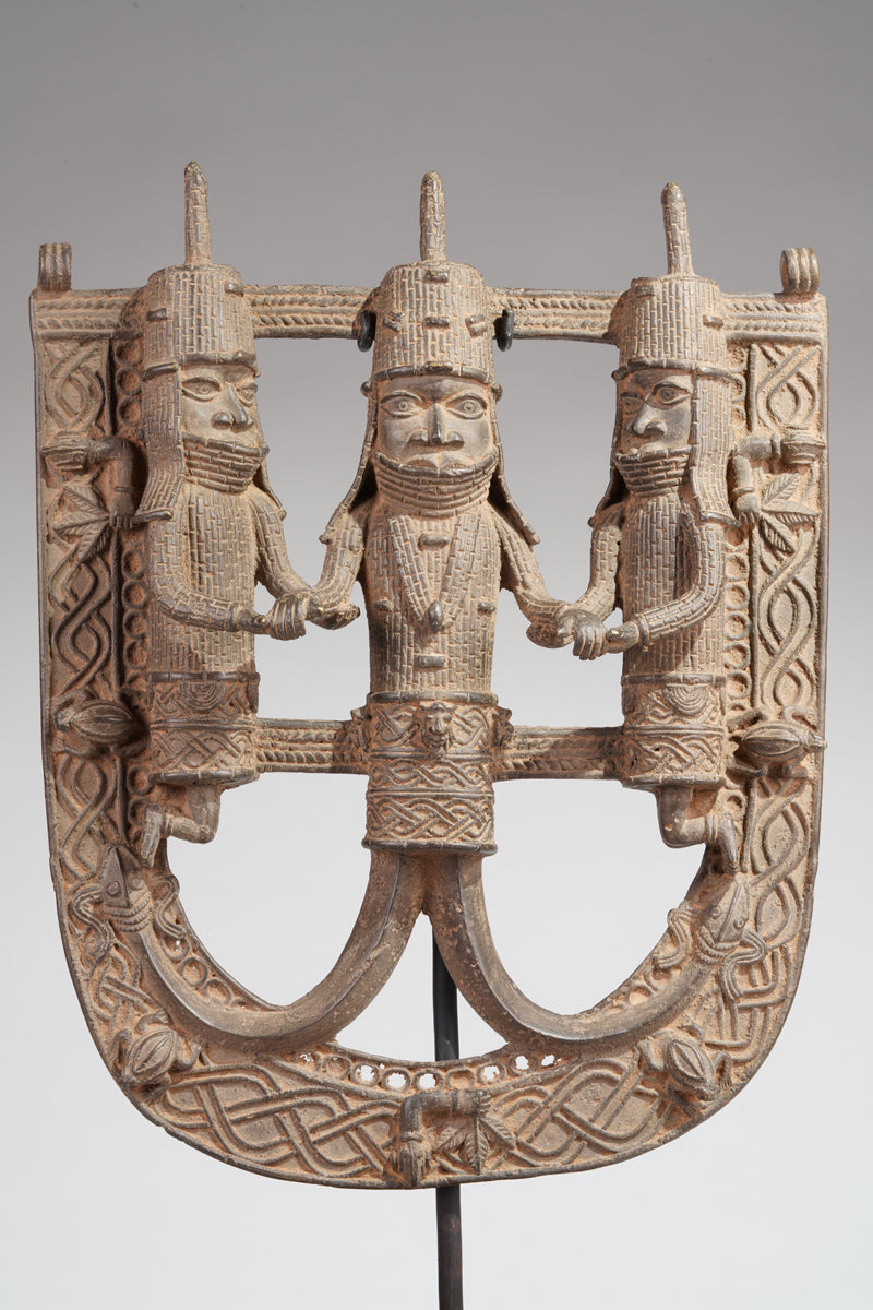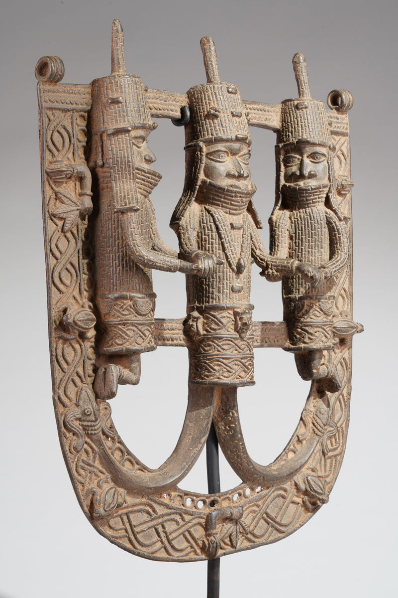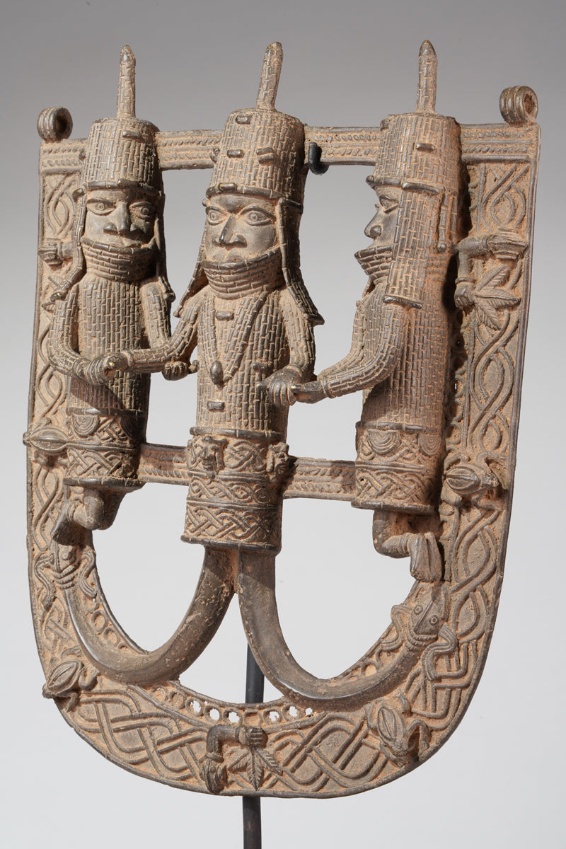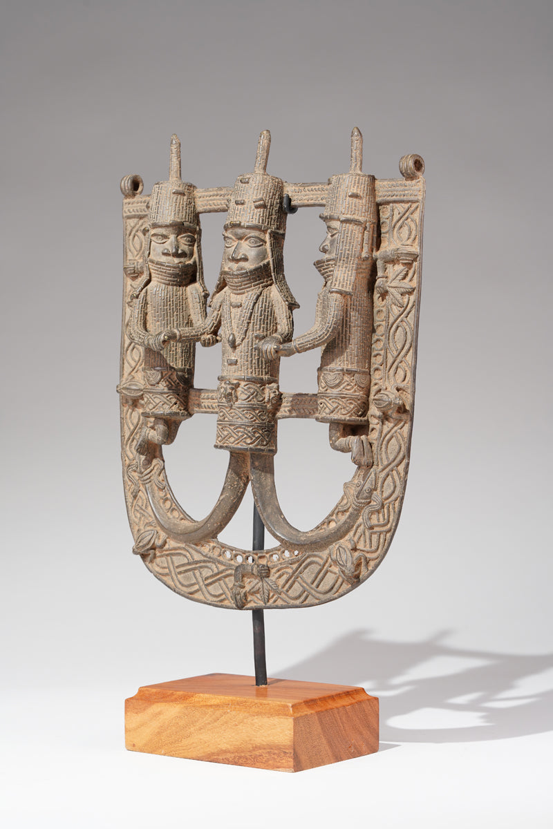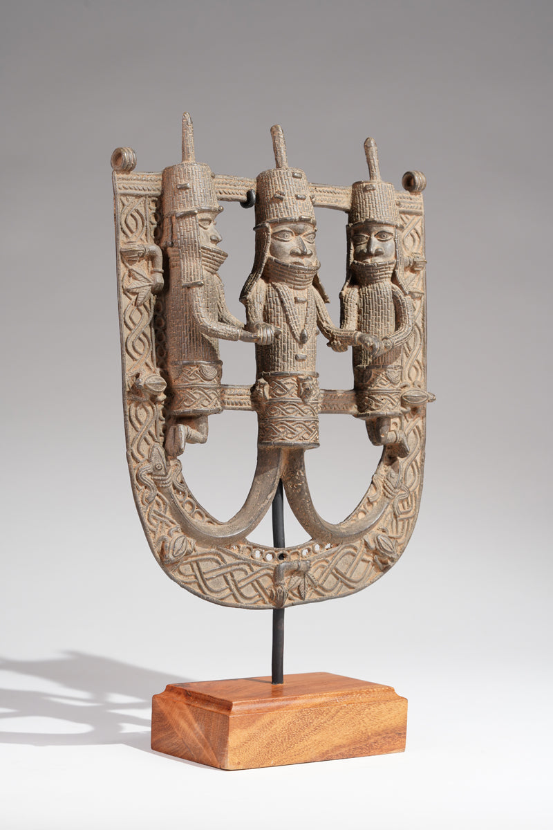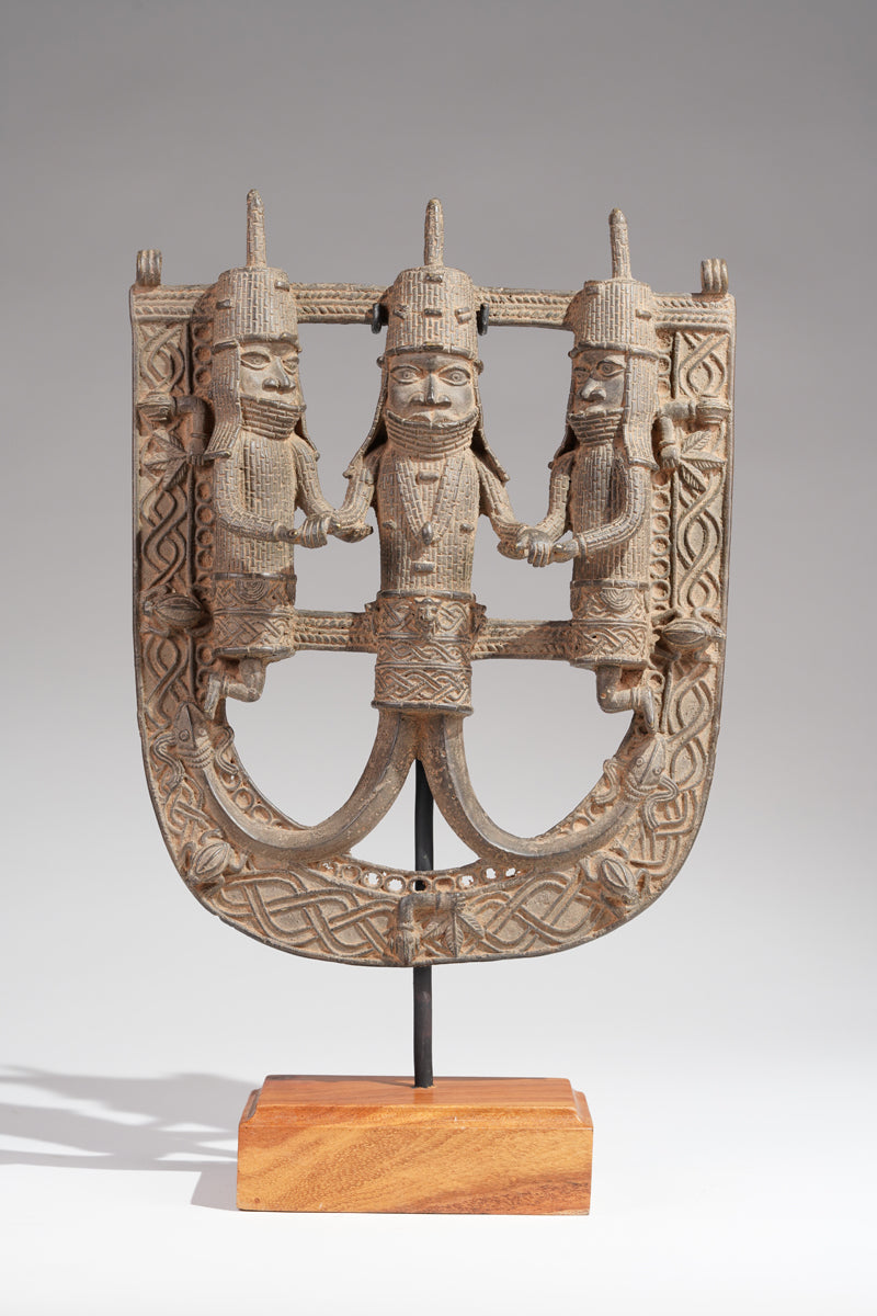 A bronze plate- Ama -. depicting the Oba in the center and two servants at the side, in u-shaped pierced through open work form, the legs are ending in curved mudfishes, of excellent condition, incl. wooden stand.