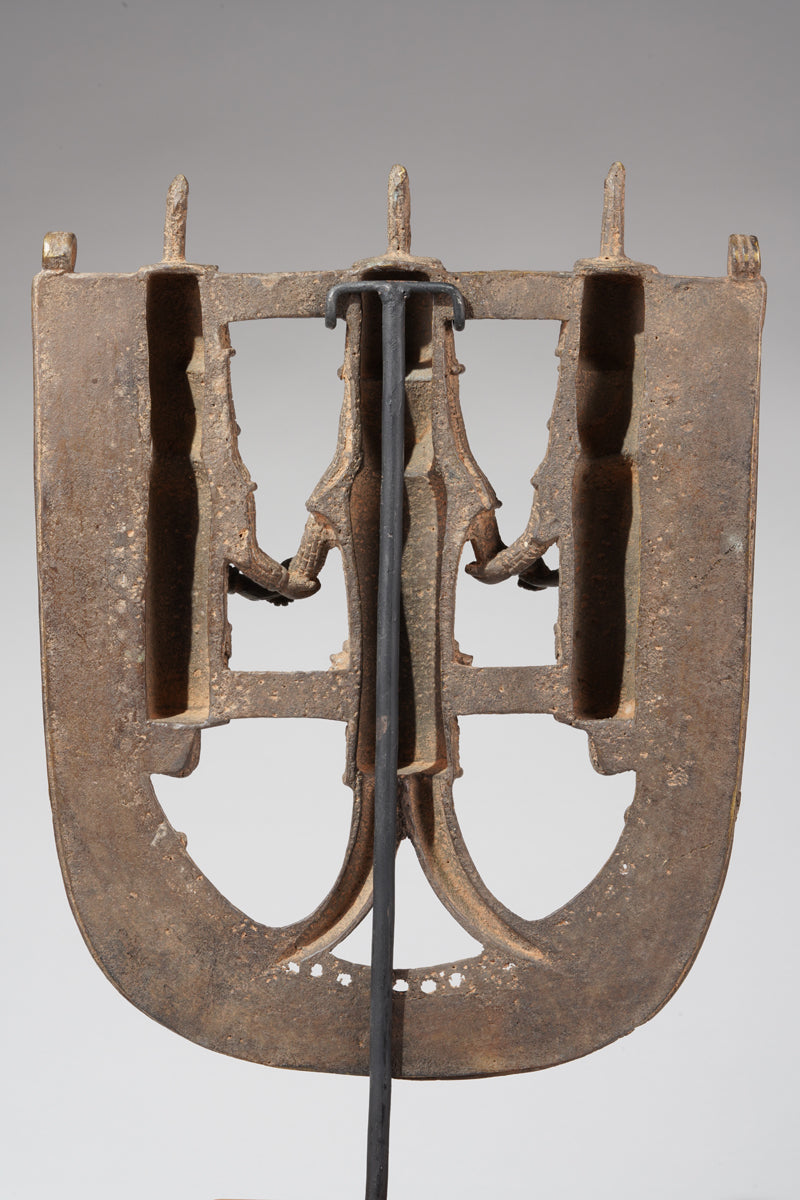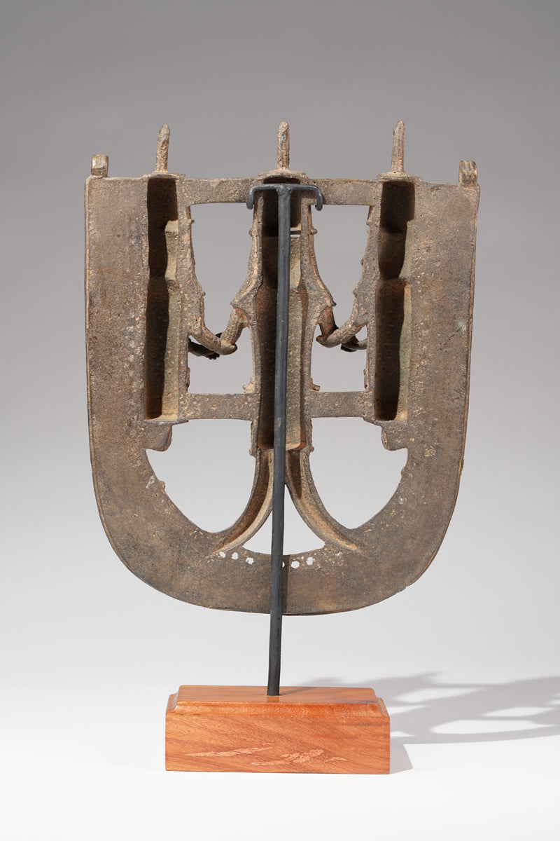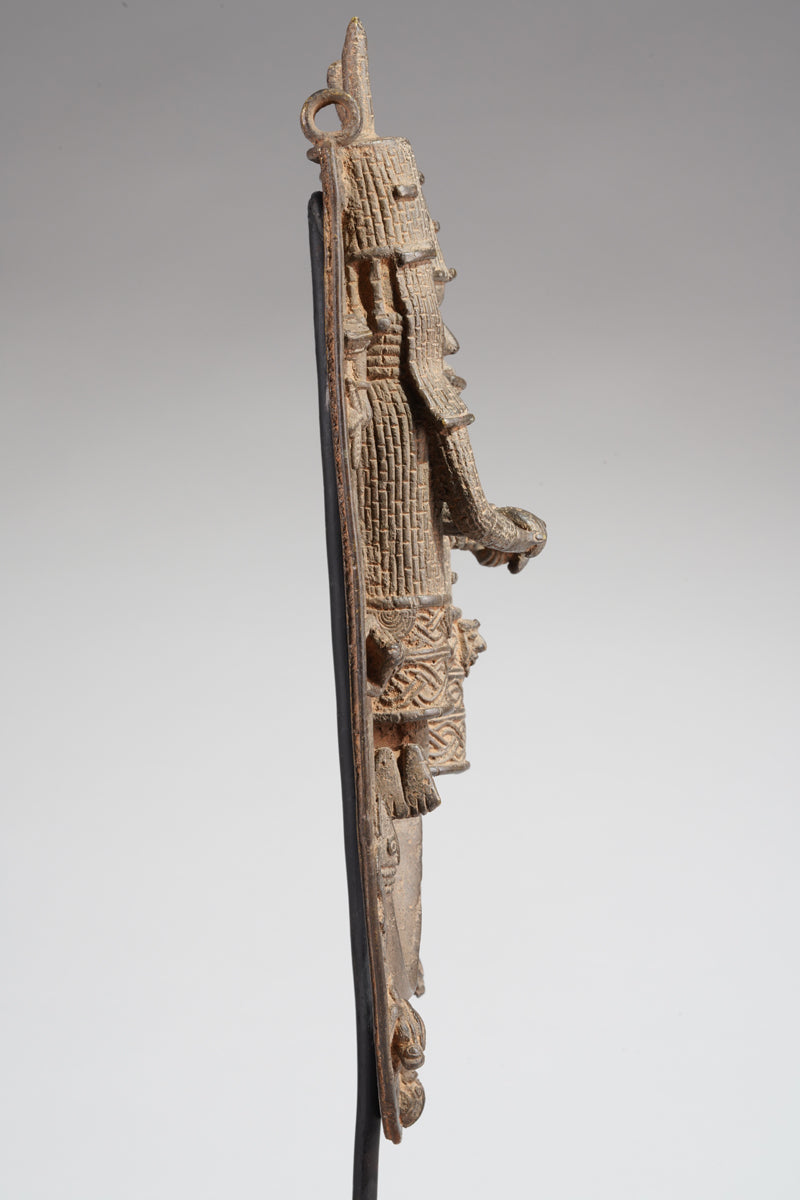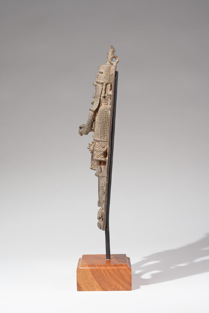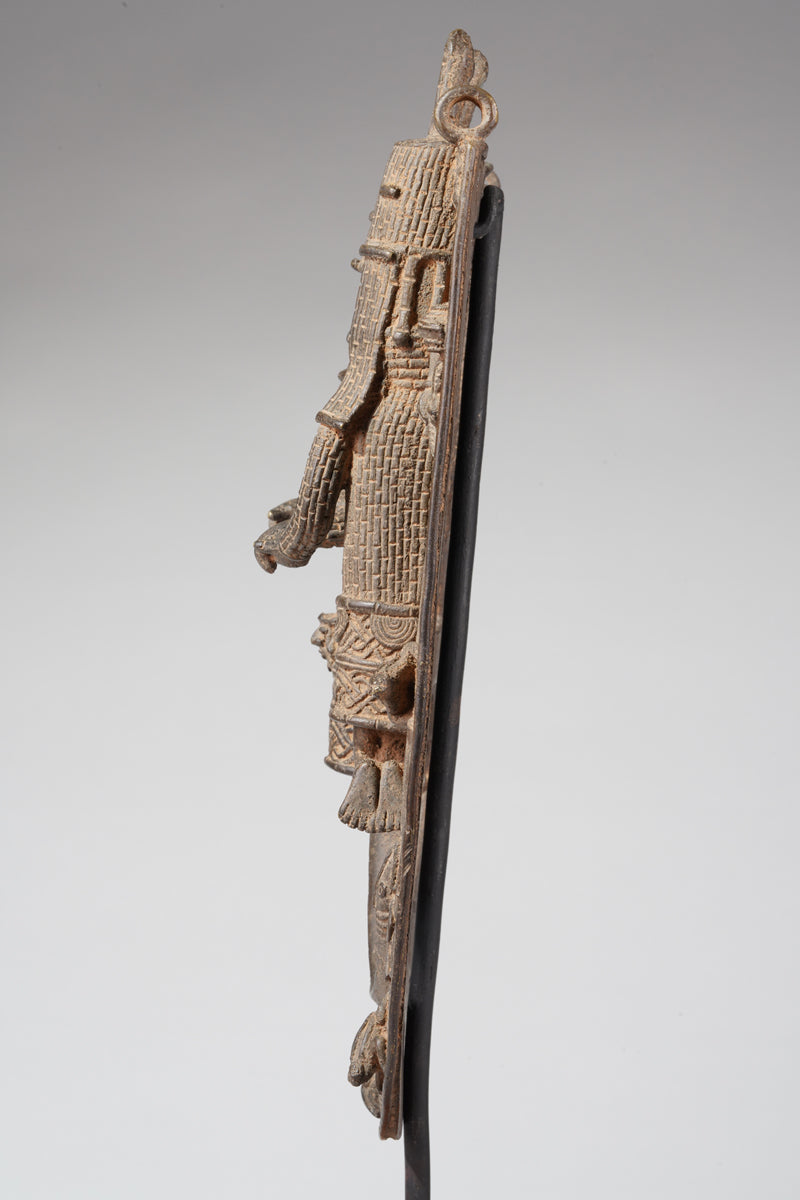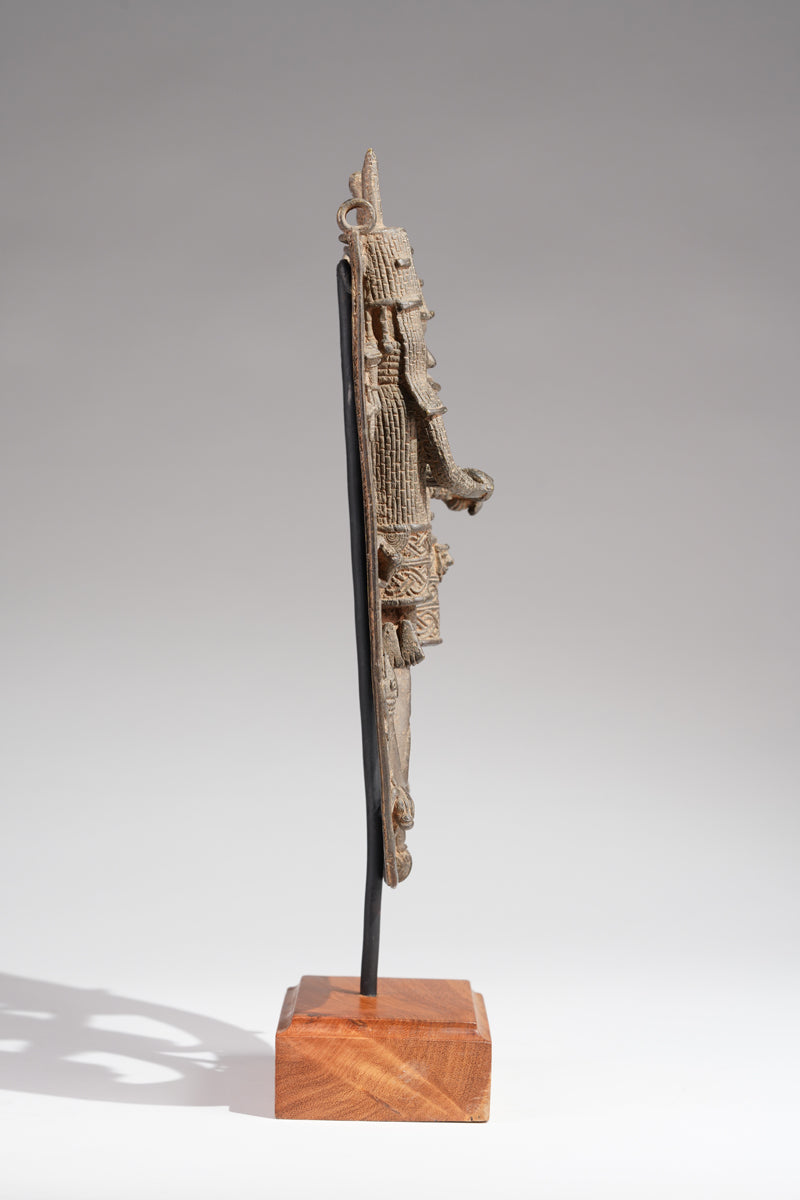 A bronze plate- Ama -. depicting the Oba in the center and two servants at the side, in u-shaped pierced through open work form, the legs are ending in curved mudfishes, of excellent condition, incl. wooden stand.