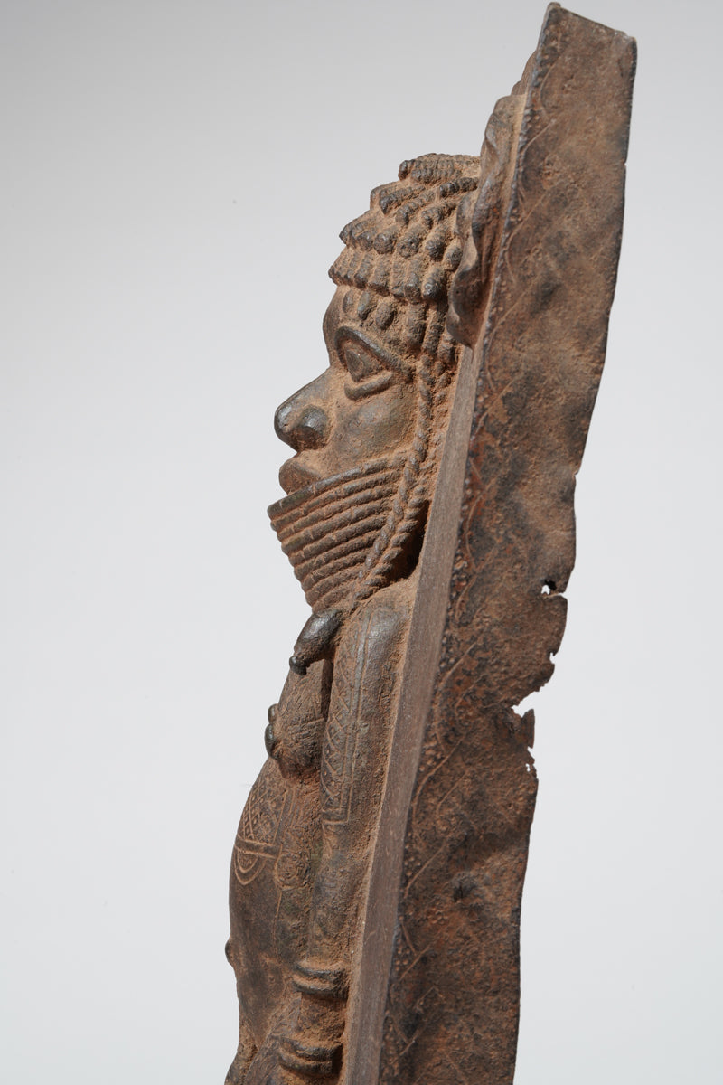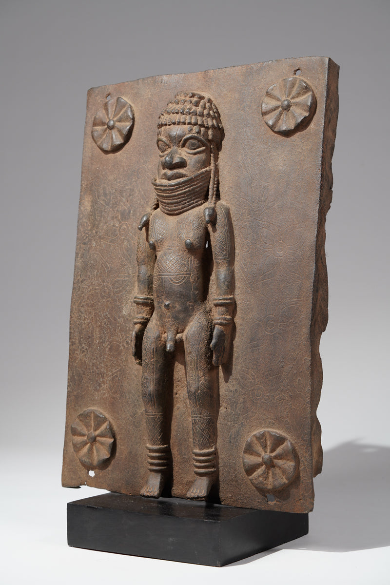 A Bronze plate in the style of Benin, Nigeria, depicting a high ranking, naked person, At the edge there is a rosette, partly pierced through for hanging.