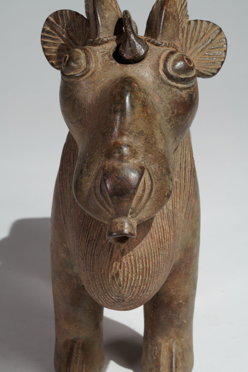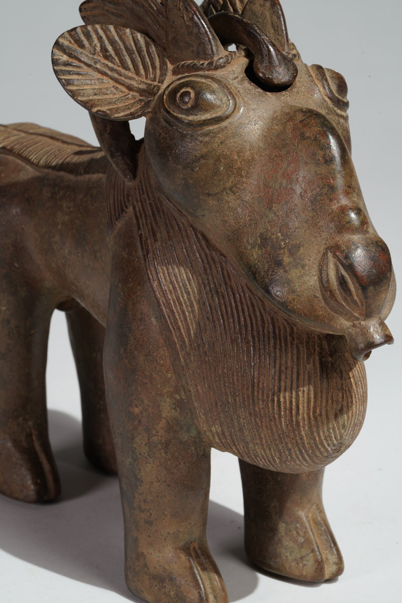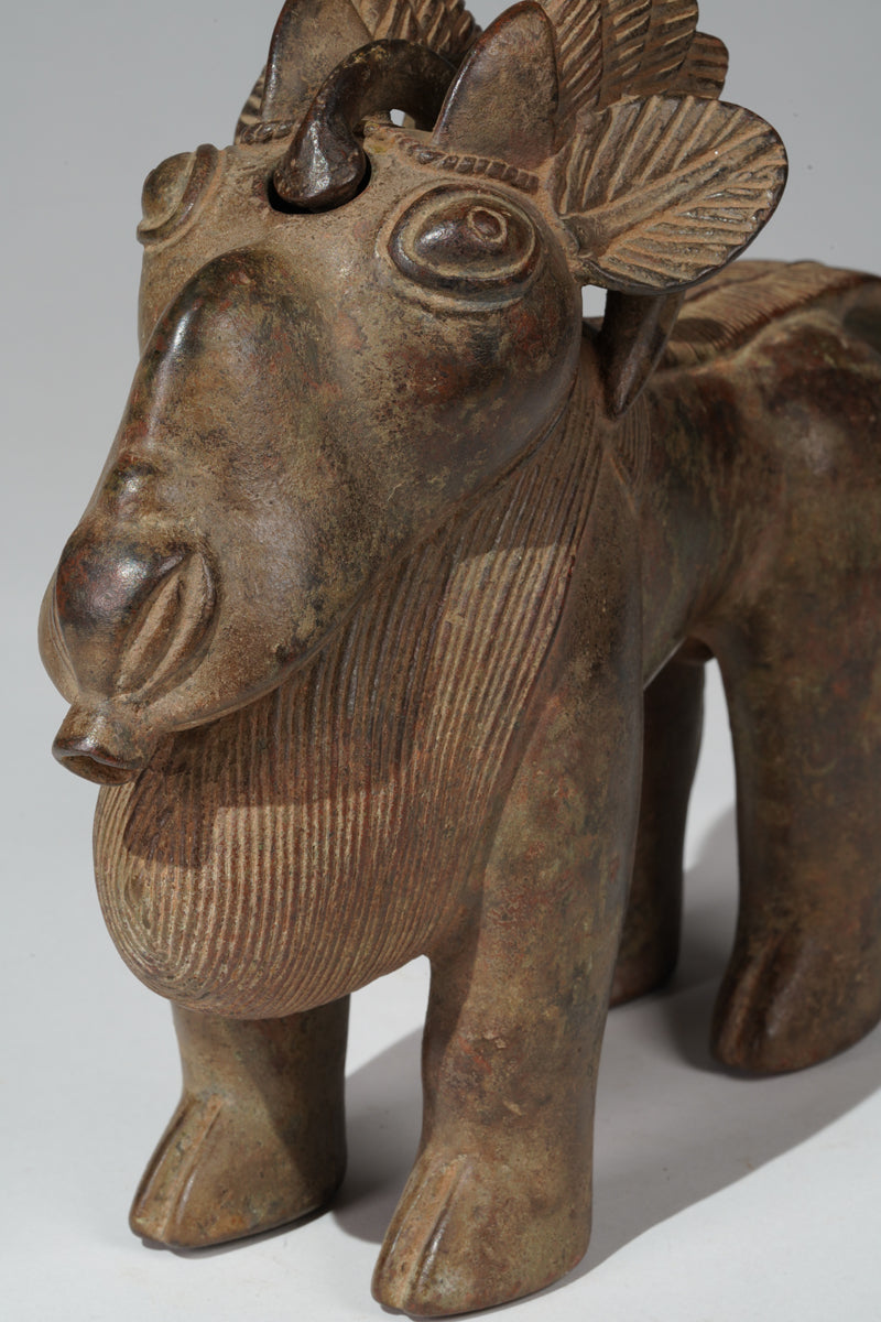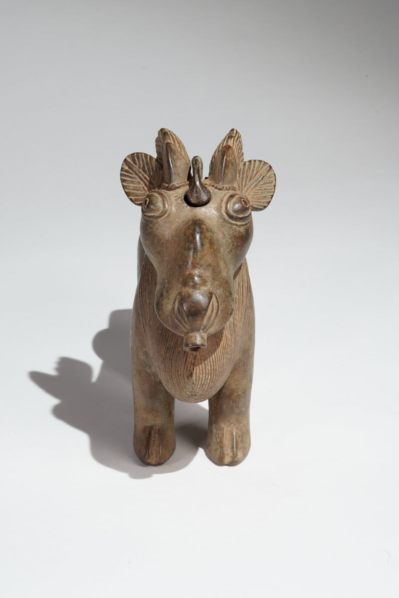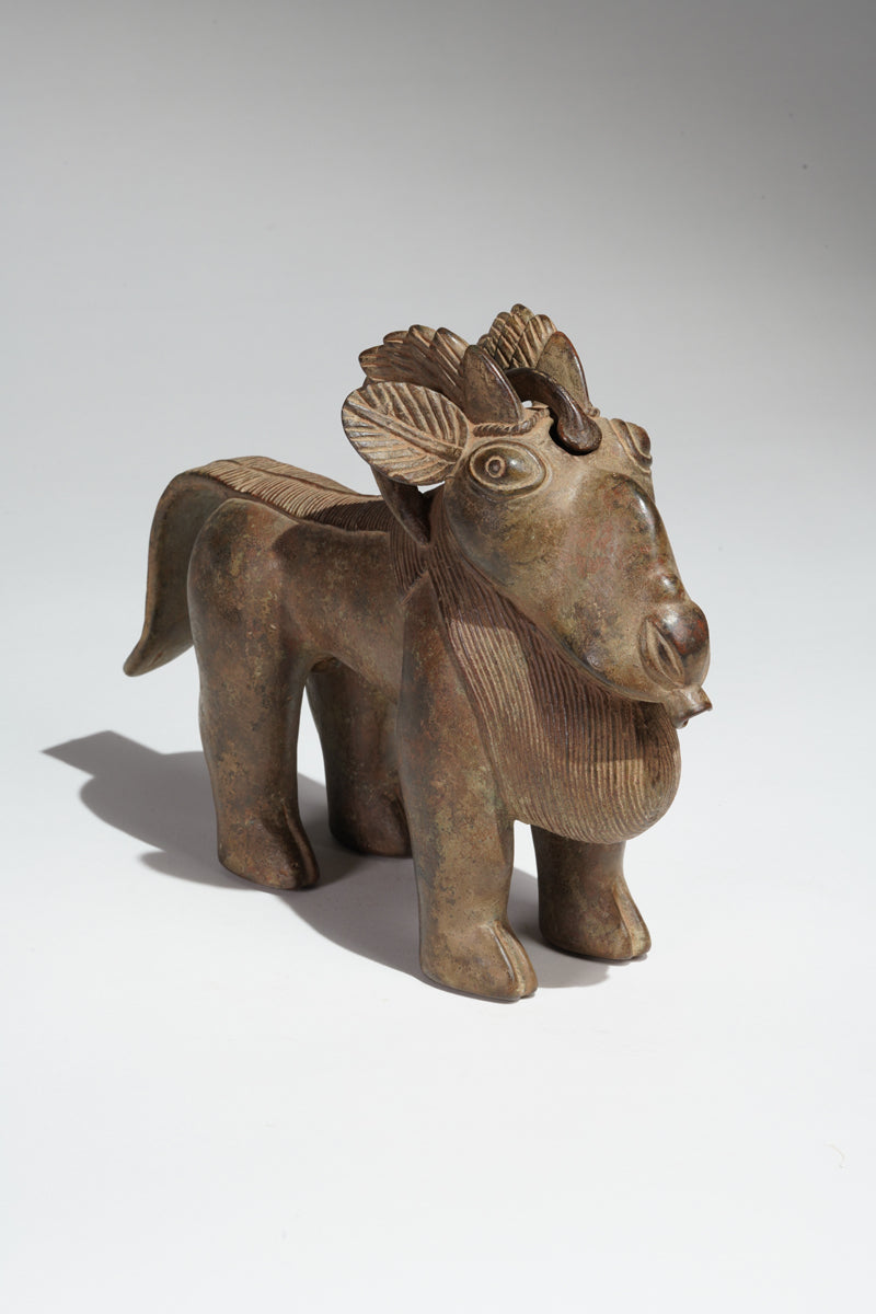 Kingdom of Benin, Nigeria, 16th/17th century Yellow cast iron, 34 x 44 x 14 cm The National Commission for Museums and Monuments, Nigeria, Inv. No. 53.22.2 Aquamaniles were introduced to Europe in the Middle Ages; they originated in Muslim countries, where such zoomorphic containers were used for ritual washing. They were also used liturgically in Europe, but by the 15th century they had also been integrated into secular table culture. Portuguese traders probably brought an example to the Oba of Benin as a gift, or a damaged example was brought there as scrap metal for reuse in a foundry. It is doubtful that such vessels were imported via the trans-Saharan trade, since aquamaniles are not found anywhere else in West Africa and had been abandoned in the Islamic world centuries earlier. The Oba used ram aquamanile to wash his hands during the final rites of the Ague ceremony, which was a purification ceremony associated with the new yam harvest (Curnow 1997a: 50). The ram is a symbol of masculinity in Benin; in earlier centuries, ancestral altars were decorated with wooden ram heads instead of human heads, and there were also bronze ram pendants. The specific significance of the ram in the Ague ceremony is unclear, as it is only one of several animals sacrificed during the festival. Rams also represent perseverance. They are occasionally identified with Okhuaihe, a deified hero in Benin who is associated with Oba Ewuare, who first celebrated Ague as a ceremony in the 15th century. Although Okhuaihe has no obvious connection to these rituals, this idea cannot be ruled out from the outset, as changes may have been made over time. The British Museum has a nearly identical vessel with a hole in the side, which may have made it necessary to cast the piece in Lagos. Dark (1960: 56) initially dated the ram in the British Museum to the 18th century, Fagg (1963a: note to Fig. 45) placed it in the 16th to 17th century; later Dark (1973:91) suggested the 17th century for the Lagos example. Neither of them had any evidence for the dating. What is certain is that two pieces do not show the overly elaborate surface decoration of the 18th century examples. They may be works from the 16th century: that was when Oba Esigie developed Ague into an important festival, and the naturalistic depiction (except for the stylized eyes and leaf-like ears) is appropriate for that period. No other ram aquamaniles are known, but the Benin Museum has a pair of simple, decidedly more abstracted bronze ram statues that are only slightly smaller.