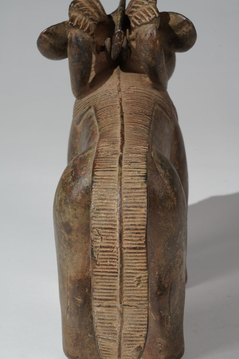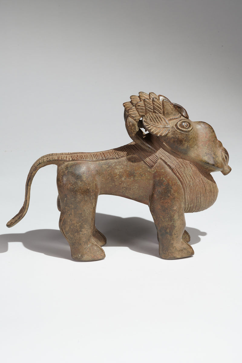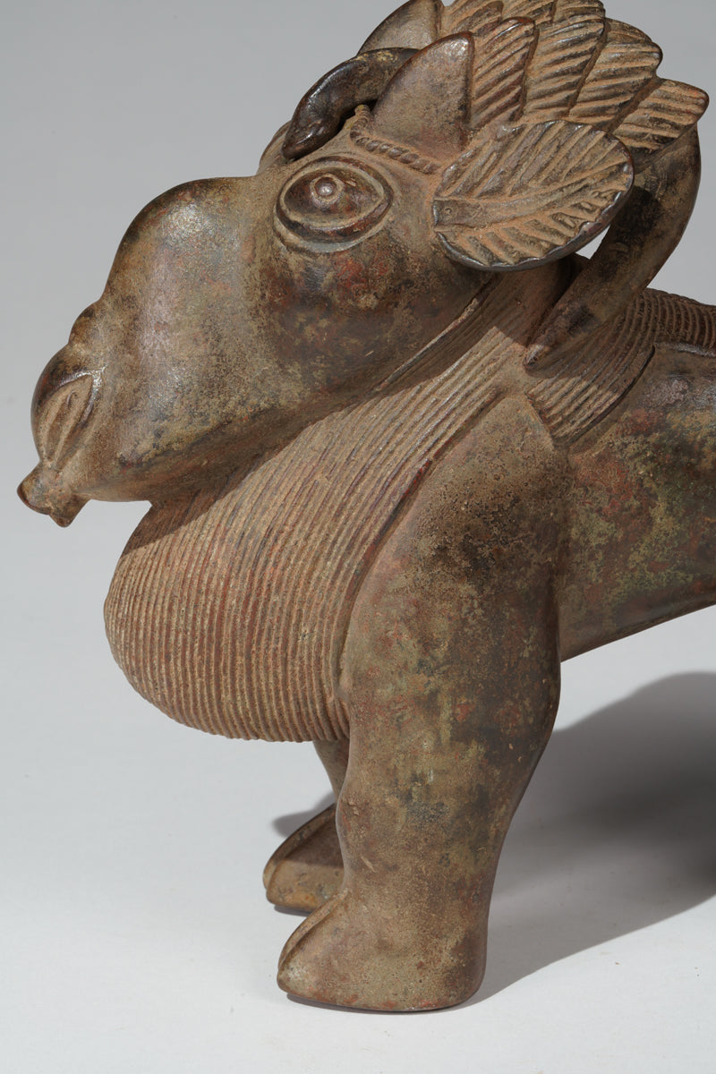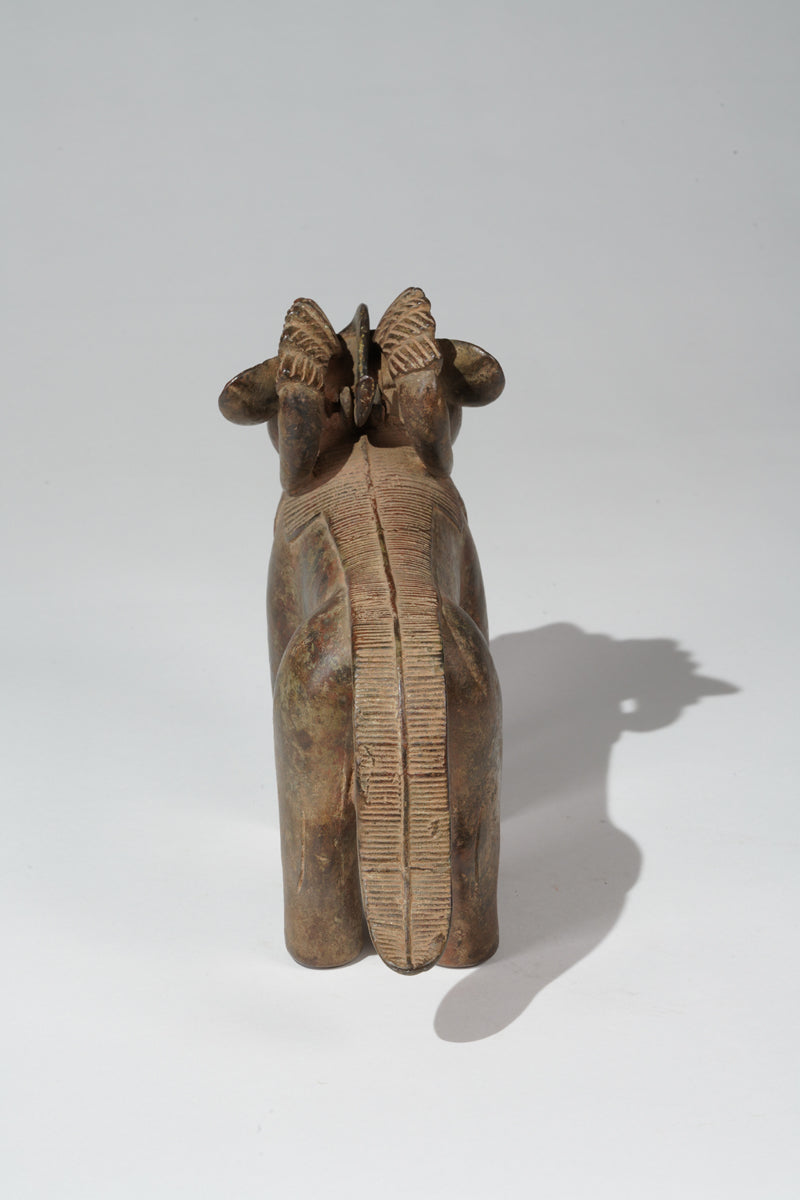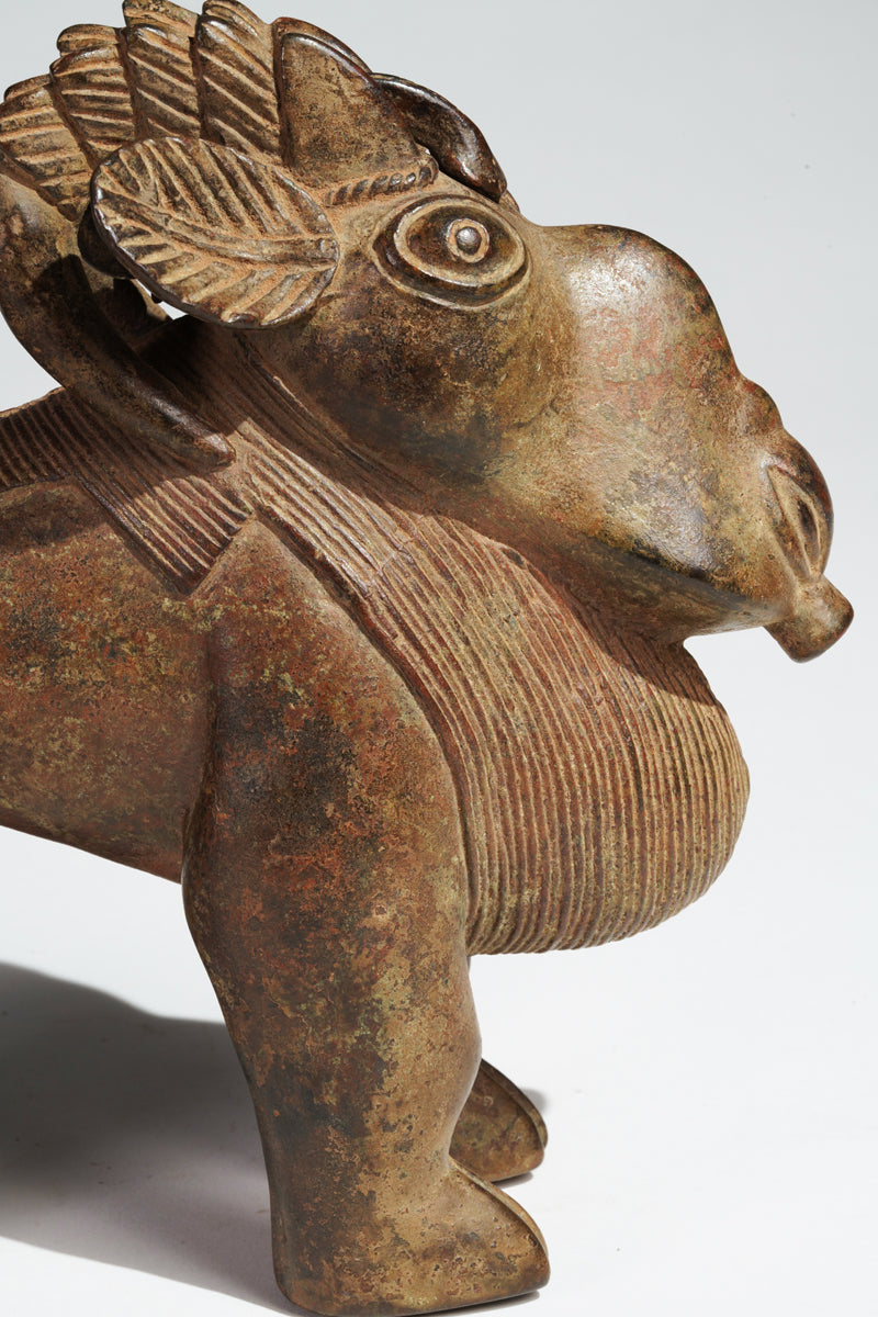 Kingdom of Benin, Nigeria, 16th/17th century Yellow cast iron, 34 x 44 x 14 cm The National Commission for Museums and Monuments, Nigeria, Inv. No. 53.22.2 Aquamaniles were introduced to Europe in the Middle Ages; they originated in Muslim countries, where such zoomorphic containers were used for ritual washing. They were also used liturgically in Europe, but by the 15th century they had also been integrated into secular table culture. Portuguese traders probably brought an example to the Oba of Benin as a gift, or a damaged example was brought there as scrap metal for reuse in a foundry. It is doubtful that such vessels were imported via the trans-Saharan trade, since aquamaniles are not found anywhere else in West Africa and had been abandoned in the Islamic world centuries earlier. The Oba used ram aquamanile to wash his hands during the final rites of the Ague ceremony, which was a purification ceremony associated with the new yam harvest (Curnow 1997a: 50). The ram is a symbol of masculinity in Benin; in earlier centuries, ancestral altars were decorated with wooden ram heads instead of human heads, and there were also bronze ram pendants. The specific significance of the ram in the Ague ceremony is unclear, as it is only one of several animals sacrificed during the festival. Rams also represent perseverance. They are occasionally identified with Okhuaihe, a deified hero in Benin who is associated with Oba Ewuare, who first celebrated Ague as a ceremony in the 15th century. Although Okhuaihe has no obvious connection to these rituals, this idea cannot be ruled out from the outset, as changes may have been made over time. The British Museum has a nearly identical vessel with a hole in the side, which may have made it necessary to cast the piece in Lagos. Dark (1960: 56) initially dated the ram in the British Museum to the 18th century, Fagg (1963a: note to Fig. 45) placed it in the 16th to 17th century; later Dark (1973:91) suggested the 17th century for the Lagos example. Neither of them had any evidence for the dating. What is certain is that two pieces do not show the overly elaborate surface decoration of the 18th century examples. They may be works from the 16th century: that was when Oba Esigie developed Ague into an important festival, and the naturalistic depiction (except for the stylized eyes and leaf-like ears) is appropriate for that period. No other ram aquamaniles are known, but the Benin Museum has a pair of simple, decidedly more abstracted bronze ram statues that are only slightly smaller.