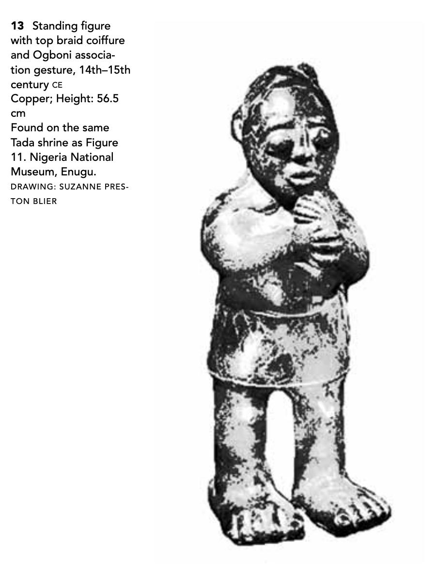 Until recently this pice was kept in a shrine in the Nupe village of Tada on the river Niger 192 km north of Ife, where the villagers took it downto the riverevery Friday and scrubbed it with river gravel to ebsure the fertility of their wives and of the fish on which they live.. This accounts for its smoothed appearance , Bernard Faggpersuaded the villagers thar they were destroying the sculpture and with it the fertiliy they were trying to promote...