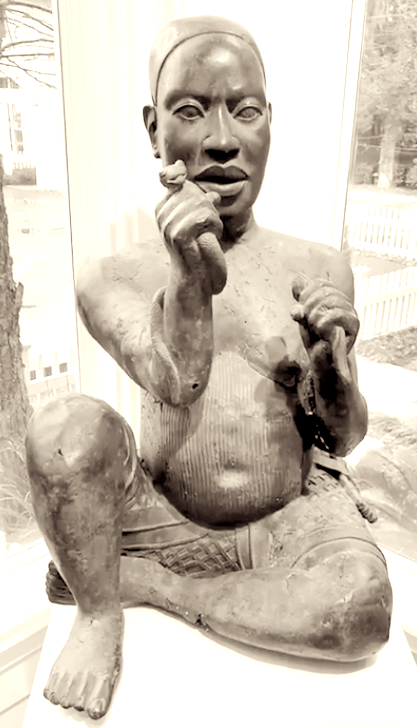 The second group consists of only the seated figure shown here, perhaps the most important naturalistic sculpture in Black Africa. Two other more recent-looking figures make up the third group, while the figures of two ostriches and an elephant form the fourth group. The male Jebba Gara figure better known as the Jebba Bowman and the Tada Gara male figure are believed to bear resemblance to Benin works because of the diadems on their foreheads which depict faces with snakes issuing from their nostrils, a common feature in Benin works. The Tada seated figure seems, in its naturalism and rigidity, to belong to the Ife school. The two more recent looking figures from Tada have a combination of Yoruba and Benin traits while the ostriches and the elephant belong to a yet unidentified school. So, here we find at least four traditions of sculpture in bronze and their coming together suggests that they were accidentally assembled.