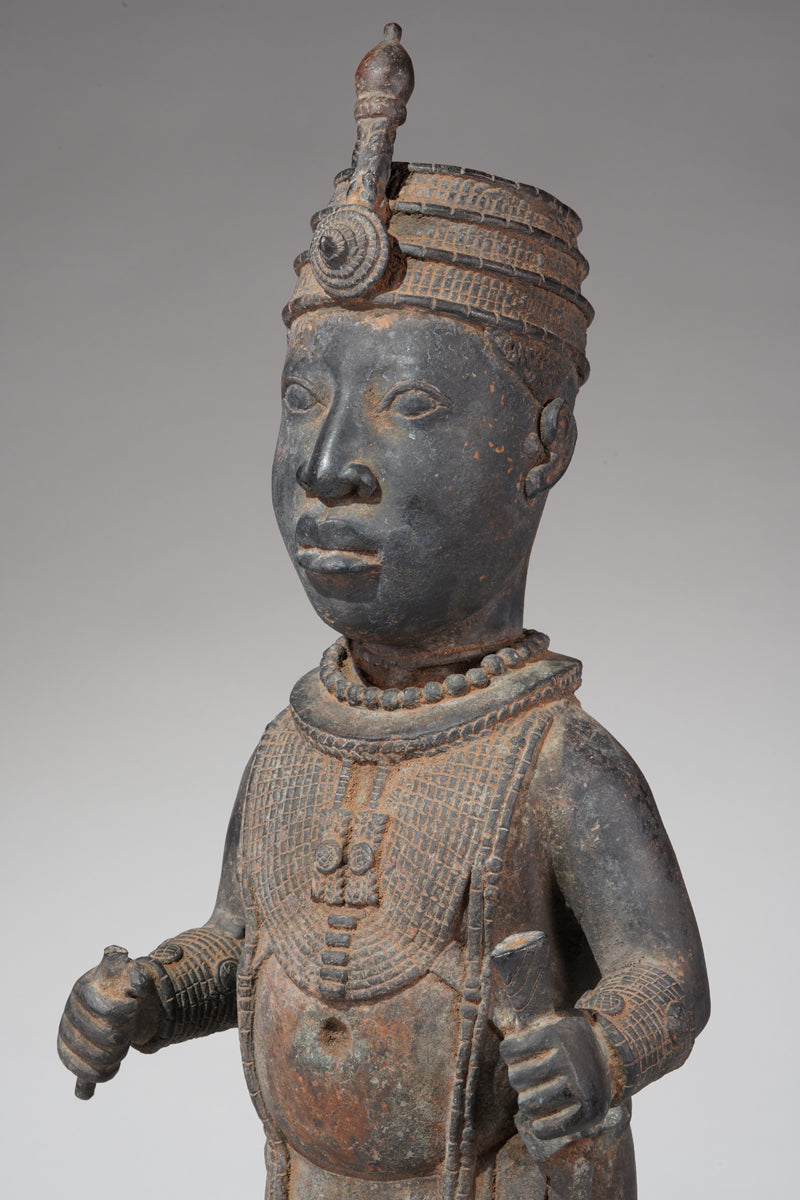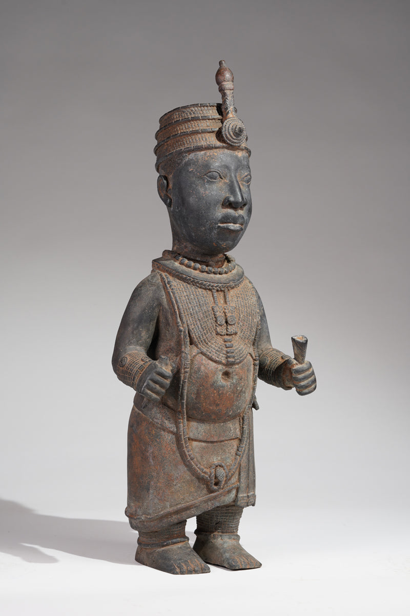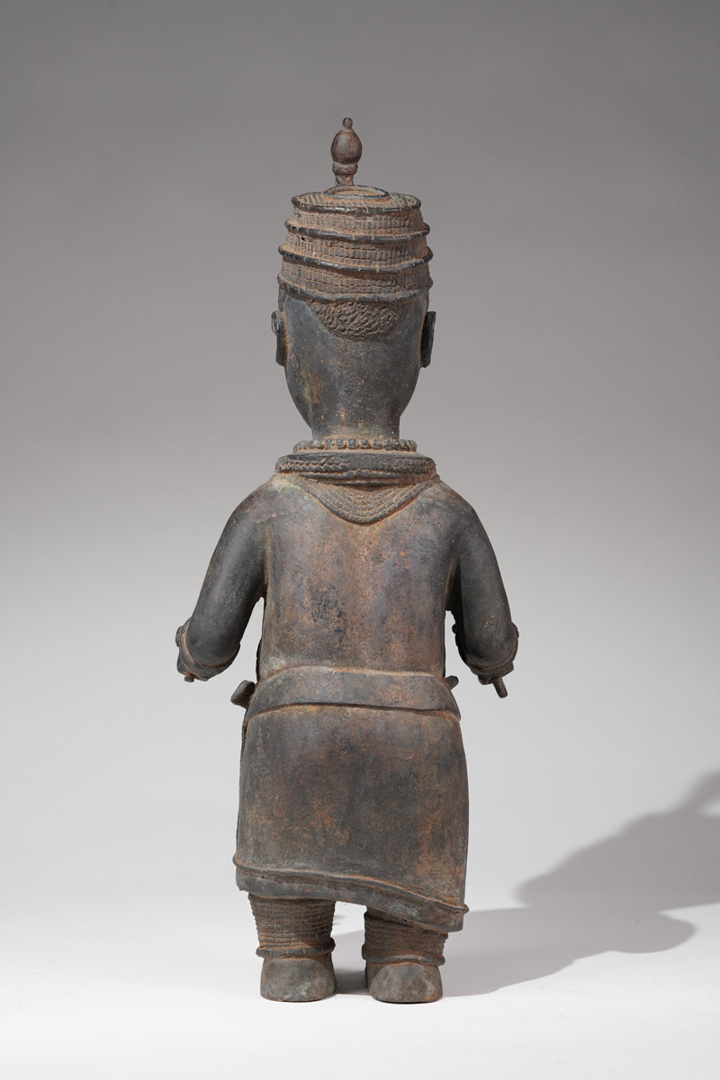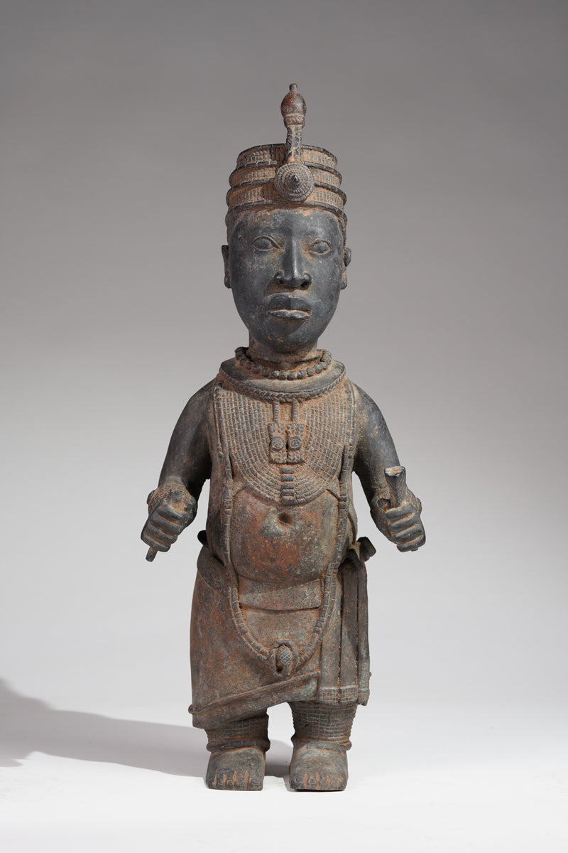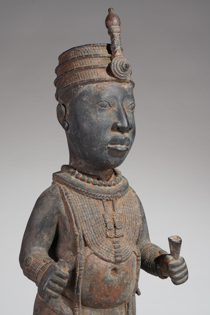 A bronze sculpture of an Ooni (Oba), in the style of Ife, Nigeria who shows the traditional signs of dignity that the king wore during the classical period: a crown, a heavy pearl necklace around the neck, another chain hanging from the neck to the knees and a net of fine strings of pearls with two knots in the middle covering the naked chest. In his left hand he's holding a sign of authority representing once a ram's horn filled with magical substances called "ashe" (exists only fragmentary) and in his right hand a sceptre whose archetype is made of pearls and cloth, both symbols of his authority and power. He also wears wide bracelets around his wrists. He has got a small, gently bulging belly. His robe, over which his belly bulges has a sloping hem. The face is ovoid and full and very even with an expression of calm serenity and quiet dignity. The head of this figure measures more than a quarter of the figures´ length, a proportion that is particularly characteristic of West African sculpture; a bronze with many different layers of oxidations.